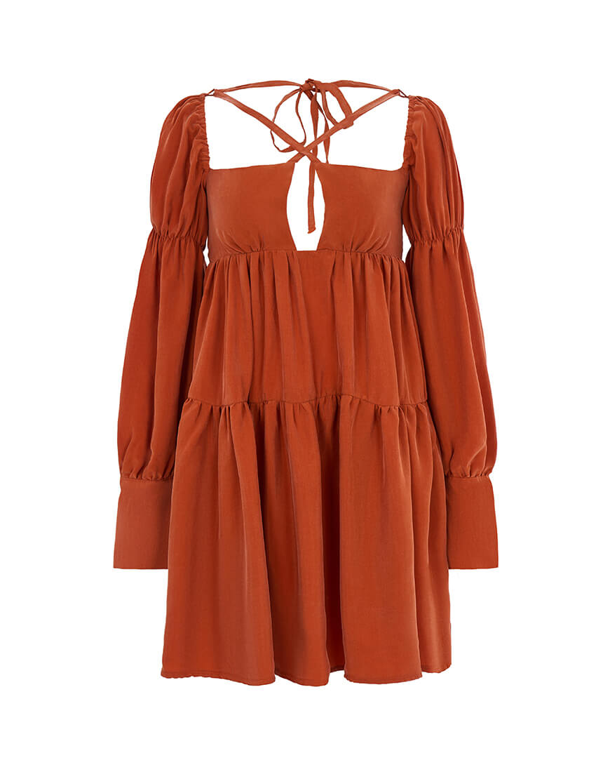 Сукня середньої довжини з ярусною спідницею. Присутній ефектний рельєфний рукав, доповнений зав’язками, неймовірний виріз на грудях додає сукні романтичності. Сукня має бретелі, які зав’язуються ззаду.