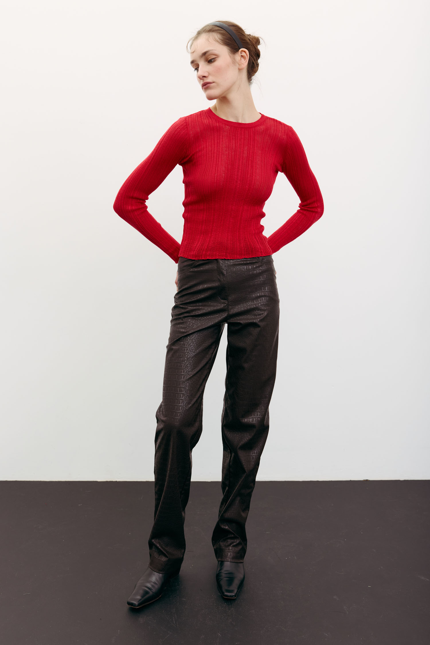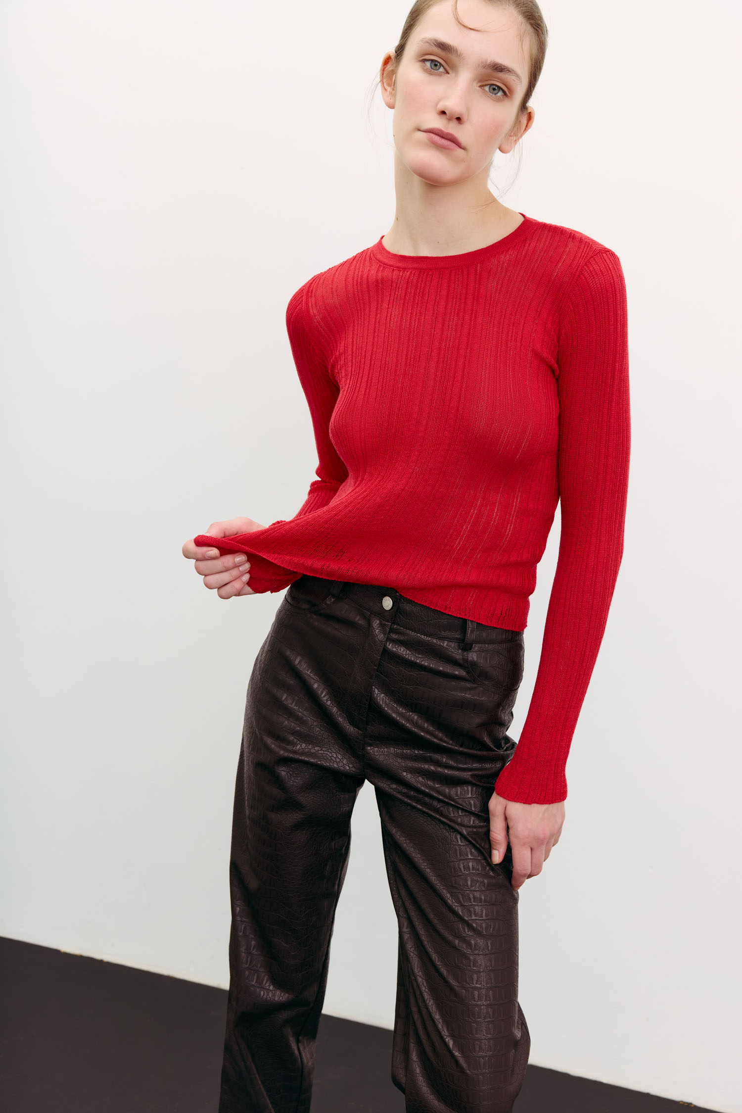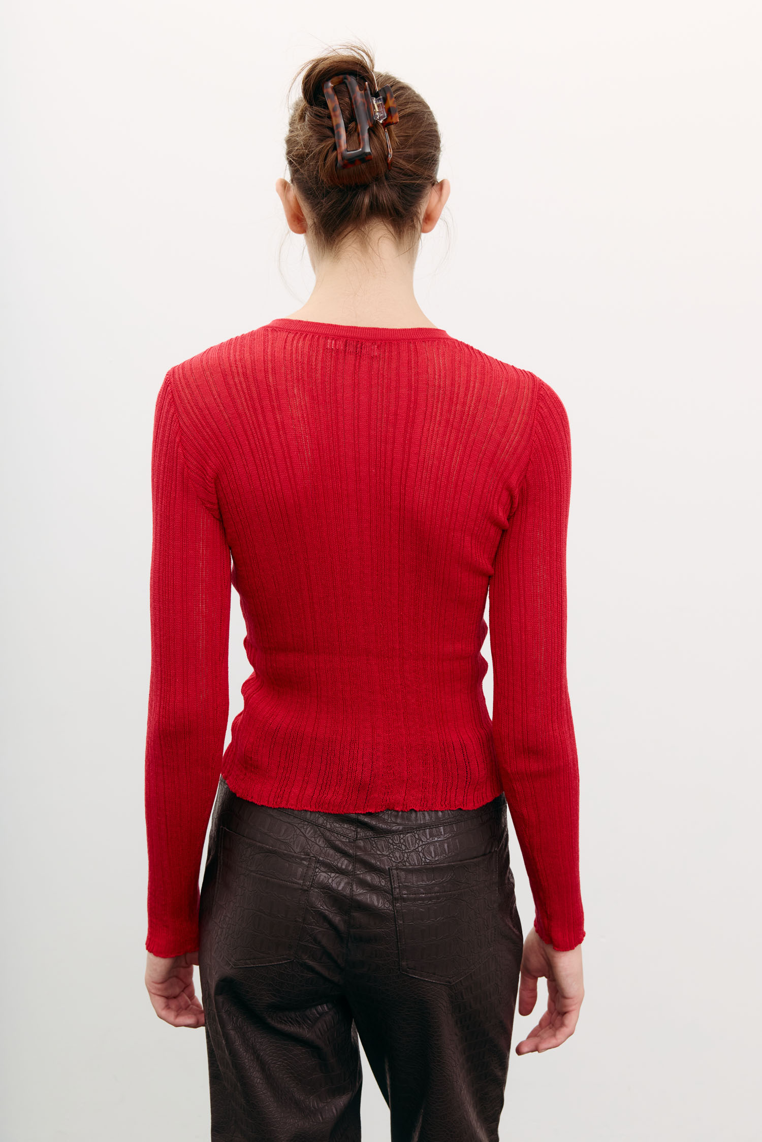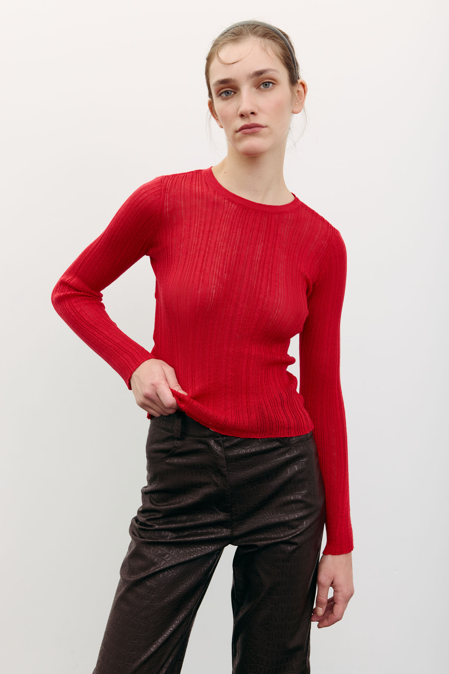 Напівпрозорий жіночий джемпер червоного кольору з рельєфною в’язкою.