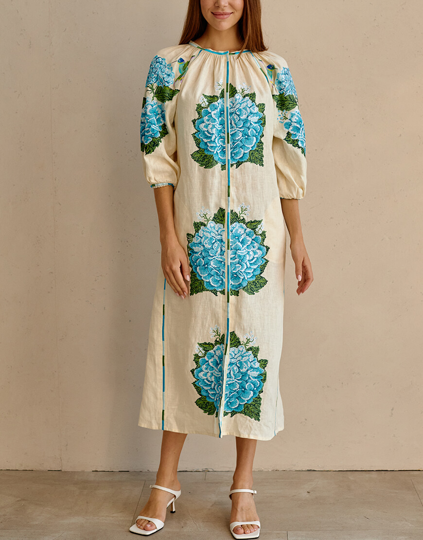 Доставка впродовж 2-5 робочих днівСукня довга з поясом, прямого крою, з малюнком квітів “Гортензії”