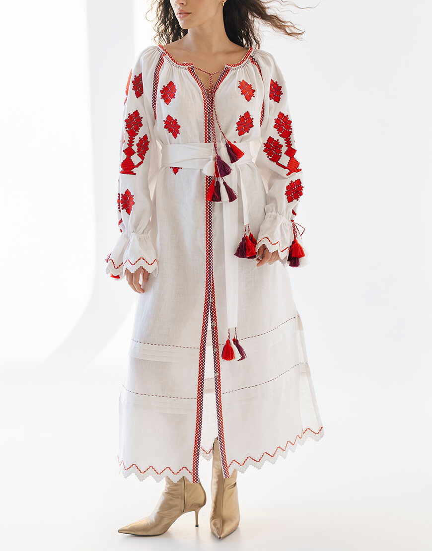 На рукавах вишиванки деталізована вишивка червоними нитками в традиційних кролевецьких мотивах. В комплекті йде пояс, що підкреслює силует та стилізує ваш образ.