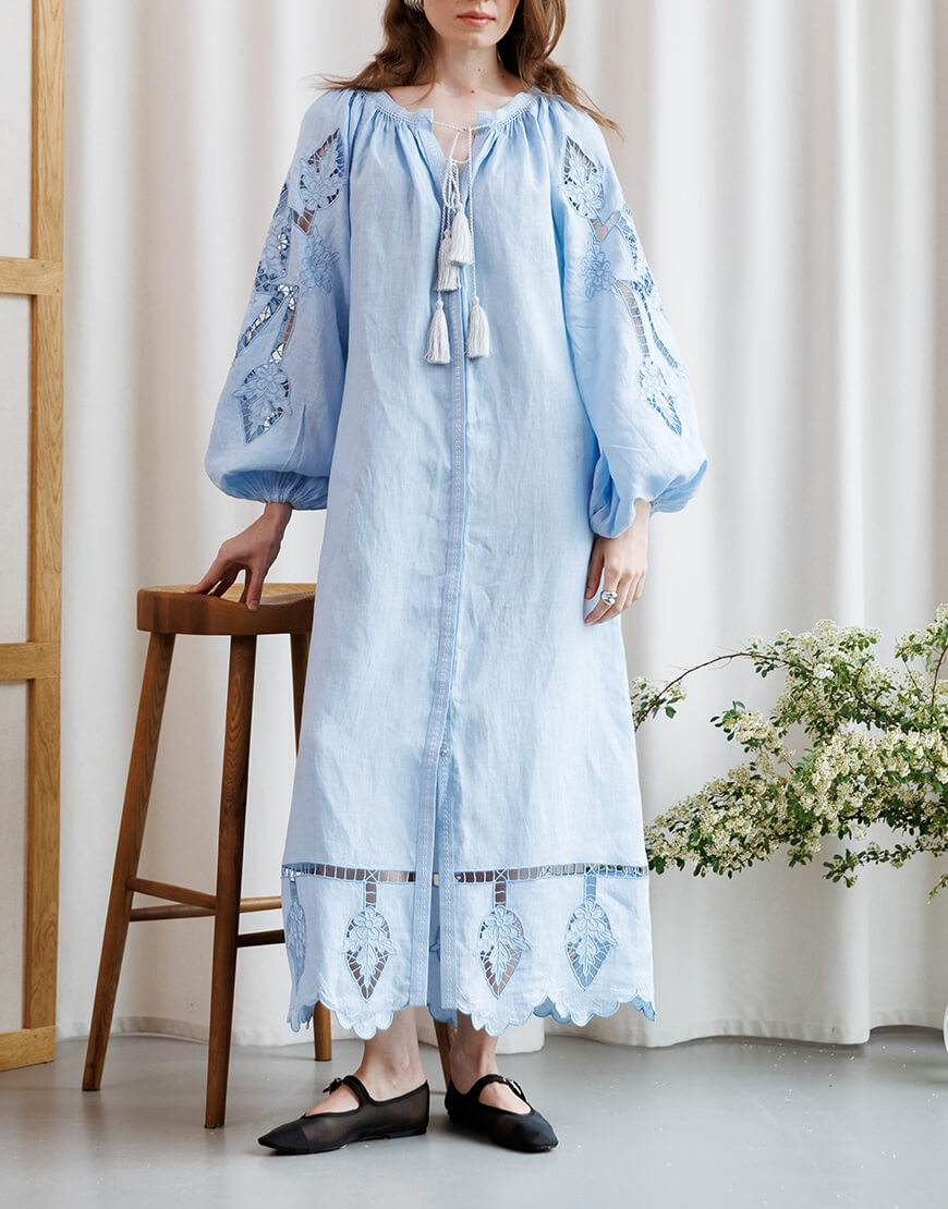 Сукня з об’ємними рукавами, прикрашеними вишивкою голубими нитками у техніці “Рішельє”