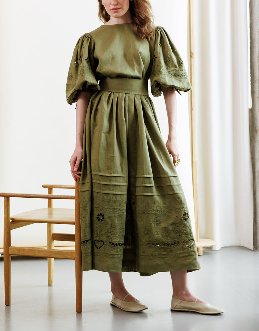 Вишивка виконана у тон з сукнею, оливковими нитками. Це додає глибини та виразності з акцентами на рукавах та спідниці.