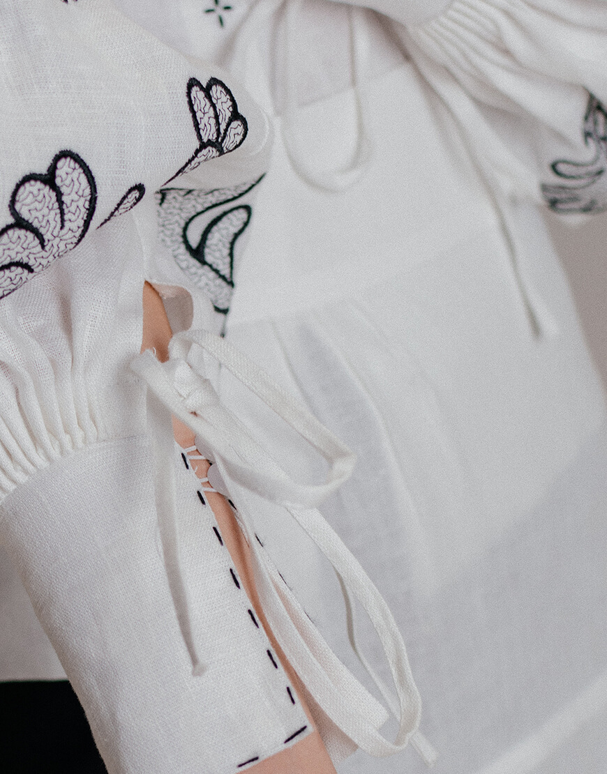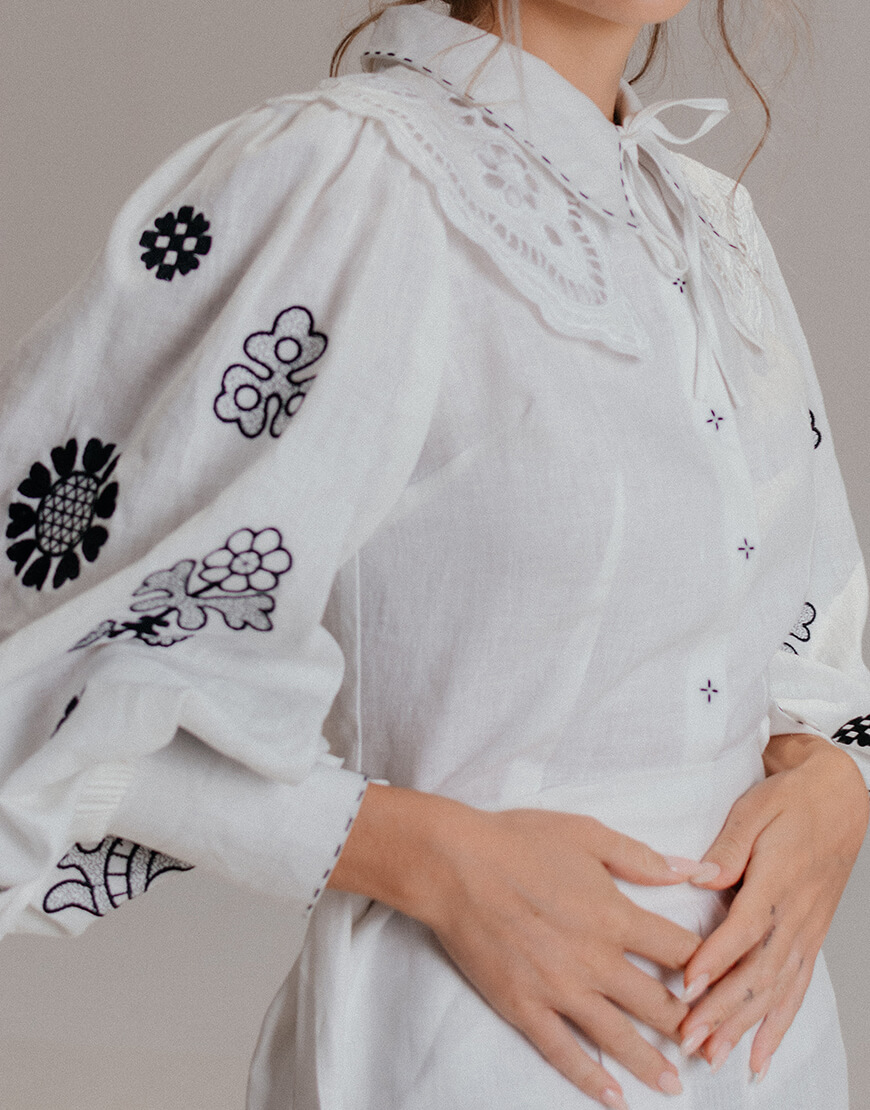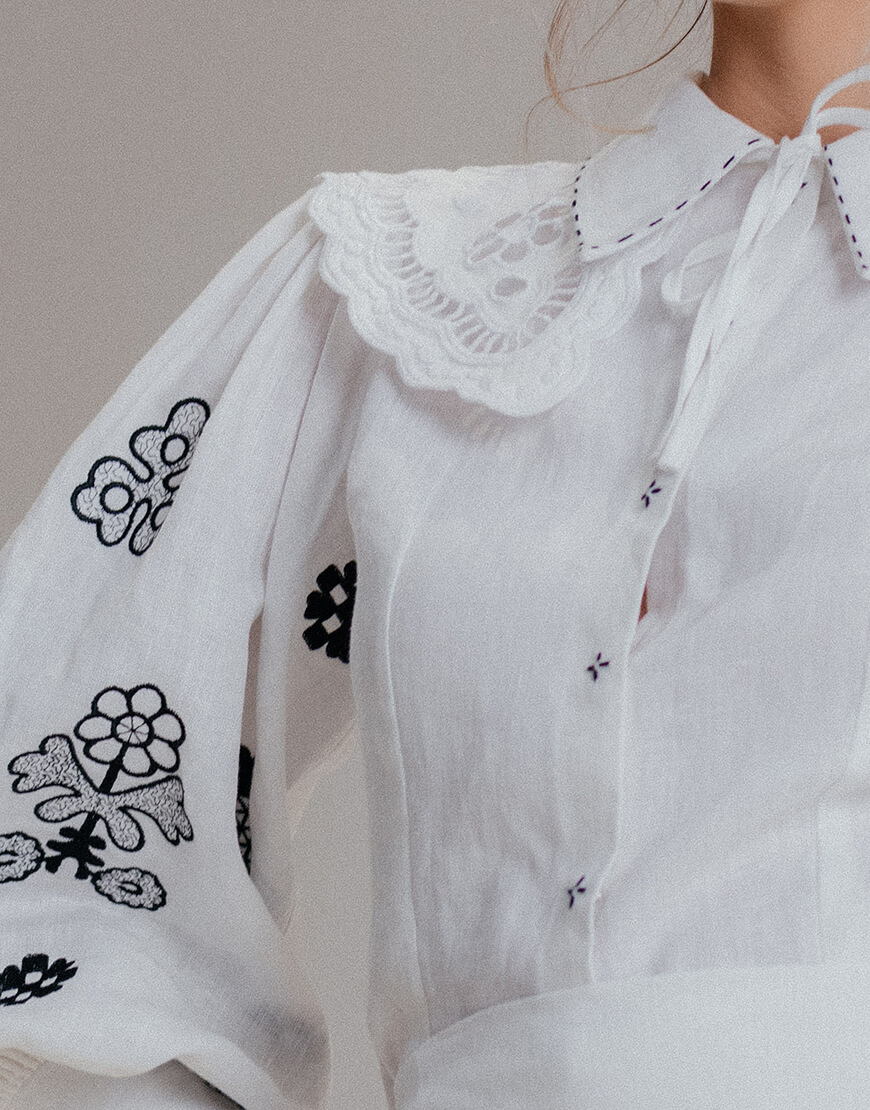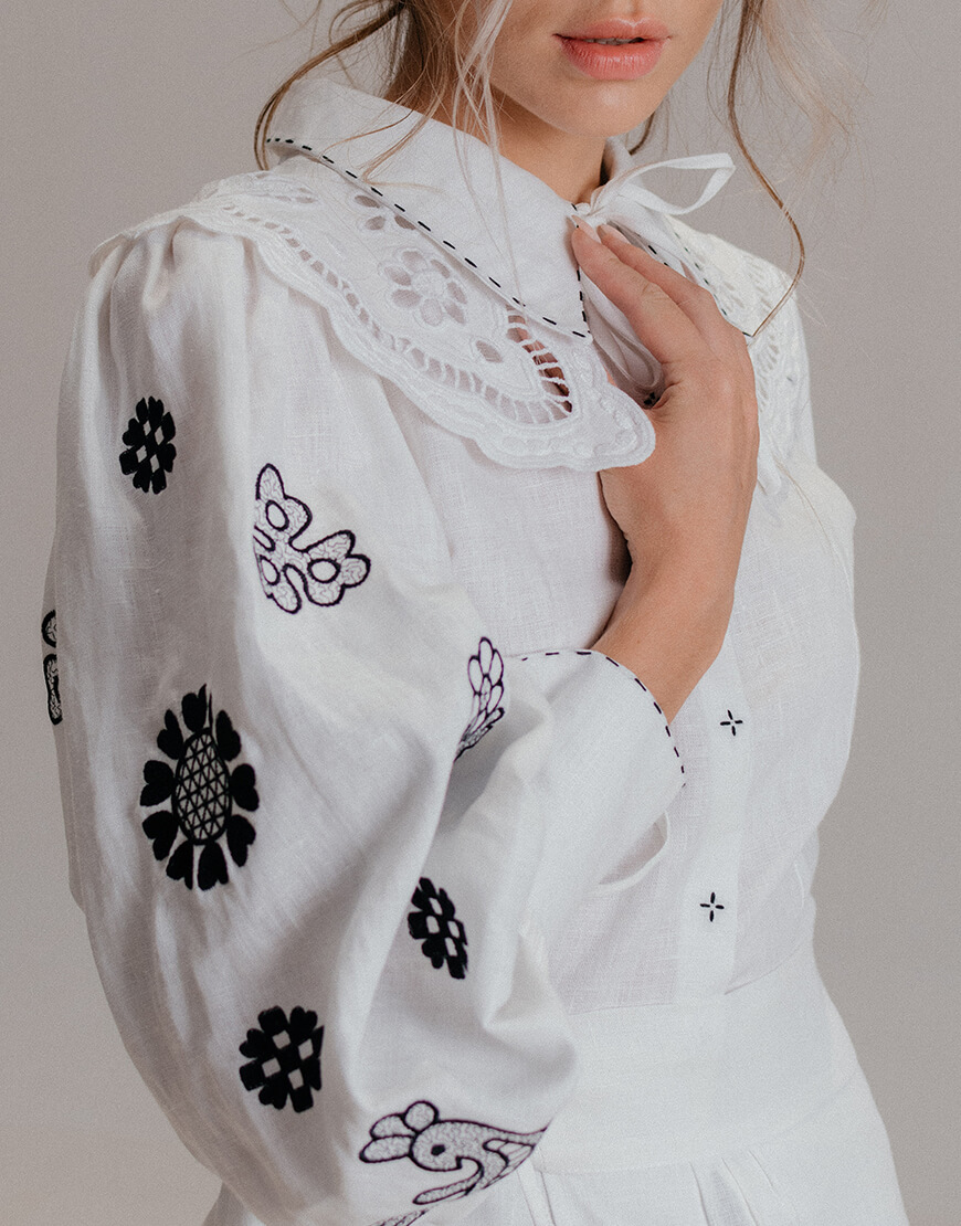 Доставка впродовж 2-5 робочих днівЖіноча блуза Ярослава зі 100% льону у білому кольорі з чорною вишивкою. Має довгий рукав та класичний комір.