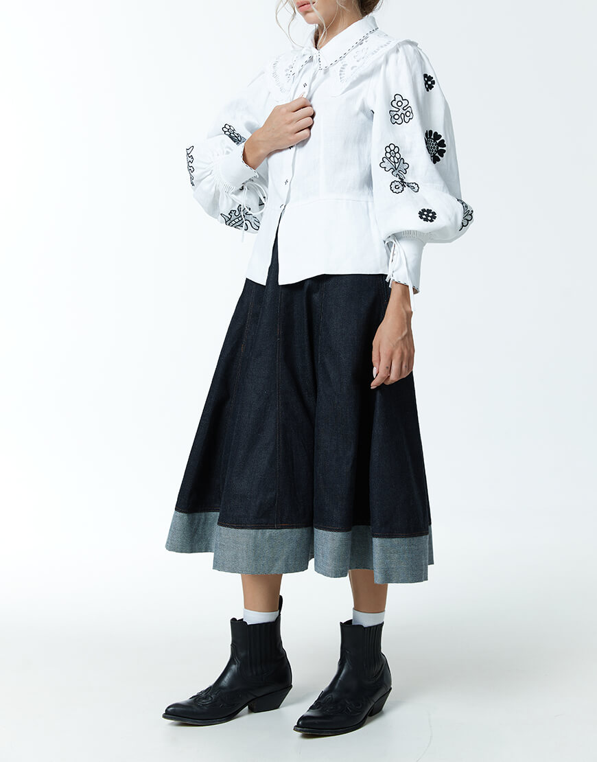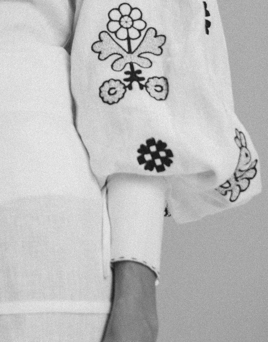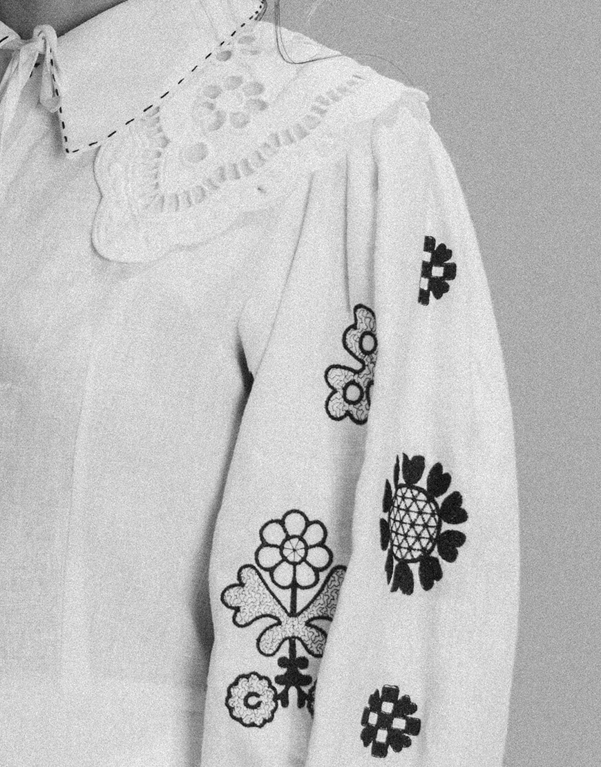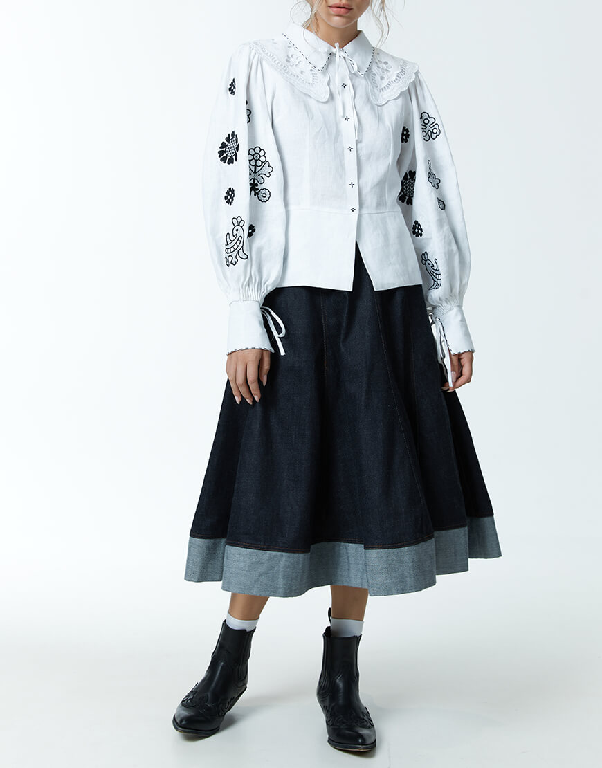 Доставка впродовж 2-5 робочих днівЖіноча блуза Ярослава зі 100% льону у білому кольорі з чорною вишивкою. Має довгий рукав та класичний комір.