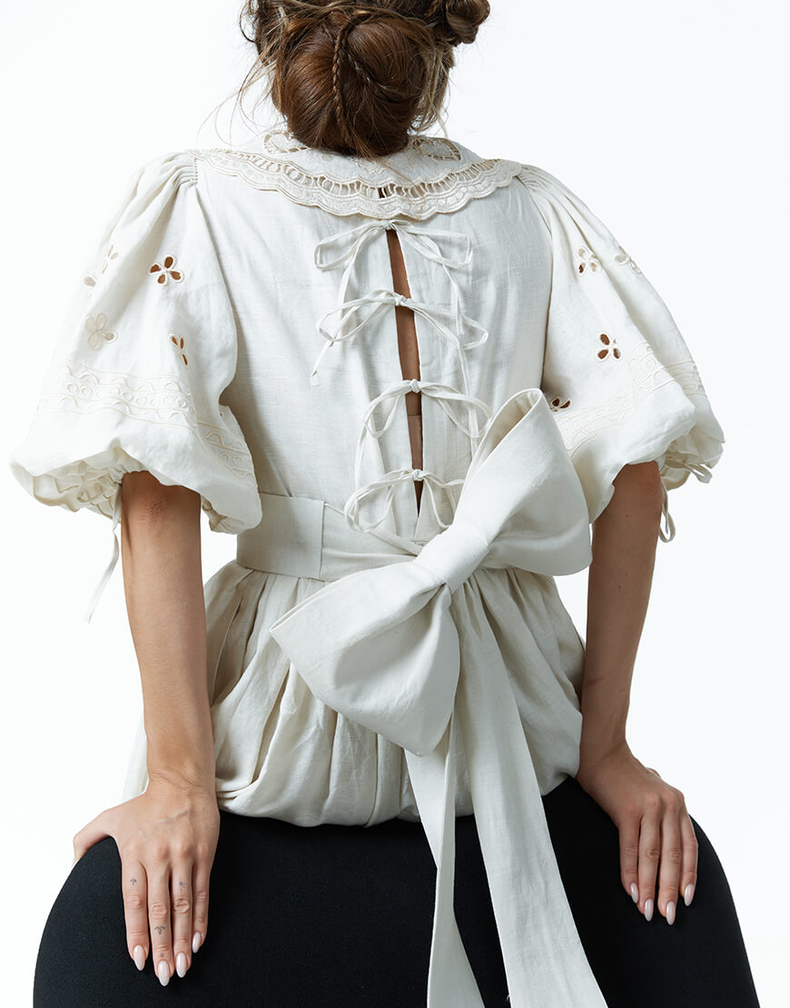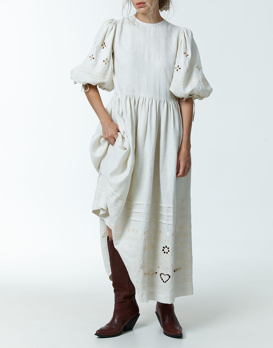 Доставка впродовж 2-5 робочих днівСукня Ярина з потаємними кишенями у кремовому кольорі з натурального льону. Вишивка виконана у техніці Рішельє.