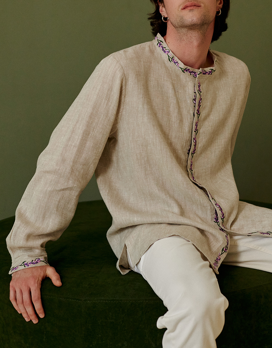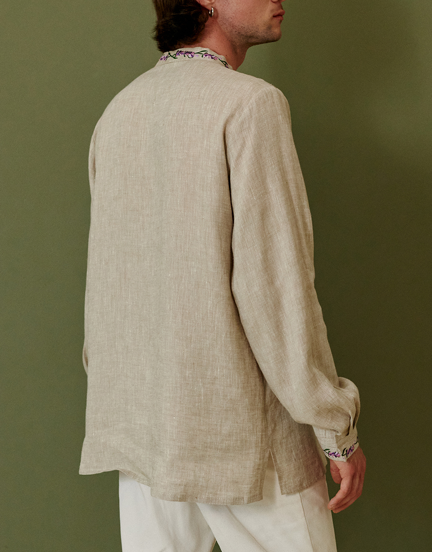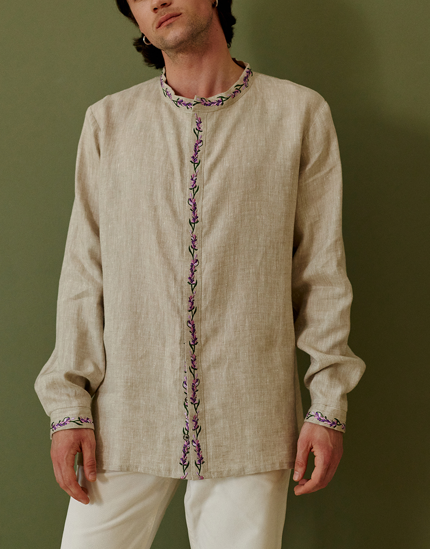 Доставка впродовж 2-5 робочих днівЧоловіча вишиванка натурального кольору виготовлена з якісного льону, що забезпечує комфорт та довговічність. Вишивка машинної роботи із зображенням квітки лаванди додає моделі елегантності та підкреслює етнічний стиль. Традиційний крій з прямими лініями доповнений високим коміром-стійкою для акценту на класичному дизайні. Завдяки продуманій конструкції та використанню натуральних матеріалів вишиванка підходить для повсякденного носіння або урочистих подій.