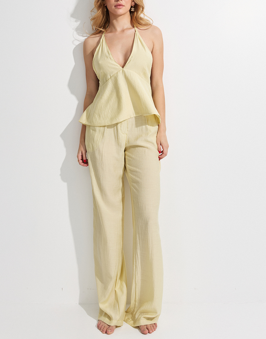 Легкий костюм у ніжному лимонному відтінку — ідеальний вибір для спекотних днів. Топ на зав’язках із відкритою спиною додає образу жіночності та легкості, а вільні штани палаццо дарують максимальний комфорт і свободу рухів.