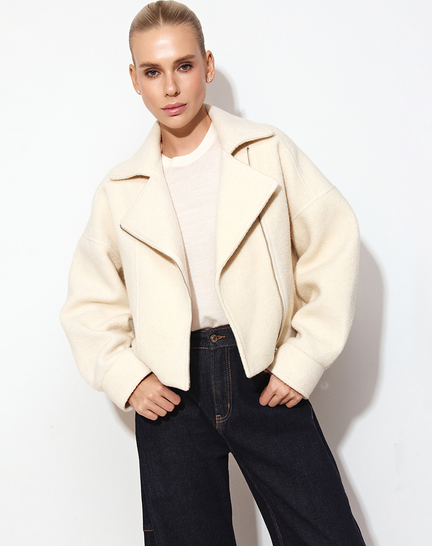 Модель з високоякісної вовни. Універсальний молочний жакет має широкі манжети, прямий крій та загострений комір.