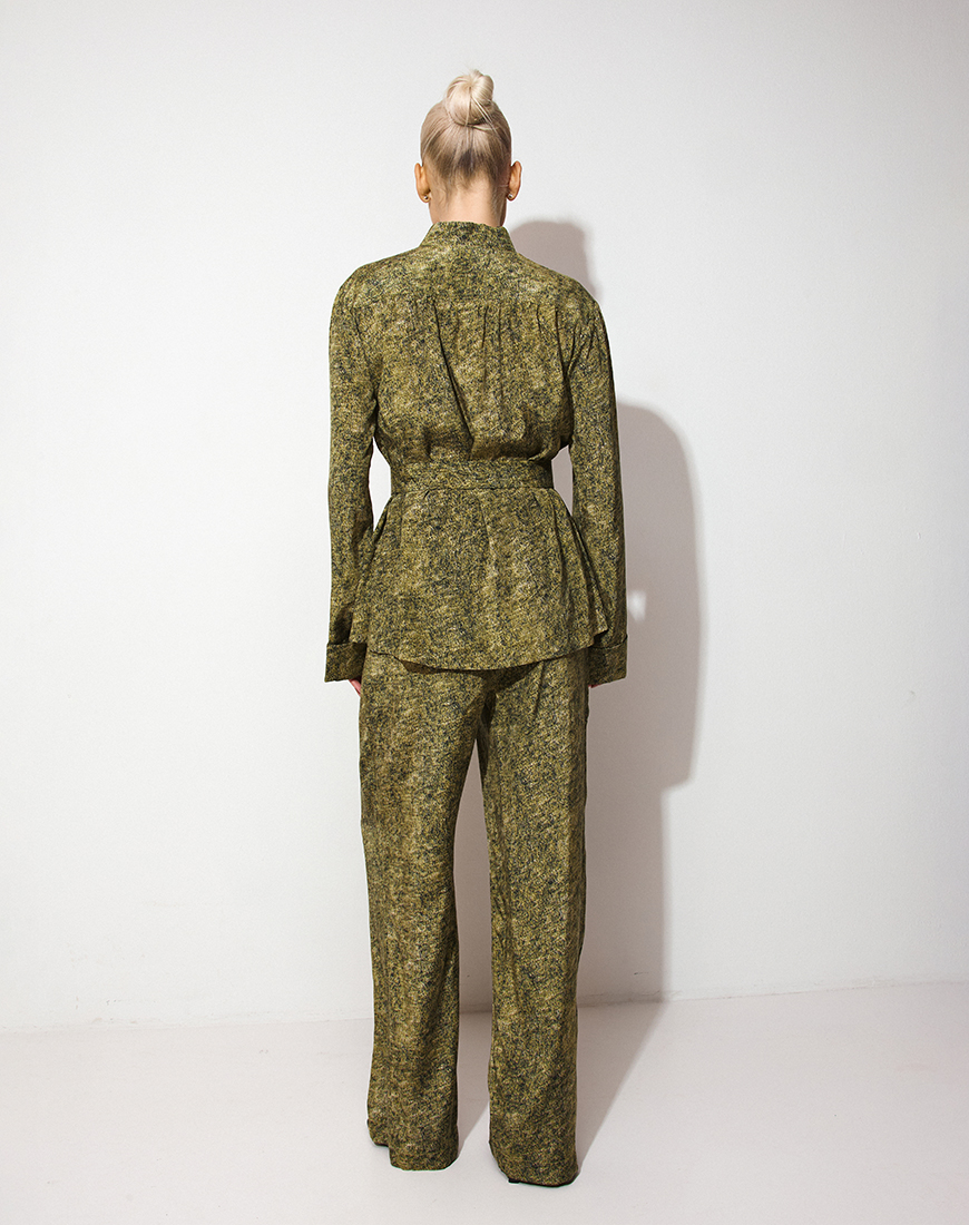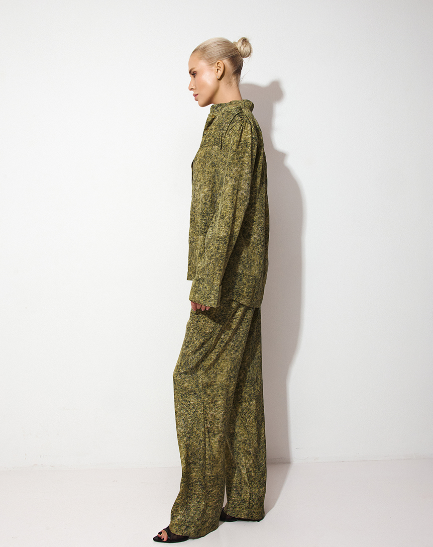 Доставка впродовж 5-7 робочих днівКостюм із легкої тканини у благородному оливково-зеленому відтінку з розмитим принтом.