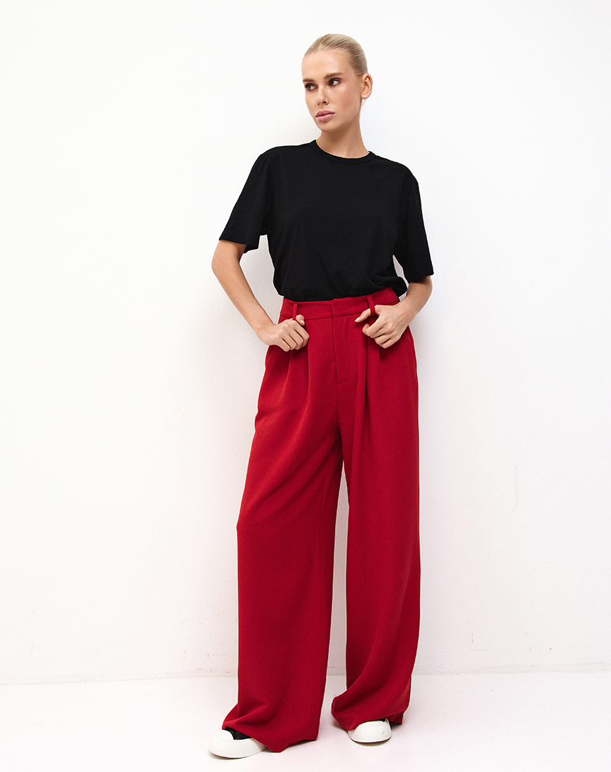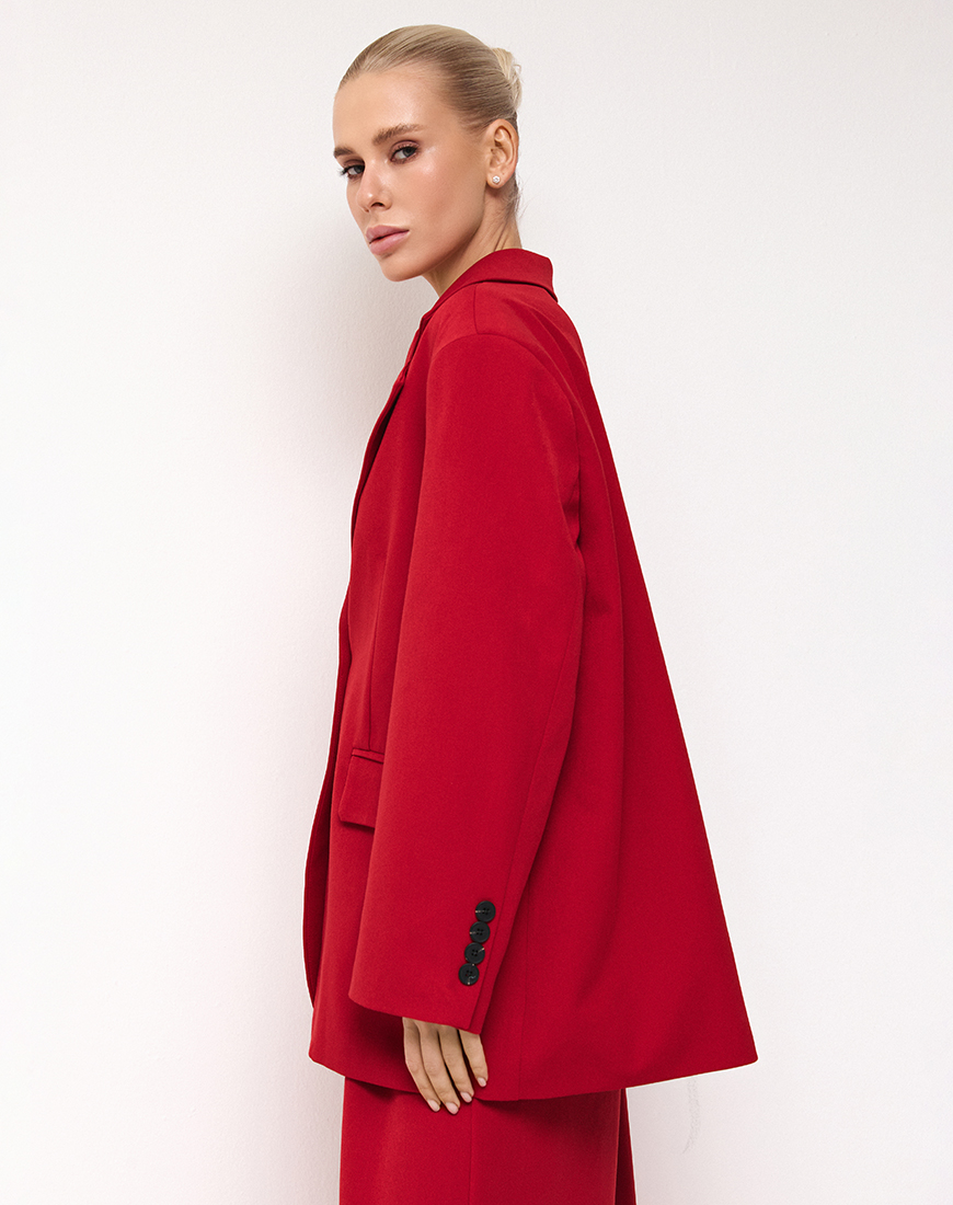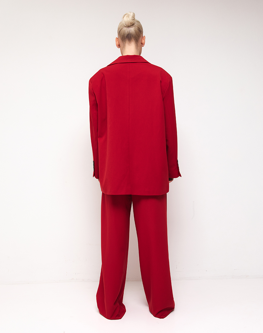 Доставка впродовж 5-7 робочих днівЧервоний костюм вільного крою – яскравий і стильний вибір для впевнених образів. Вільний силует забезпечує комфорт і свободу рухів.