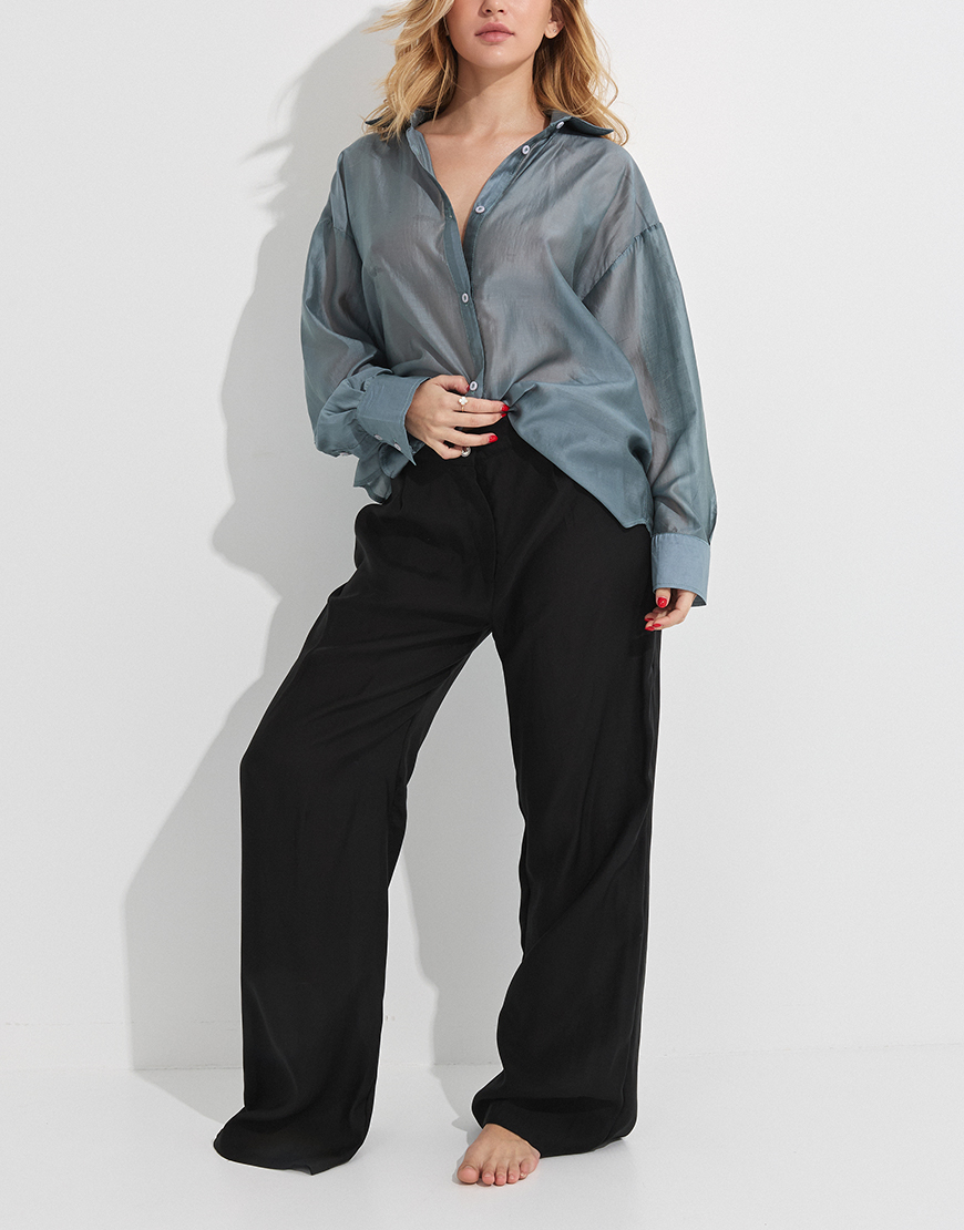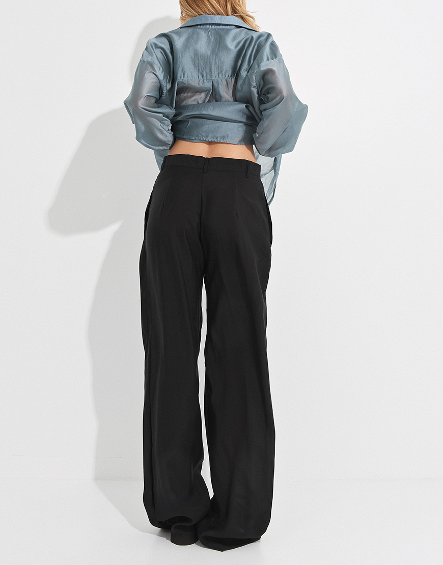 Доставка впродовж 5-7 робочих днівКласичні чорні штани із високою посадкою. Виготовлені з дуже тонкої, м’якої та приємної до тіла тканини, що не просвічується, але забезпечує максимальний комфорт у носінні. Ідеальні для теплої пори року та для офісу або міських прогулянок. На фото тканина виглядає щільнішою, ніж є насправді — у реальності вона легка та дихає.