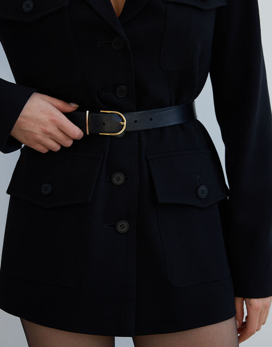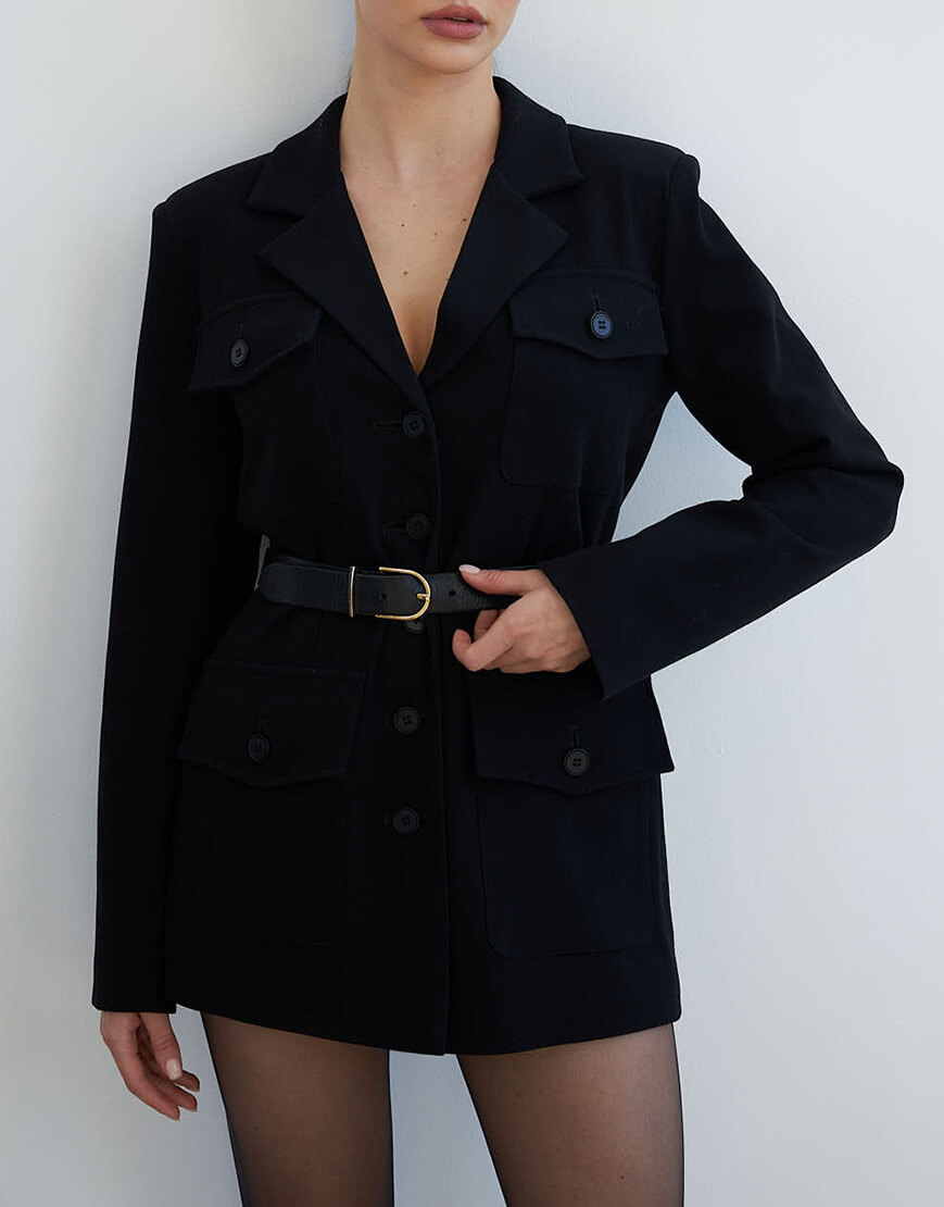 Незважаючи на те, що повернення карго трапилось ще минулого року, у сезоні 2024 року на карго тримається справжній бум. У поточній колекції Theessence одним з головних елементів став подовжений піджак-карго чорного кольору. Він чудово поєднується з базовими речами у гардеробі: джинси, легінси, штани. Завдяки подовженому силуету піджак можна вдягнути у якості міні-сукні.