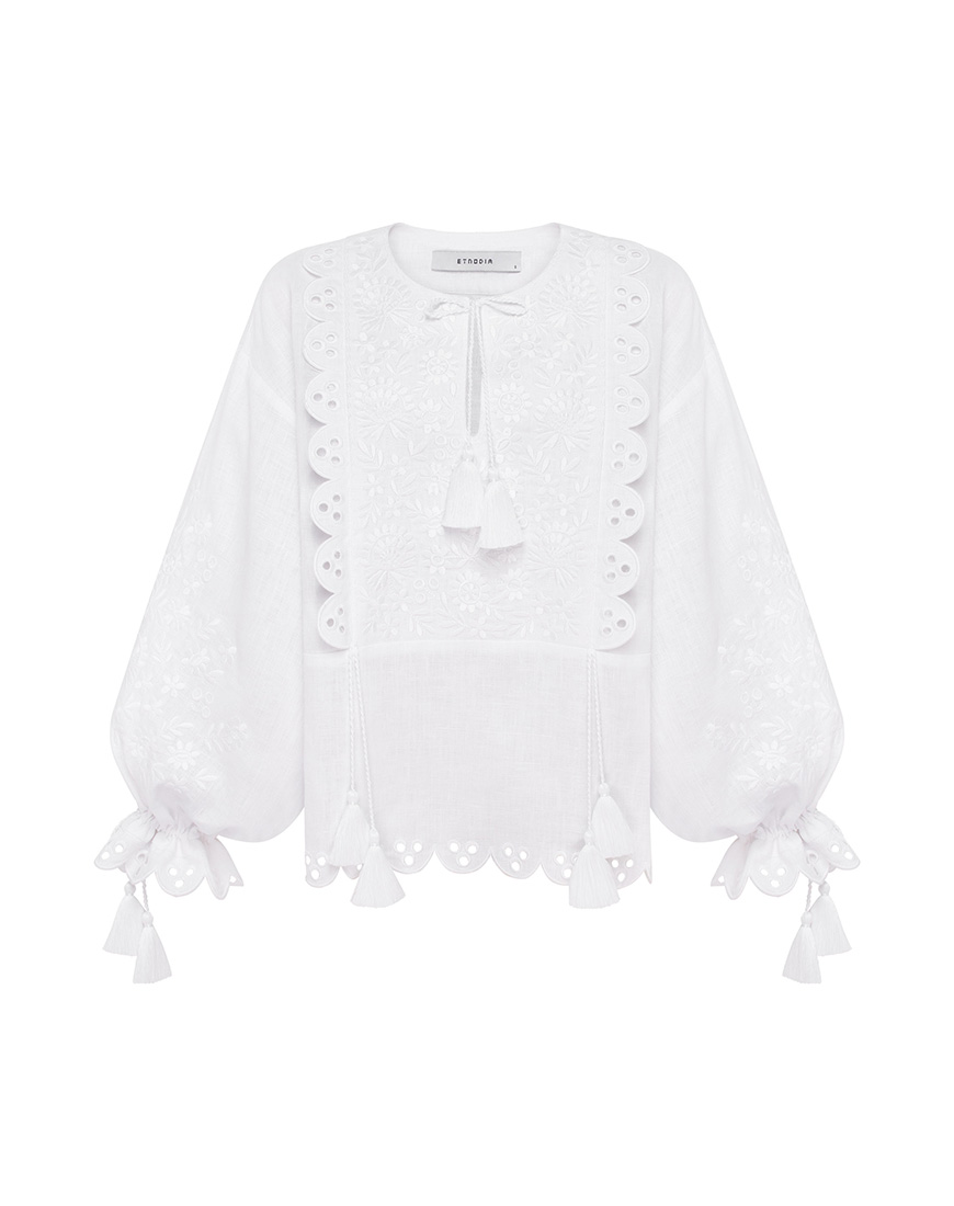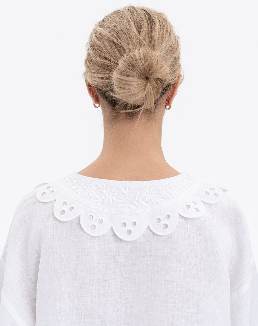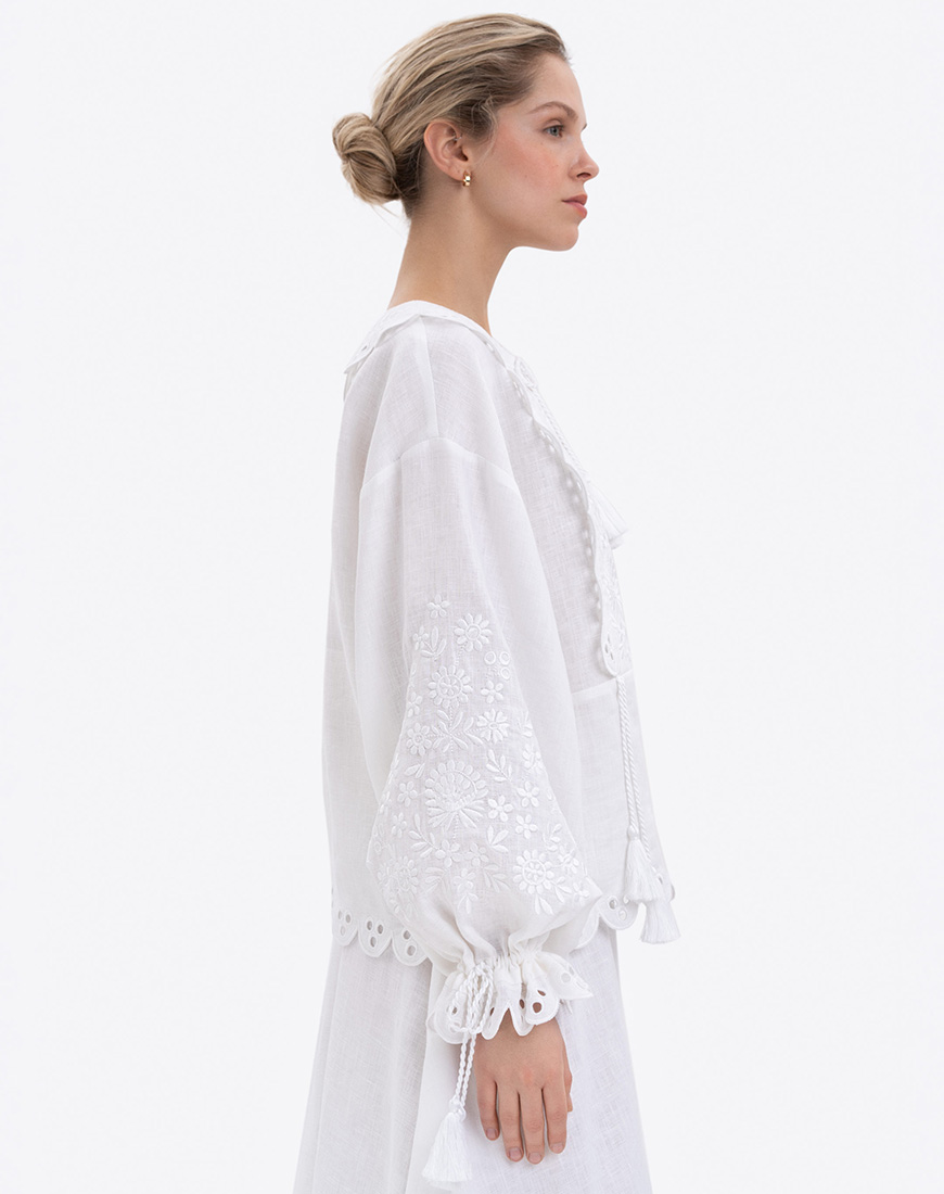 Доставка протягом 2-5 робочих днівЛляна сорочка з білою флористичною вишивкою в тон тканини.