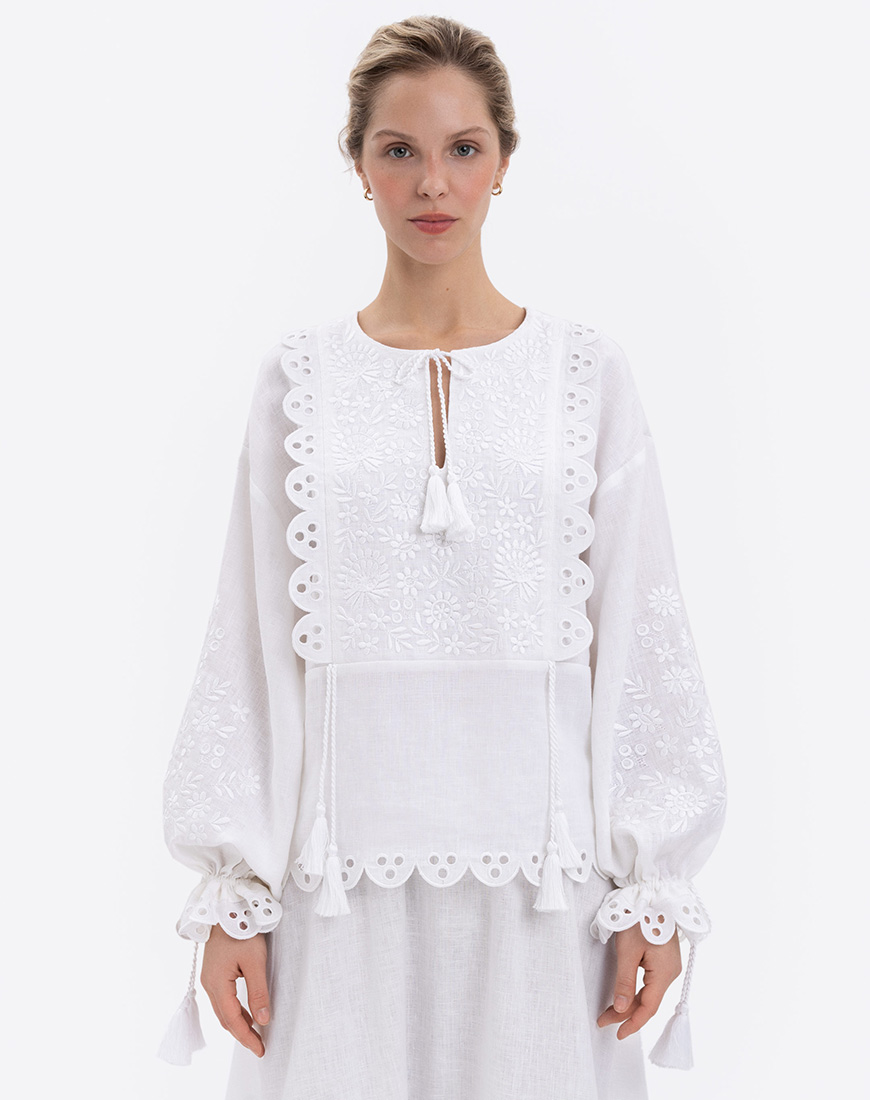 Низ сорочки, рукава та рельєфні шви прикрашені ажурними елементами в техніці рішельє.