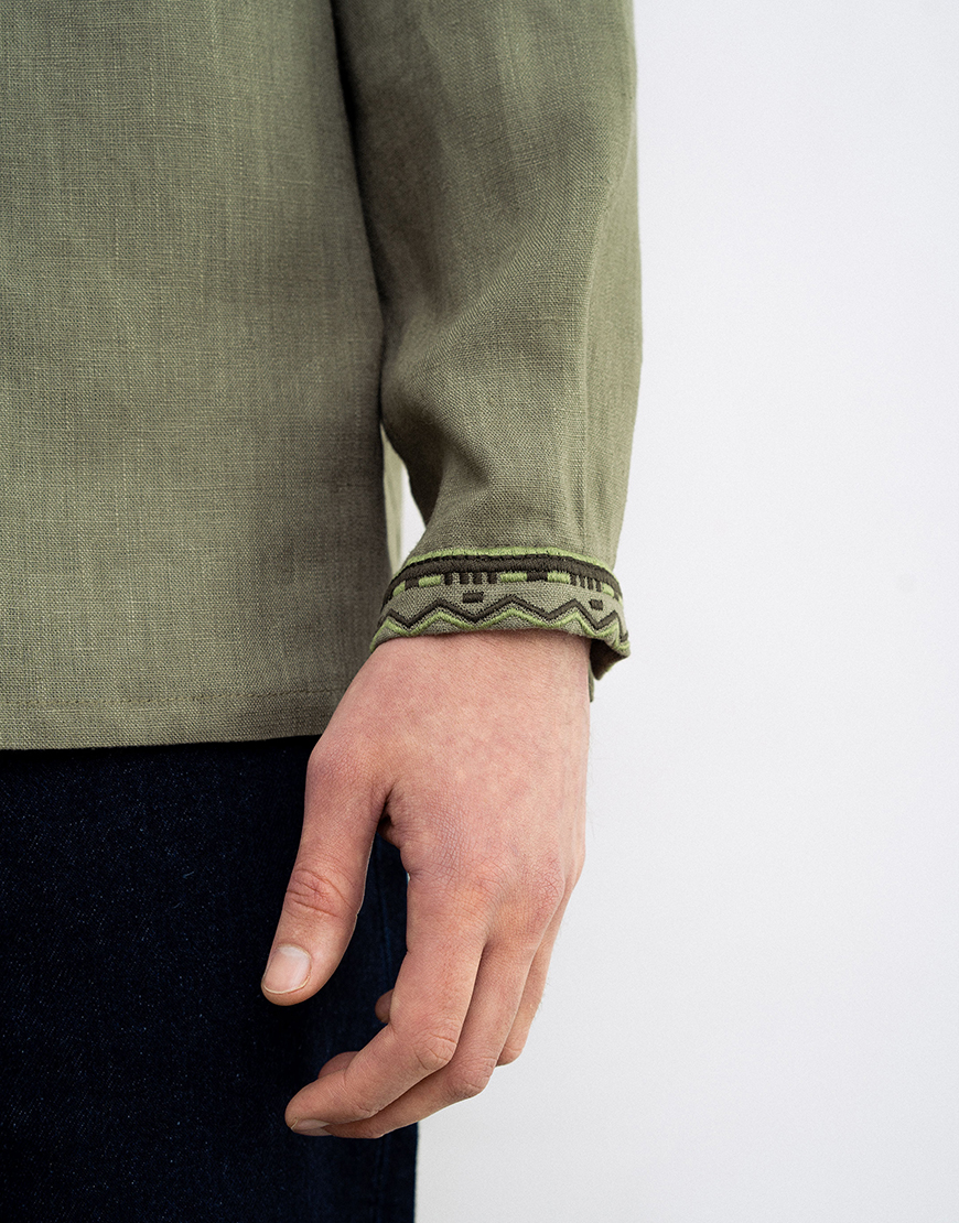 Комір, пілочка та манжети оздоблені вишивкою. Спинка з кокеткою.