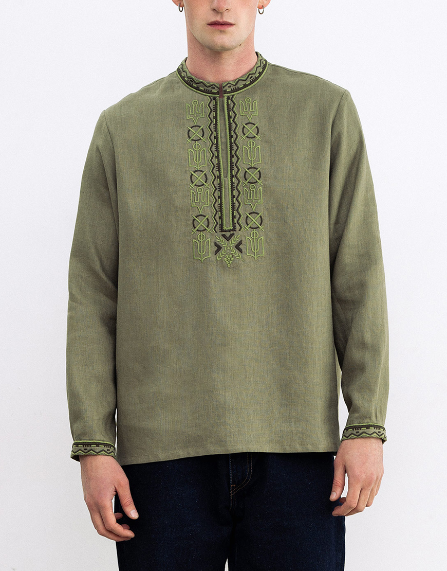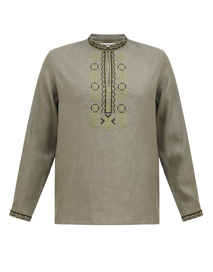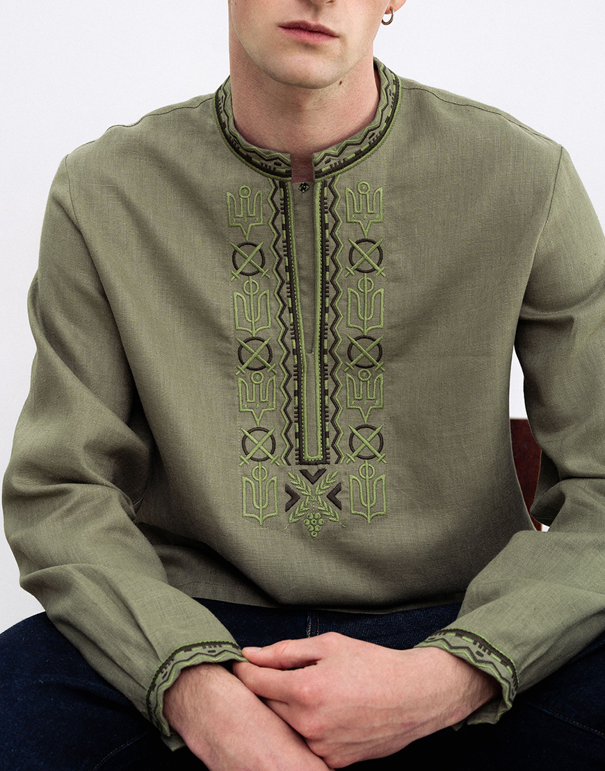 На вишиванці зображені герби Великих князів Київських та родові знаки князів Х-ХII ст. А саме: Тризуб, знак Володимира Великого, герб Князівства, два мечі, гілка калини та пшениці.