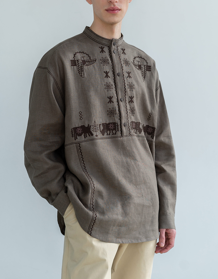 Доставка протягом 2-5 робочих днівЧоловіча сорочка вільного крою із довгим рукавом. Застібка по центру на 5 ґудзиків. Комір-стійка. Відрізна пілочка та спинка по лінії талії. Має бічні відрізні частини. Довгий рукав зі спущеною лінією плеча.