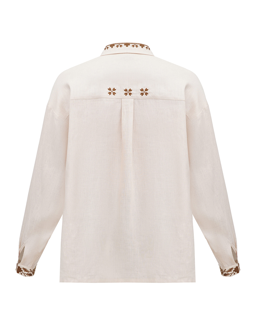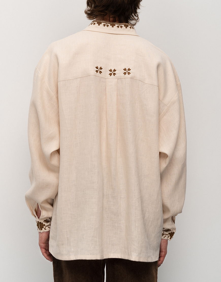 Класичний відкидний комір на стійці застібається на древ’яний ґудзик.