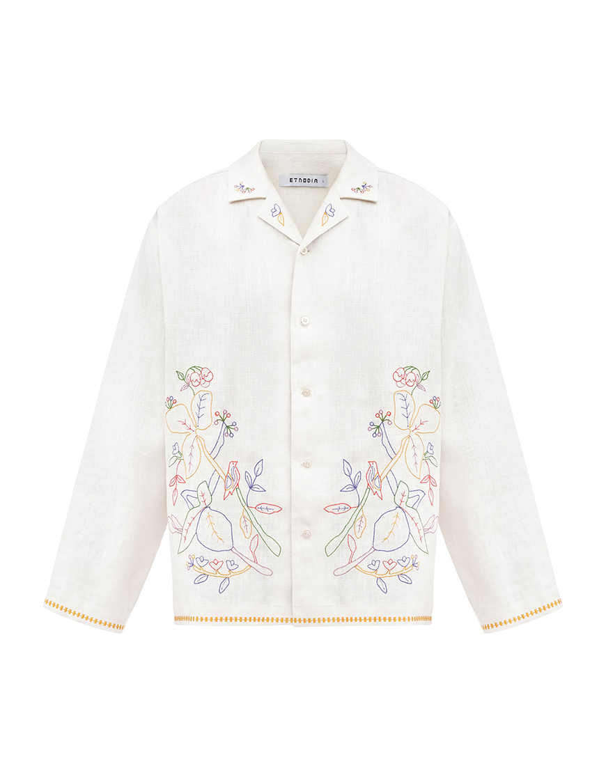 Сорочка має вільний силует та прямі рукави без манжетів. Її універсальний крій пасуватиме як жінкам, так і чоловікам.