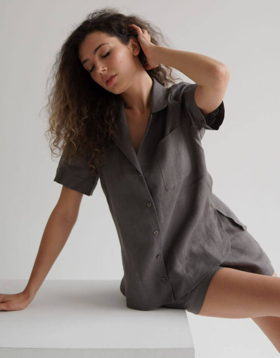 Легкий лляний костюм із шортами та сорочкою з коротким рукавом на ґудзиках.
