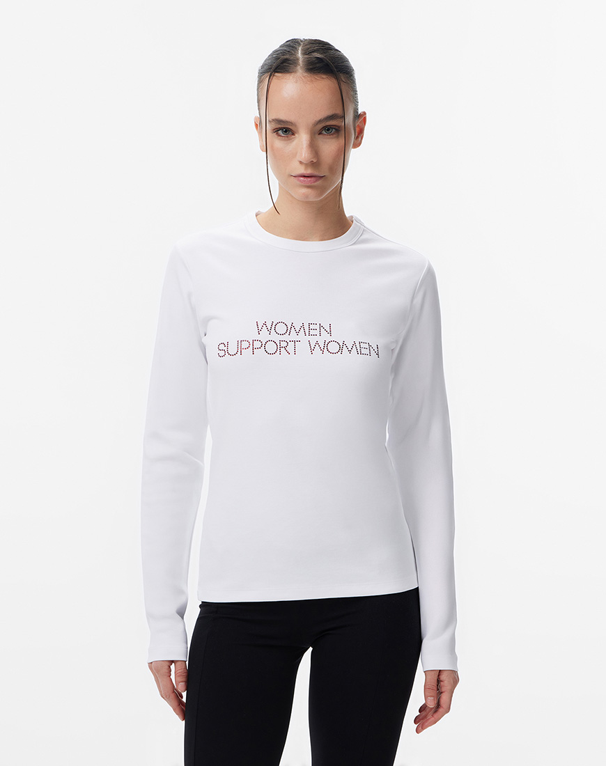 Доставка впродовж 2-5 робочих днівЦей лонгслів – маніфест жіночої сили та єдності. Виконаний з мʼякої бавовни, класичний круглий виріз. Надпис нанесений кристалами вручну