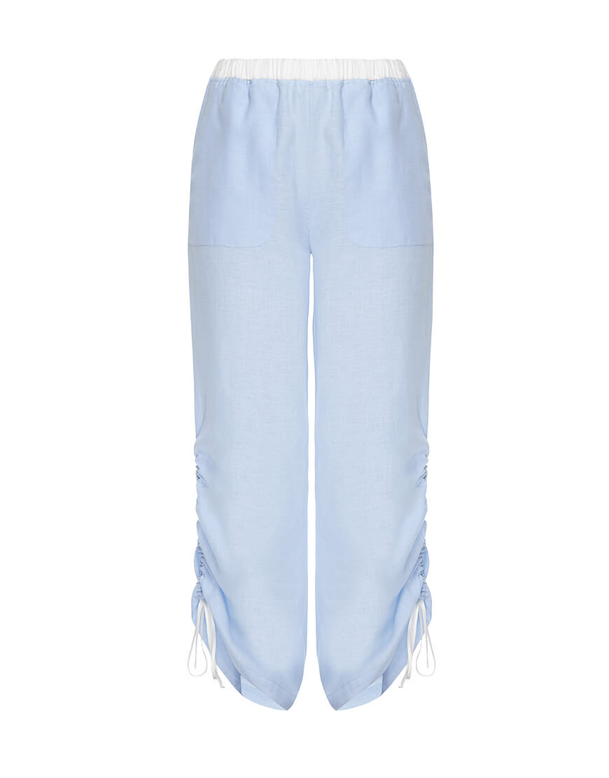 Штани прямого крою, з накладними кишенями, мають пояс на м’якій зручній гумці, що не тисне, оздоблений шовком. По бічних швах від коліна до низу вставлена функціональна шовкова стрічка, за допомогою якої можна регулювати довжину штанів.