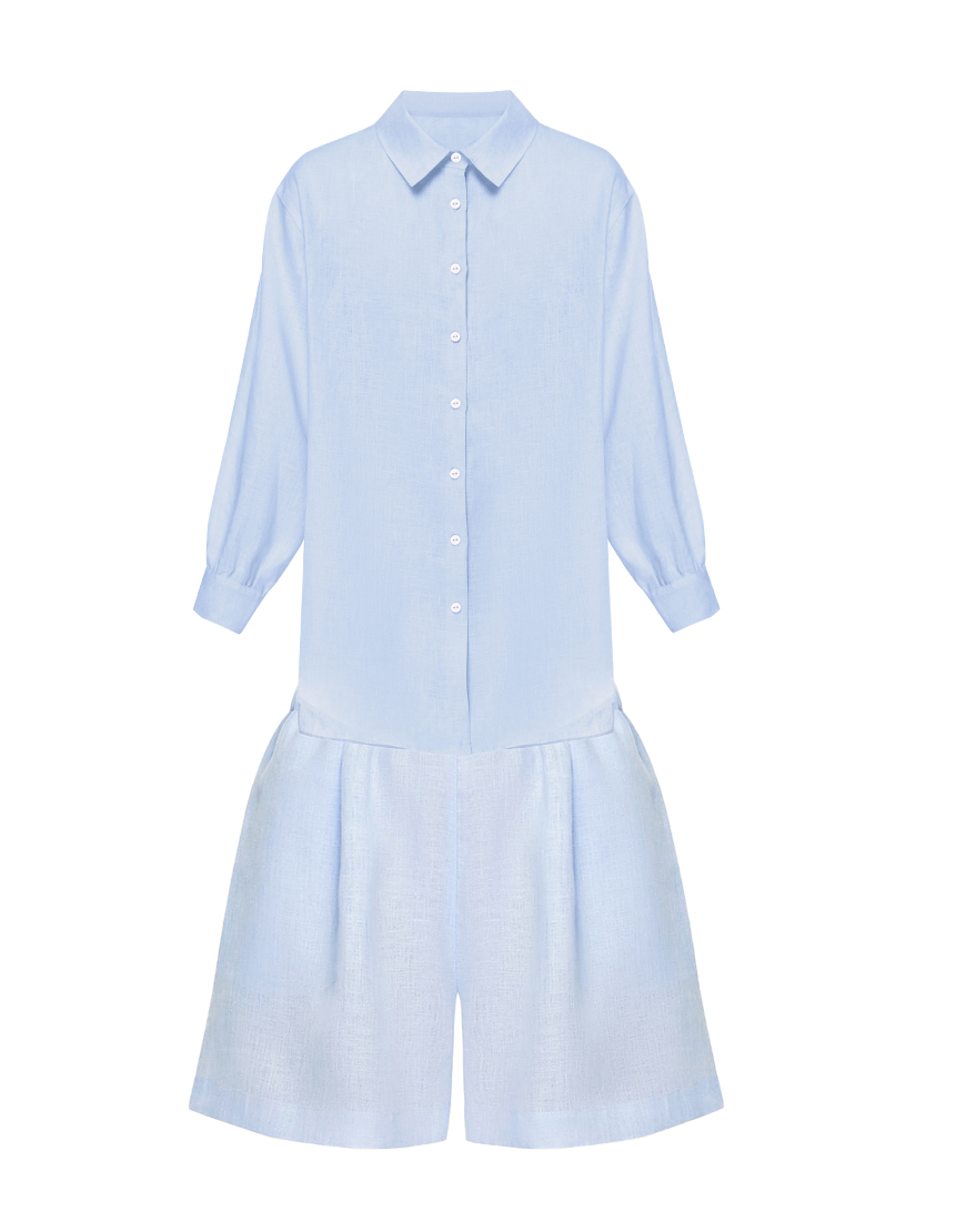 Шорти середньої довжини, мають вільний крій, форму трапеції, складки, кишені в боковому шві, на м’якій зручній гумці, що не тисне. виготовлені зі 100% натурального льону, сертифікованого за STANDARD 100 від OEKO-TEX®.