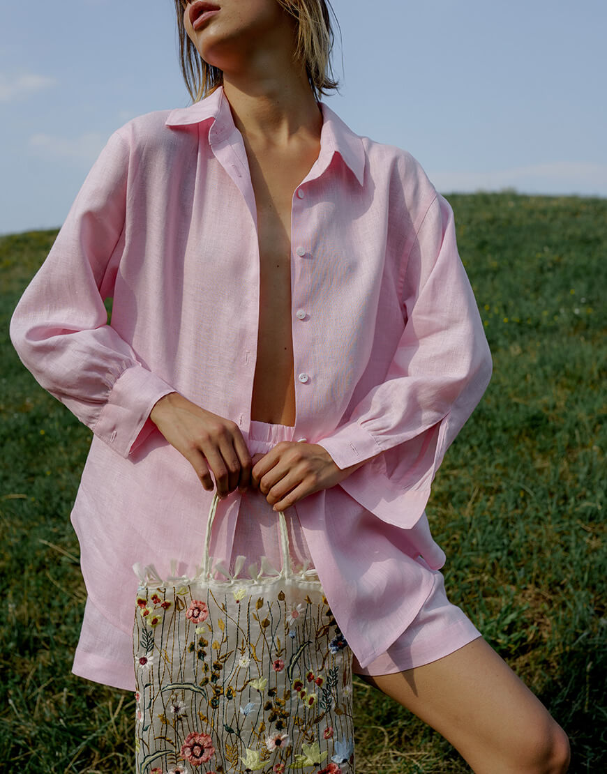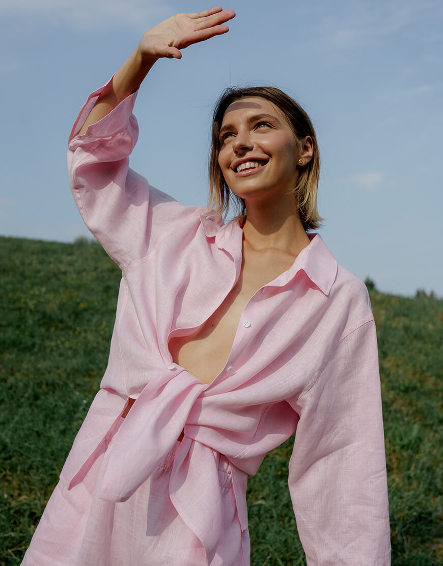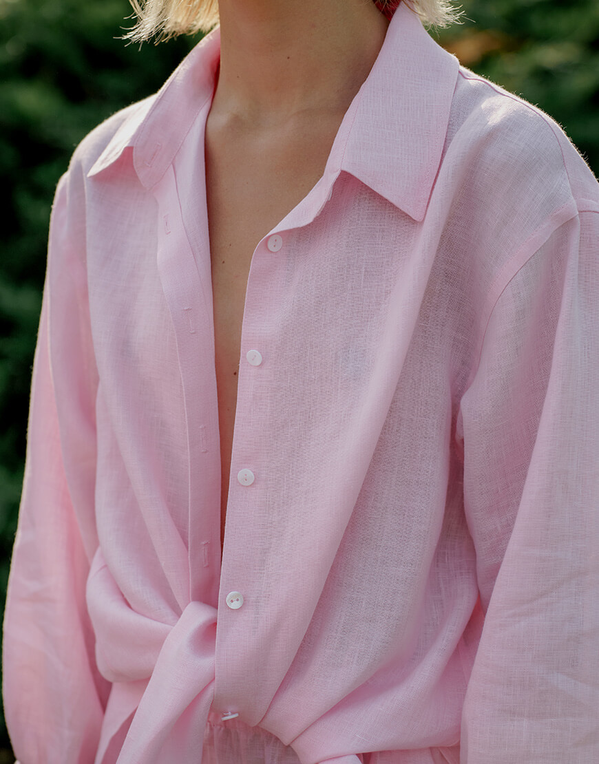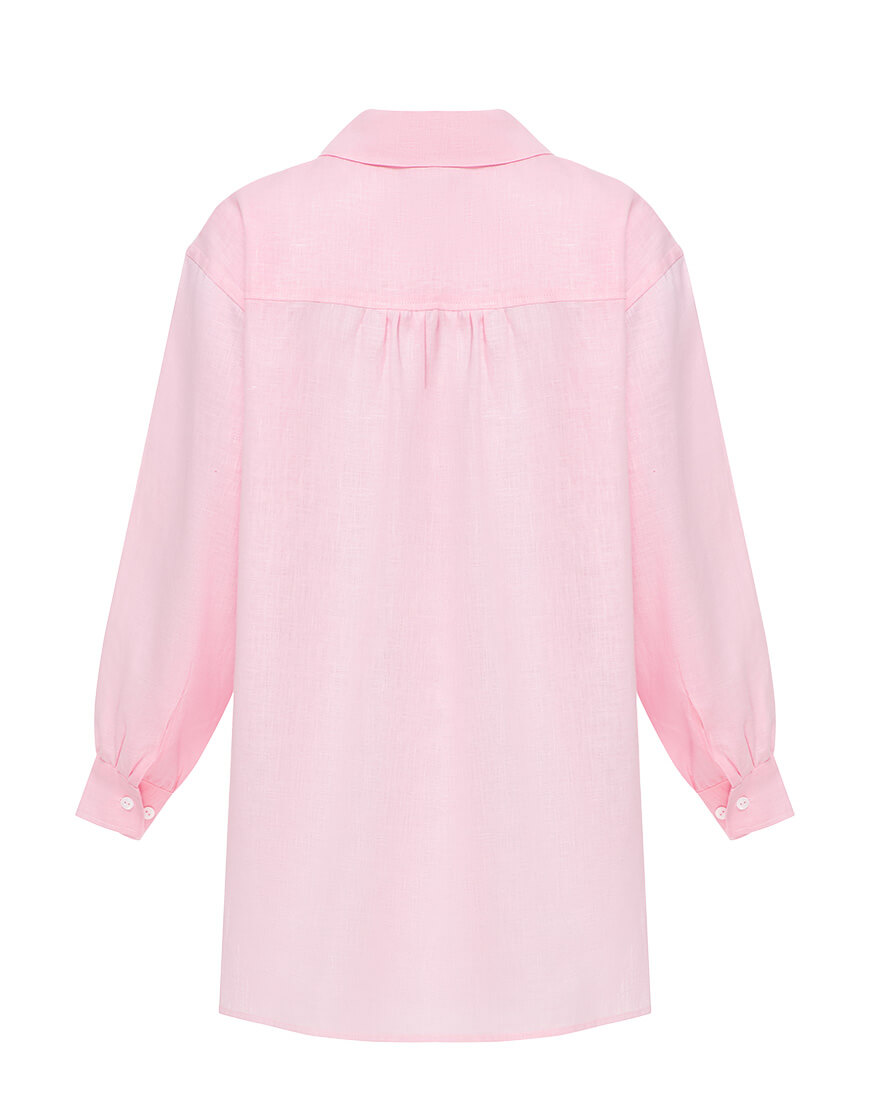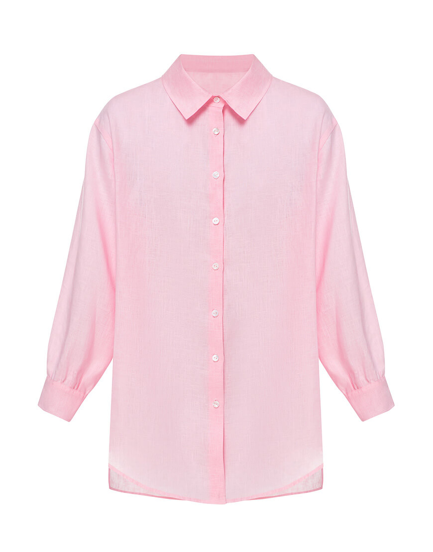 Сорочка лляна з довгим рукавом, вільного крою, оверсайз, має збірку по центру спини та збірку внизу рукава, має фігурний низ. Виготовлена зі 100% натурального льону, сертифікованого за STANDARD 100 від OEKO-TEX®, декорована ґудзиками з органічної перламутрової мушлі. Розроблена з урахуванням зросту та підходить для всіх типів фігури.