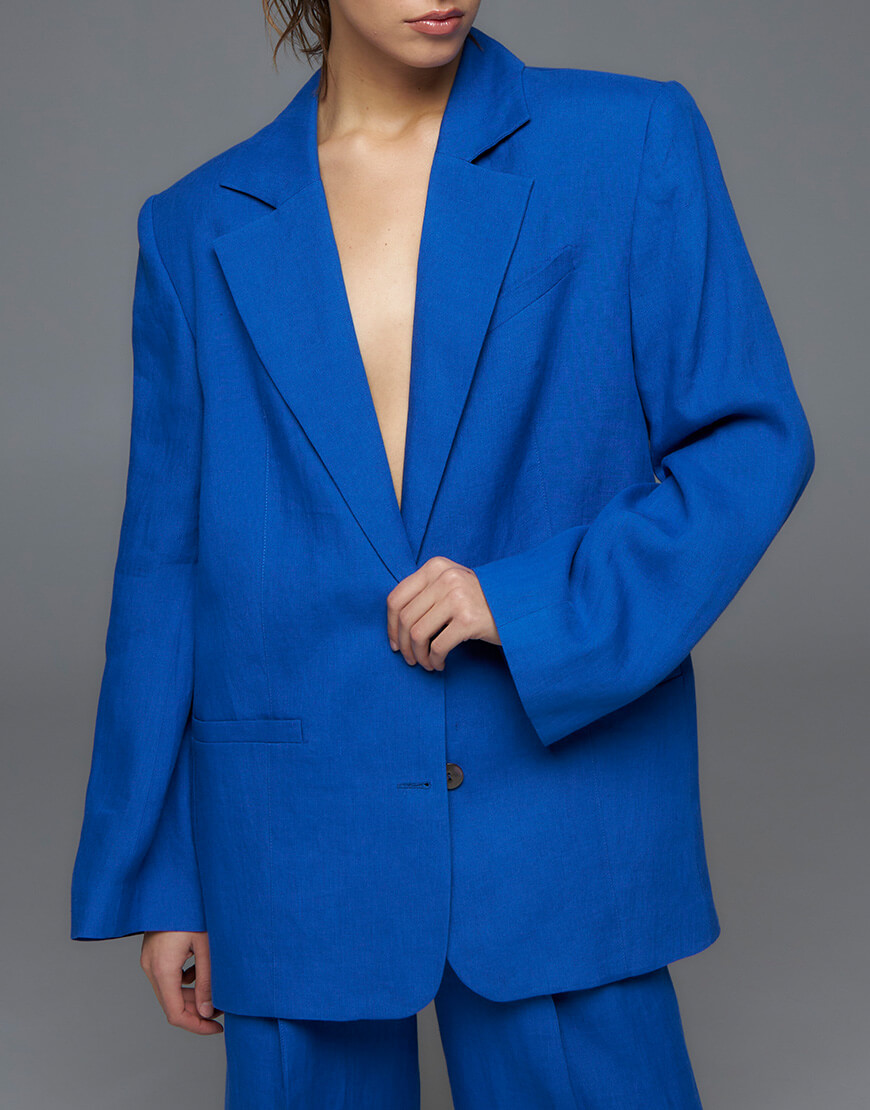 Доставка протягом 5-7 робочих днівОднобортний лляний піджак оверсайз, прямого крою, на підкладці, з класичним коміром, рельєфною виточкою. має функціональні кишені на полицях виробу і нагрудну кишеню-лісточку, дві відкриті шліци по спині, прямі рукава з закритою шліцою. Виготовлений з натурального льону, сертифікованого за STANDARD 100 від OEKO-TEX®, має підкладку з віскози, гудзики з органічного перламутру. В комплекті до жакету є брюки.