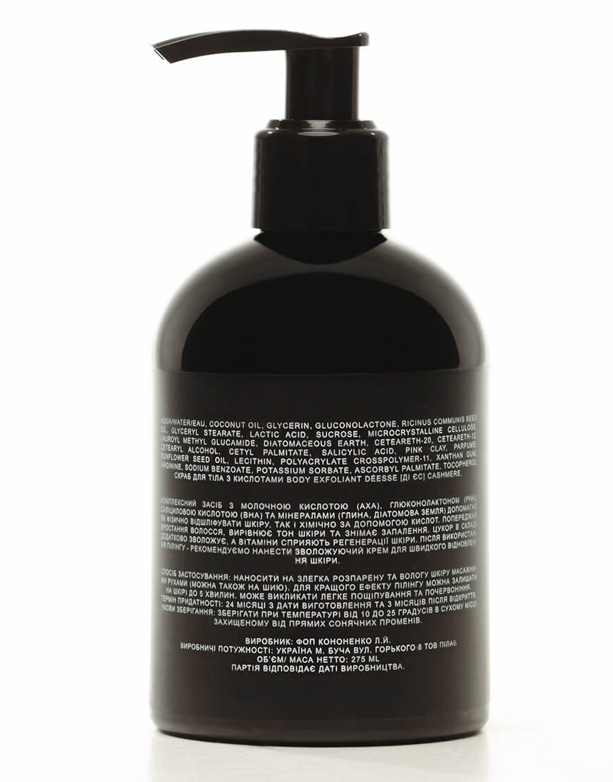 Доставка протягом 2-5 робочих днівСкраб для тіла з кислотами Body Exfoliant DÈESSE [ді єс] cashmere. Комплексний засіб з молочною кислотою (АHА), глюконолактоном (РНА), саліциловою кислотою (ВНА) та мінералами (глина, діатомова земля).