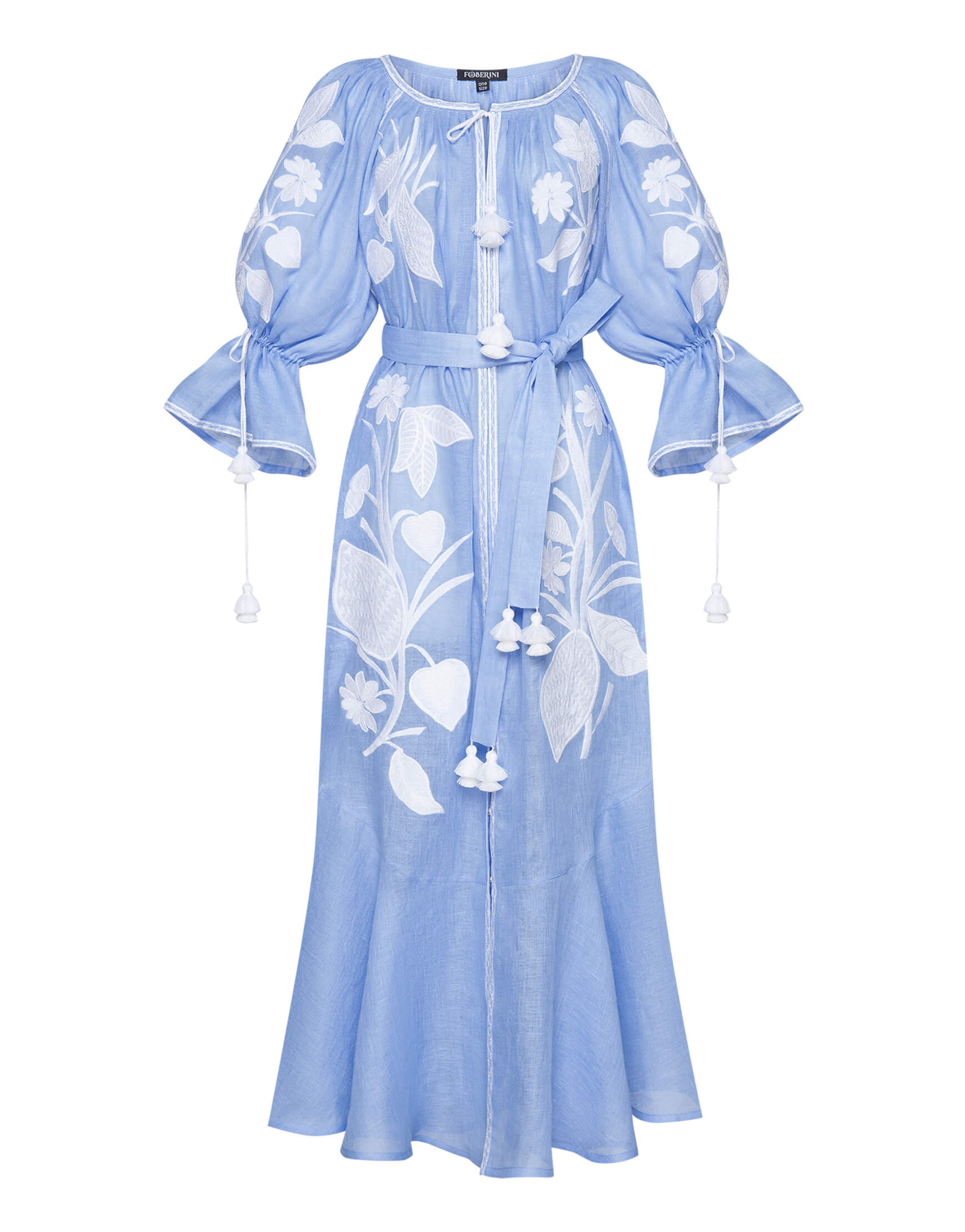 Доставка протягом 2-14 робочих днівНіжного фіалкового кольору сукня максі. Оздоблена квітковим орнаментом білого кольору. Має вишиті рукава прямого крою із зав’язками та кісточками ручної роботи. Яскраве поєднання кольорів, жіночний силует та ручні елементи роблять цю богемну сукню ідеальним вбранням для круїзних поїздок.