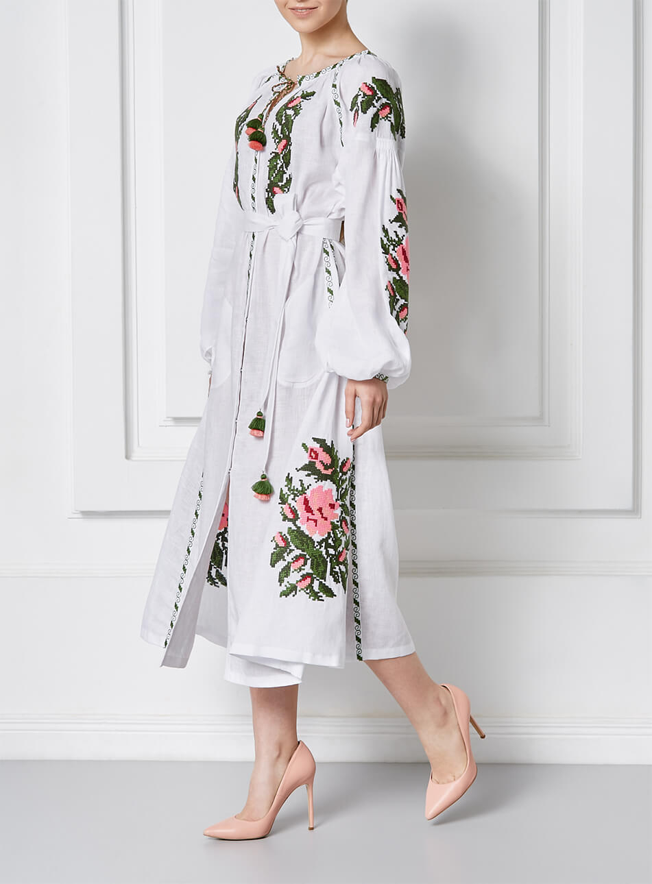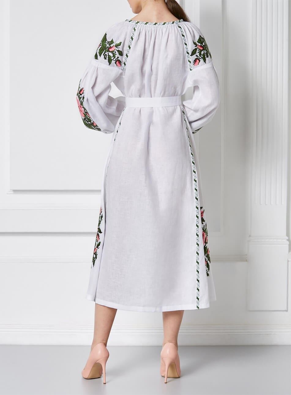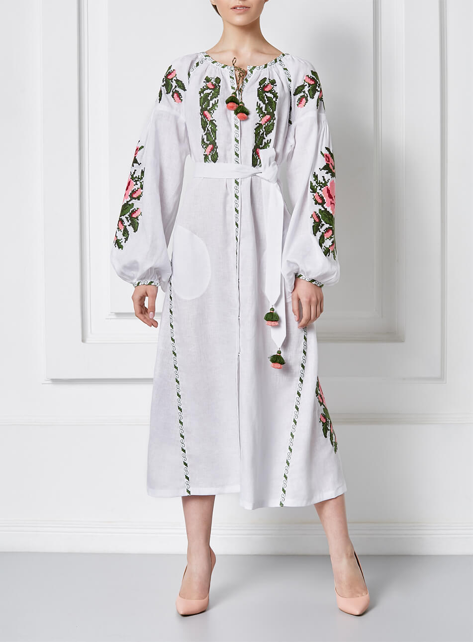 Доставка протягом 2-14 робочих днівБіла лляна сукня-міді. Яскравий вишитий декор хрестиком рясно прикрашає руки, груди та поділ. Об’ємні рукава прикрашені старовинною технікою драпірування тканини – “пухлик” ручної роботи. Виріб має застібки спереду по всій довжині, пояс та кишені. Зручна довжина та приємна до тіла тканина зроблять цю модель незамінною у гардеробі.