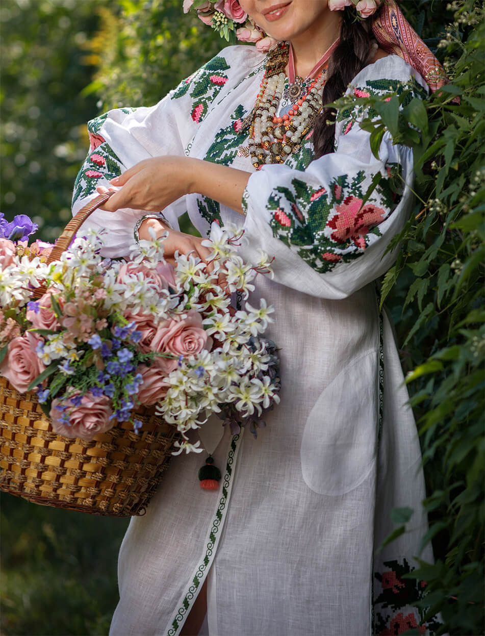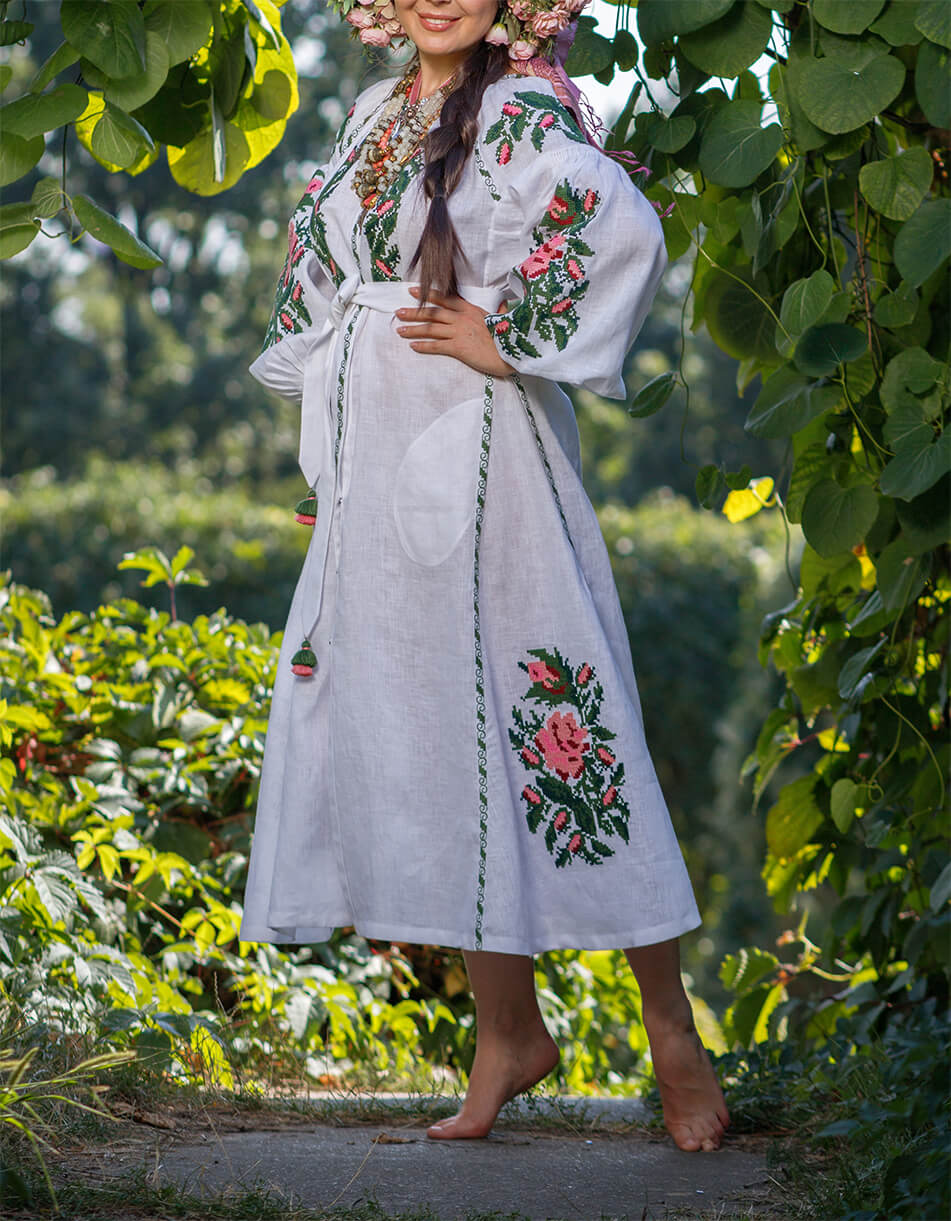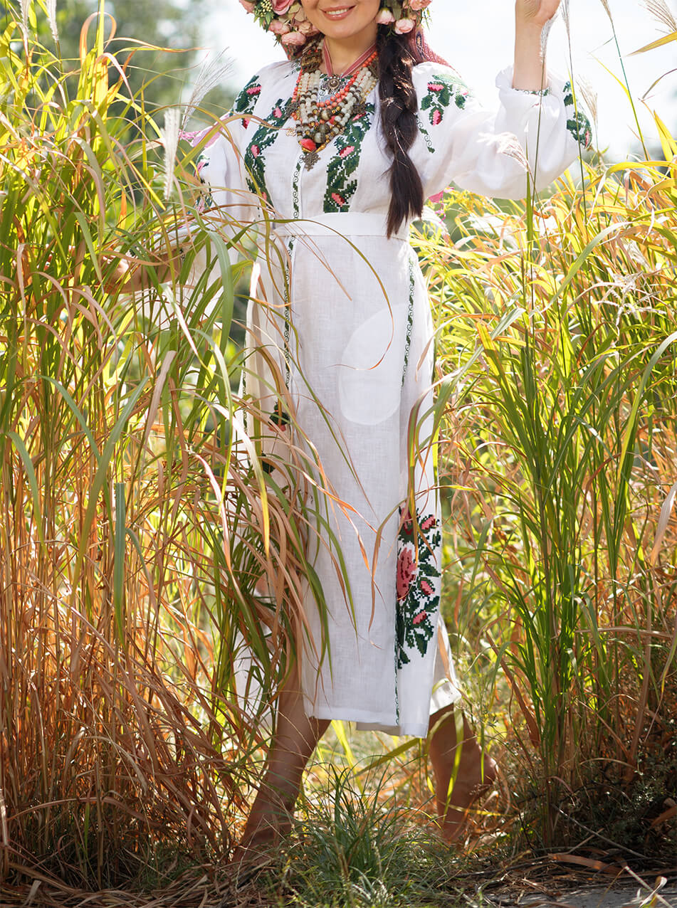 Доставка протягом 2-14 робочих днівБіла лляна сукня-міді. Яскравий вишитий декор хрестиком рясно прикрашає руки, груди та поділ. Об’ємні рукава прикрашені старовинною технікою драпірування тканини – “пухлик” ручної роботи. Виріб має застібки спереду по всій довжині, пояс та кишені. Зручна довжина та приємна до тіла тканина зроблять цю модель незамінною у гардеробі.
