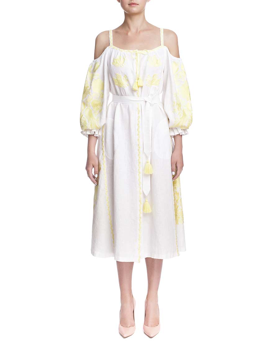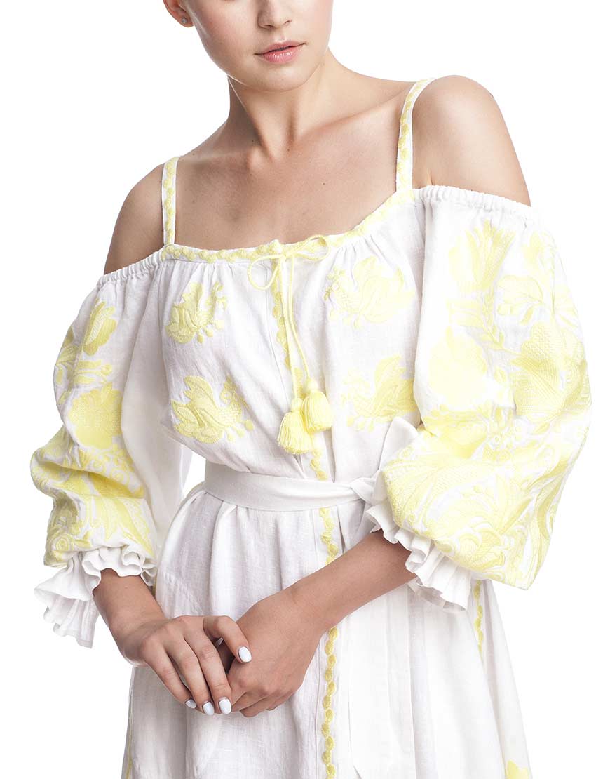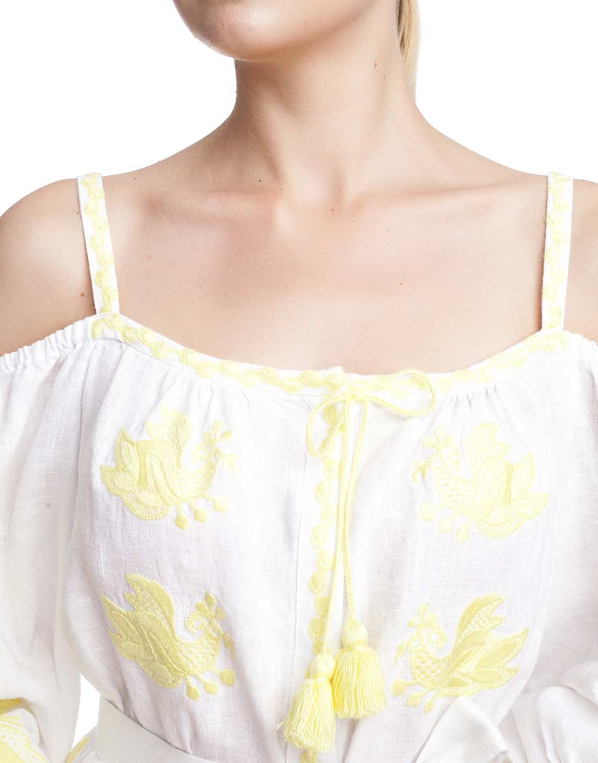 Сукня-вишиванка “Жарптиця” з відкритими плечима. Пошита з високоякісного льону, декорована вишивкою лимонного кольору. У вишивці передані основні елементи, які найчастіше використовуються для вишивки обрядових рушників. Сукня “Жарптиця” має застібки-кнопки по всій довжині виробу. Рукава прикрашені рюшами на манжетах. У комплекті до сукні – пояс із пензликами.