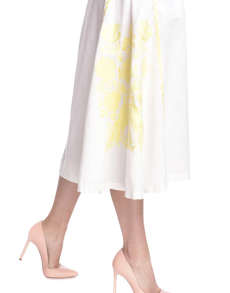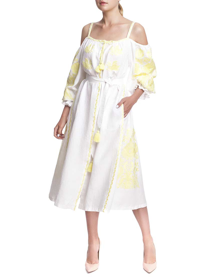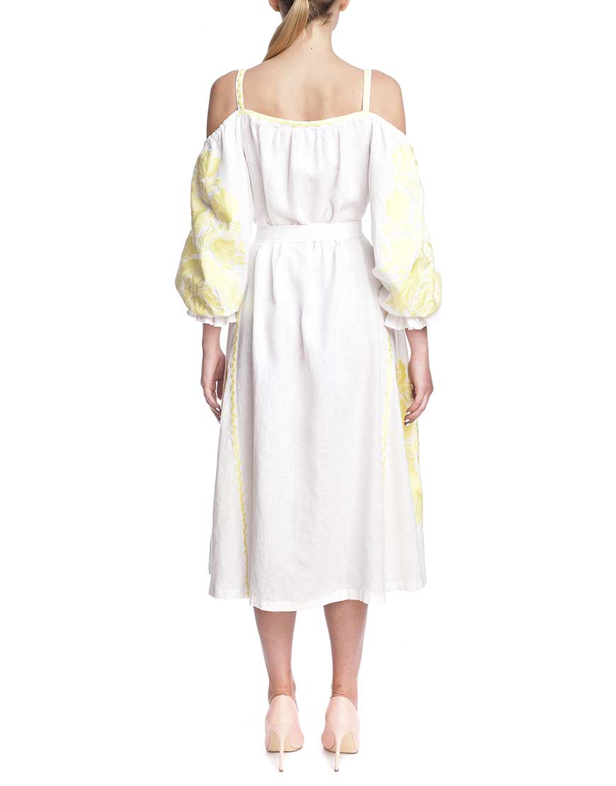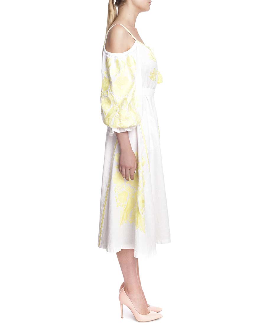 Сукня-вишиванка “Жарптиця” з відкритими плечима. Пошита з високоякісного льону, декорована вишивкою лимонного кольору. У вишивці передані основні елементи, які найчастіше використовуються для вишивки обрядових рушників. Сукня “Жарптиця” має застібки-кнопки по всій довжині виробу. Рукава прикрашені рюшами на манжетах. У комплекті до сукні – пояс із пензликами.
