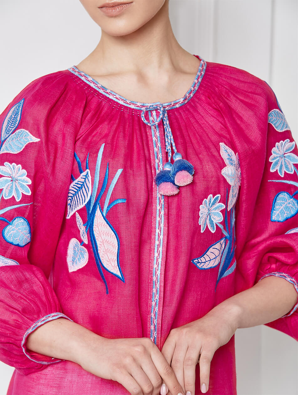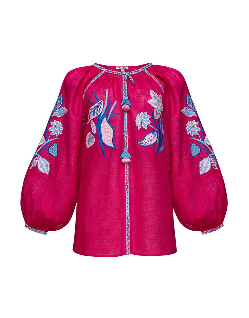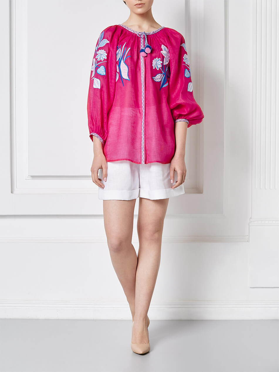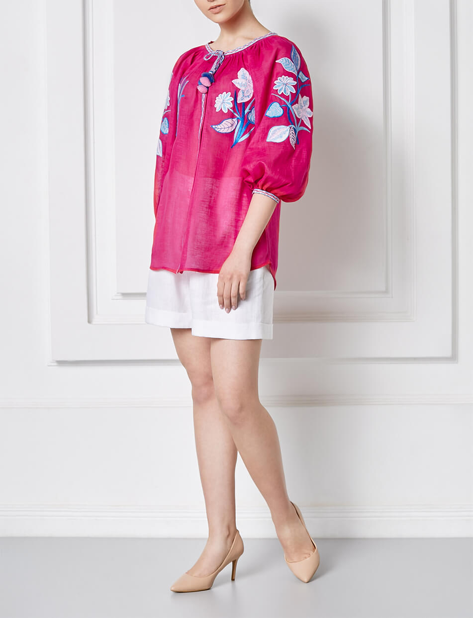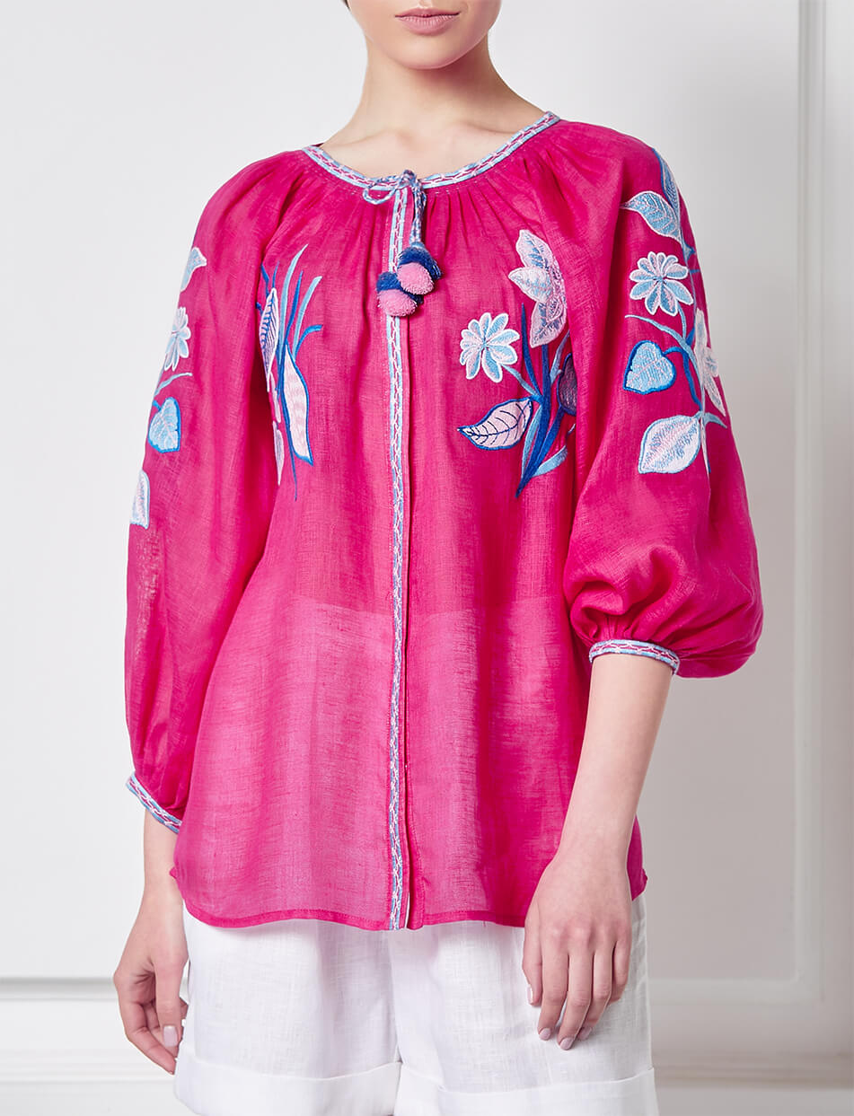 Яскраво-рожева блуза з об’ємними рукавами. Прикрашена авторським орнаментом і зав’язками з китицями. Спереду по всій довжині має застібки. Класичний та стильний варіант улюбленої вишиванки.
