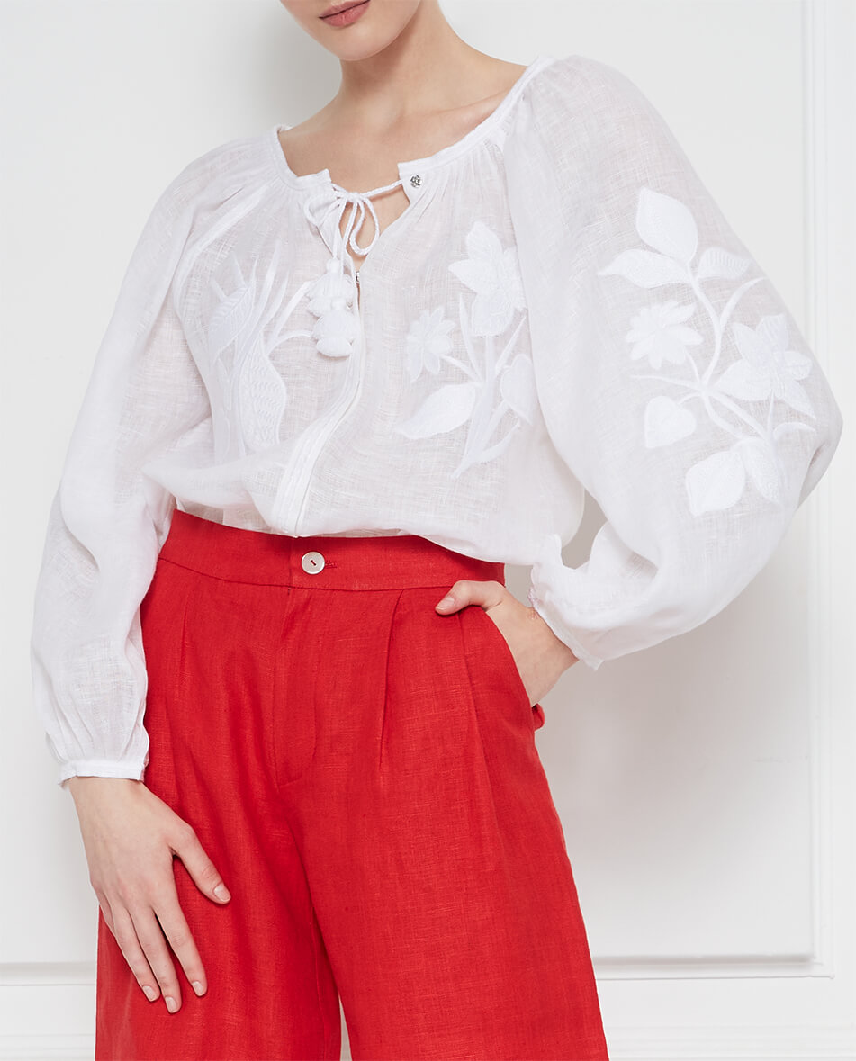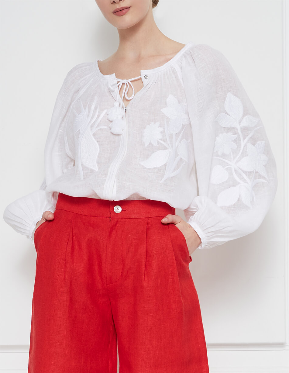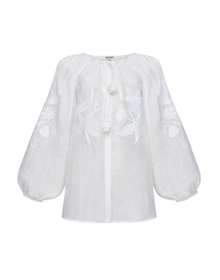 Біла блузка з об’ємними рукавами. Прикрашена авторським орнаментом у тон тканини та зав’язками з кистями. Попереду по всій довжині має застібки. Класичний та стильний варіант улюбленої вишиванки.