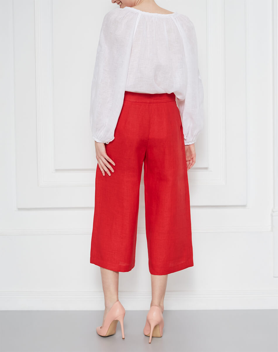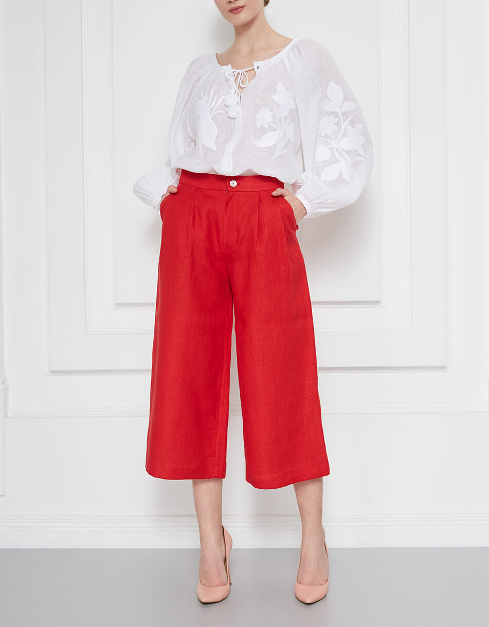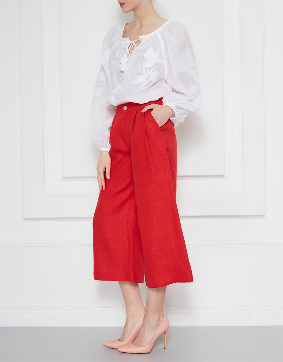 Біла блузка з об’ємними рукавами. Прикрашена авторським орнаментом у тон тканини та зав’язками з кистями. Попереду по всій довжині має застібки. Класичний та стильний варіант улюбленої вишиванки.