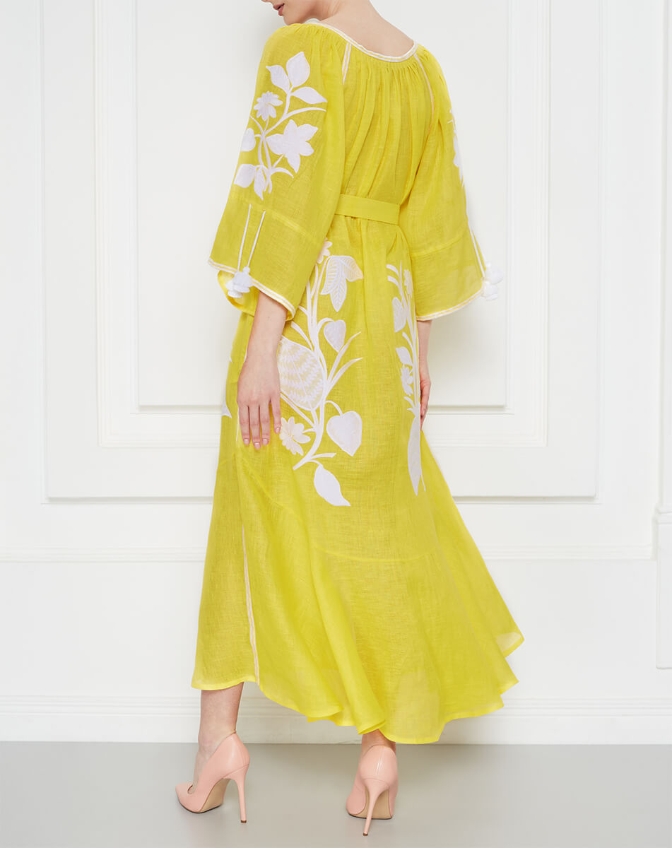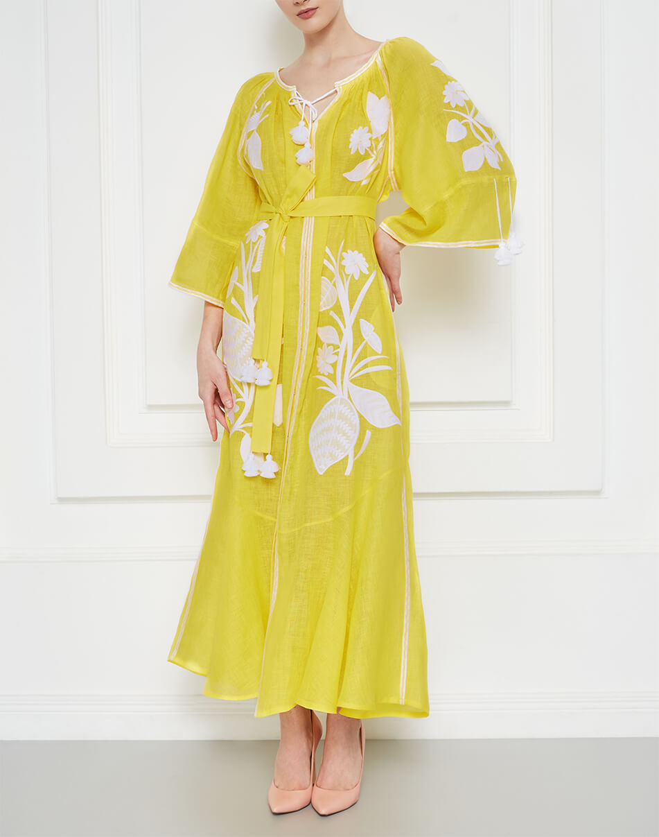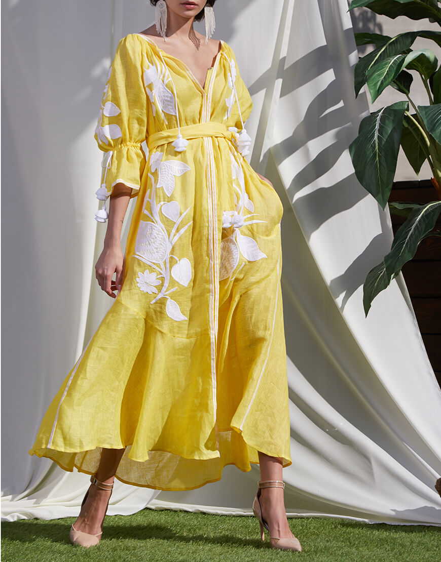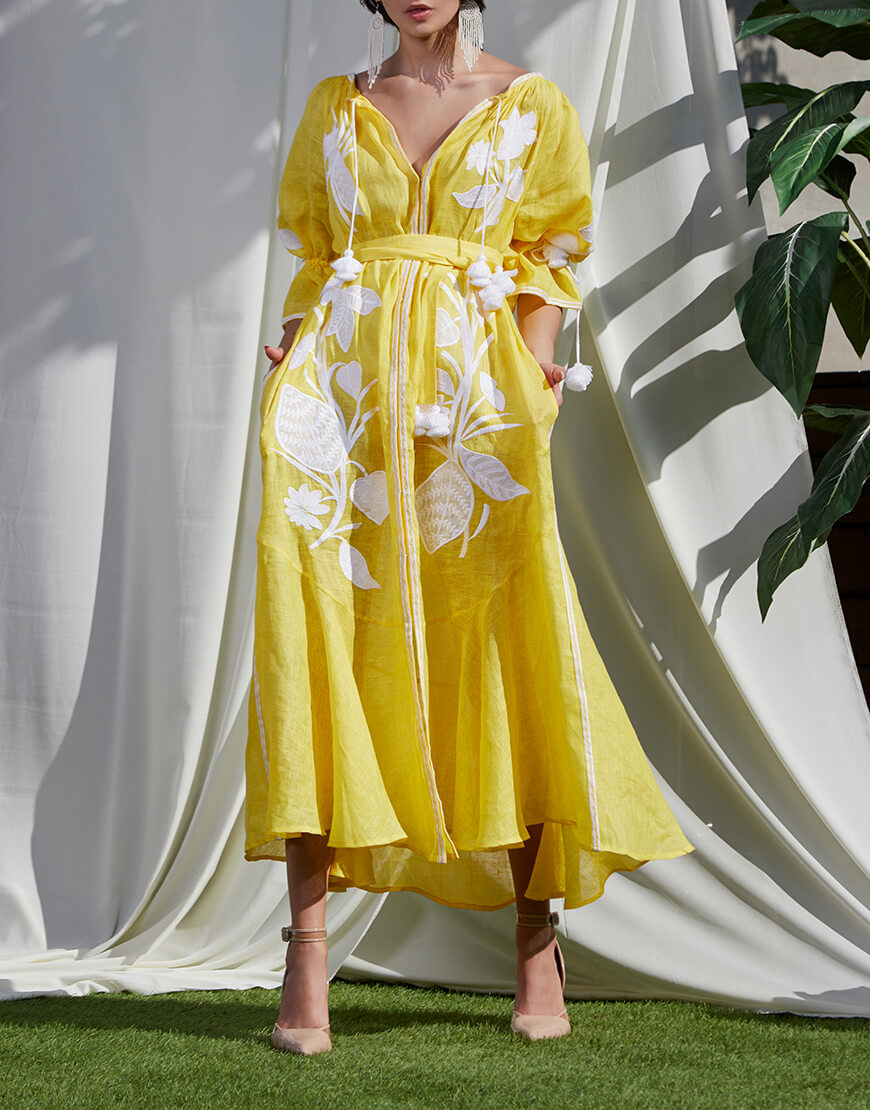Доставка впродовж 2-14 робочих днівВишита квітковим орнаментом білого кольору. Має вишиті рукави прямого крою. Горловина та рукави доповнені зав’язками з кісточками ручної роботи. Яскраве поєднання кольорів тканини та вишивки, жіночний силует та елементи ручної роботи роблять цю богемну сукню ідеальним варіантом для круїзних поїздок.