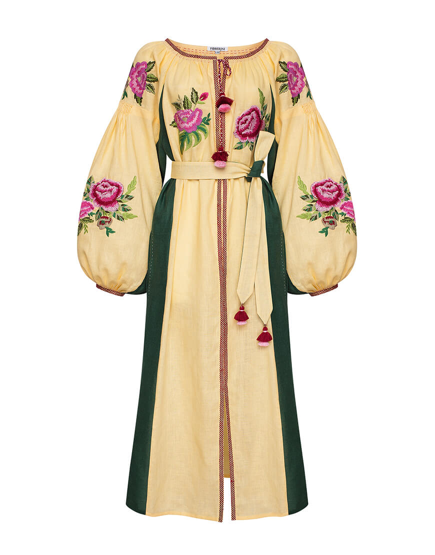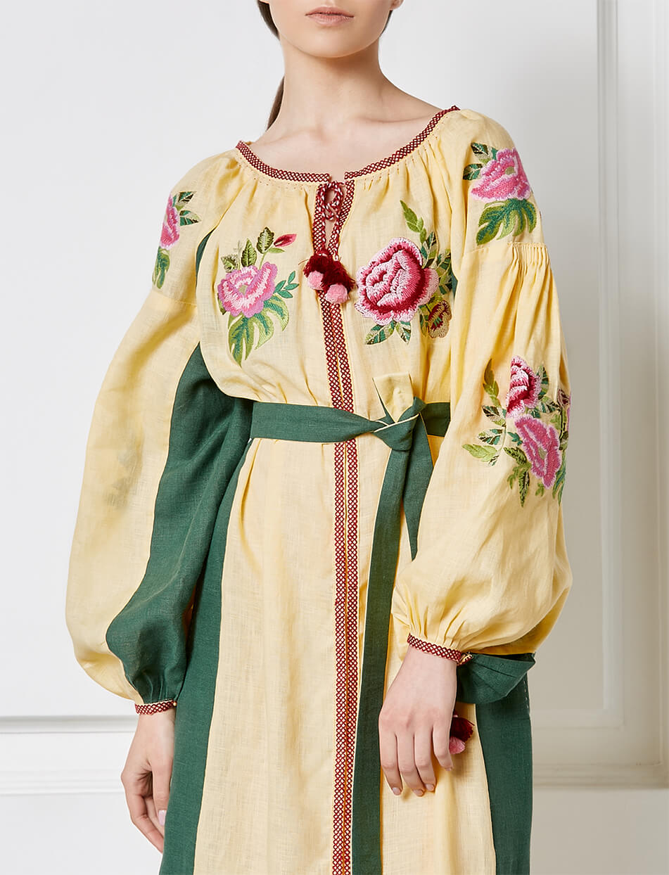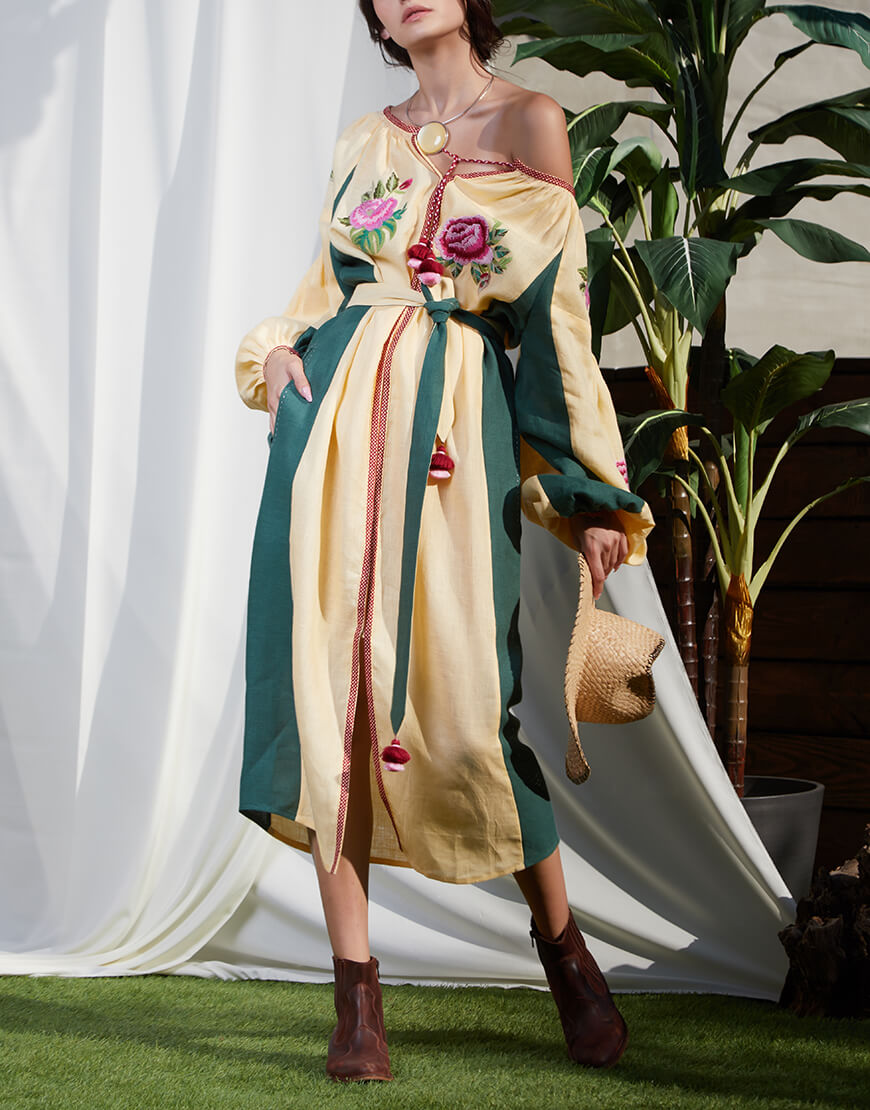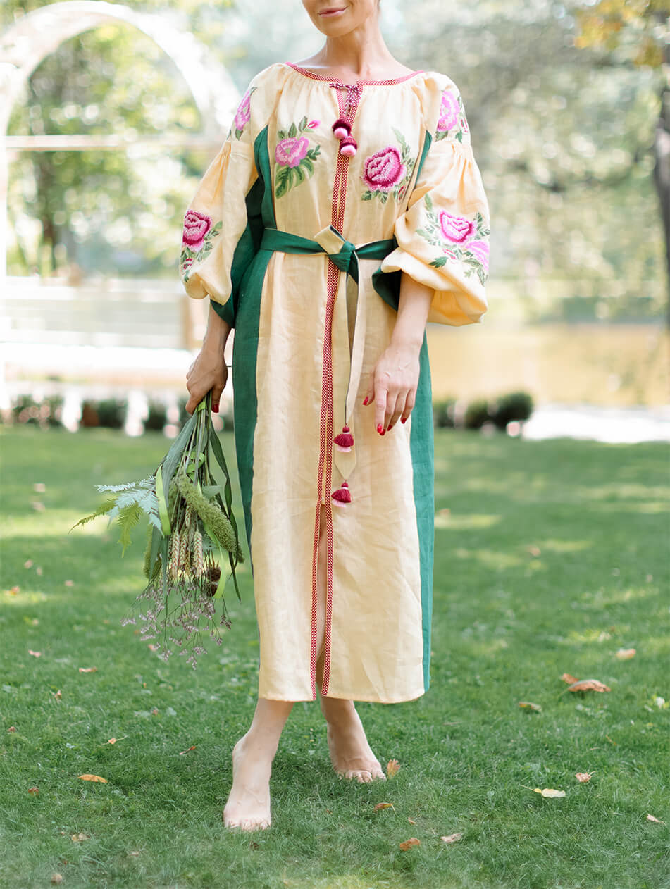 Доставка впродовж 2-14 робочих днівБежева сукня з контрастними вставками з боків, що візуально подовжує фігуру. Об’ємні рукави прикрашені квітковим орнаментом та старовинною технікою драпірування тканини – ”пухлик” ручної роботи. Виріб має застібки спереду по всій довжині, пояс та кишені. Жіночий силует та елементи ручних робіт роблять цю богемну сукню ідеальним вбранням для відпочинку з родиною.