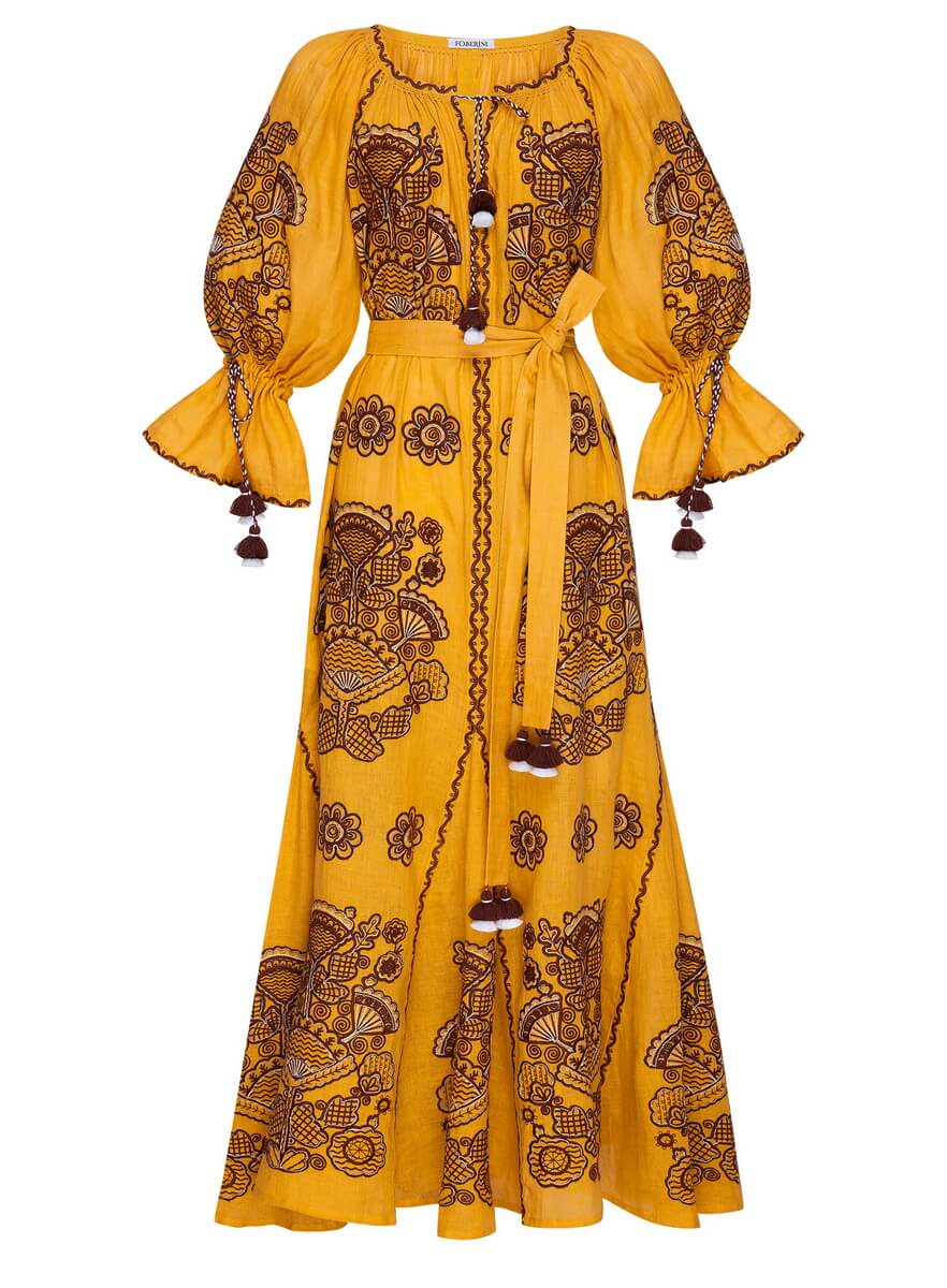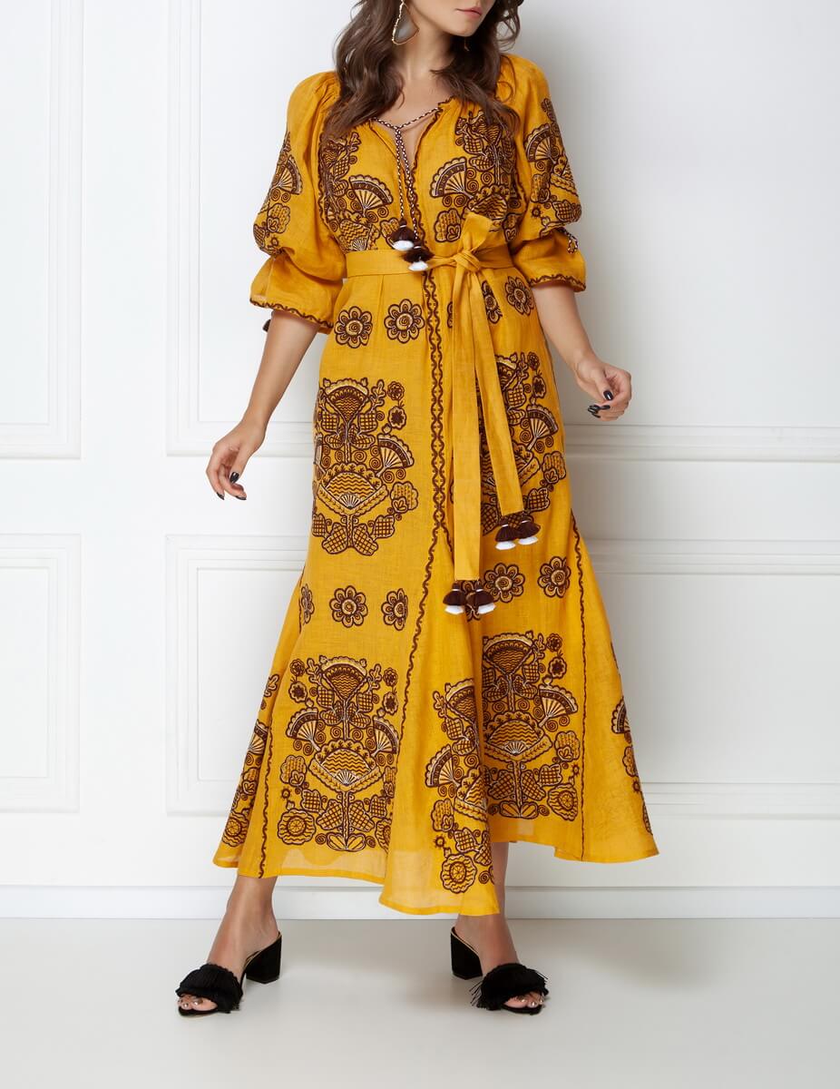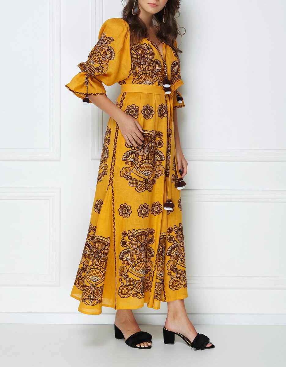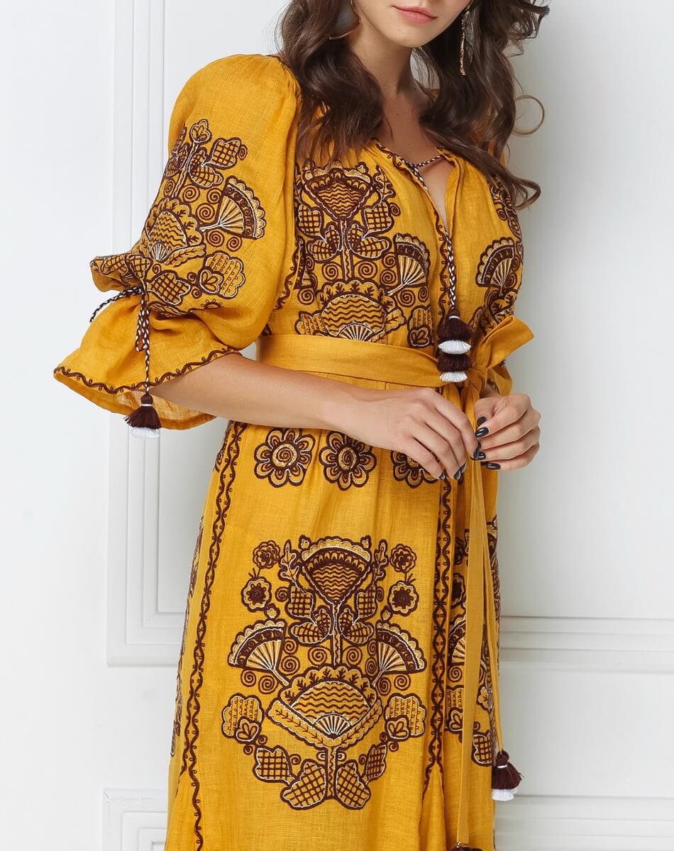 Доставка протягом 2-14 робочих днів«Вікторі Шик» гірчична сукня-максі. Вишита квітковим орнаментом коричневого та білого кольору по всій довжині виробу. Має зав’язки з кісточками на горловині та на рукавах прямого крою. Виконана зі 100% натуральних матеріалів. Яскраве поєднання кольорів тканини та вишивки, жіночний силует та елементи ручної роботи роблять цю богемну сукню ідеальним круїзним варіантом. Розмірний ряд: oversize.