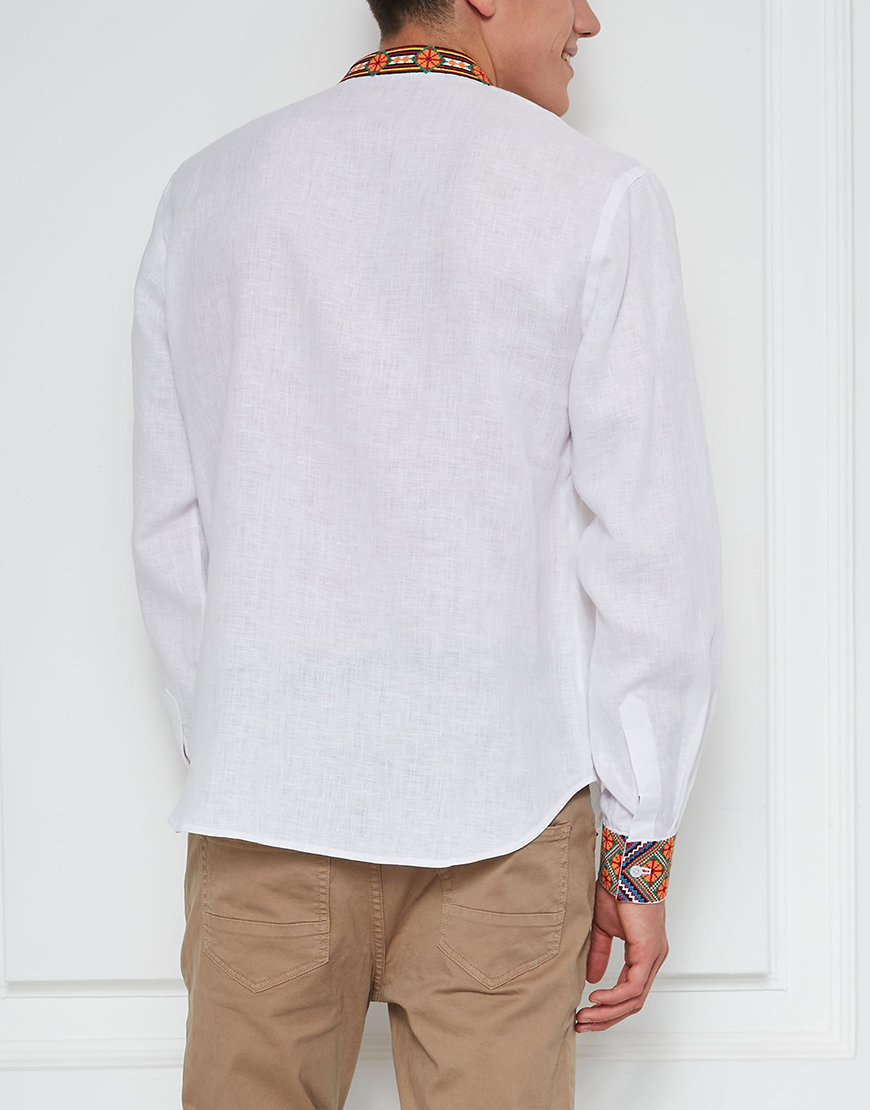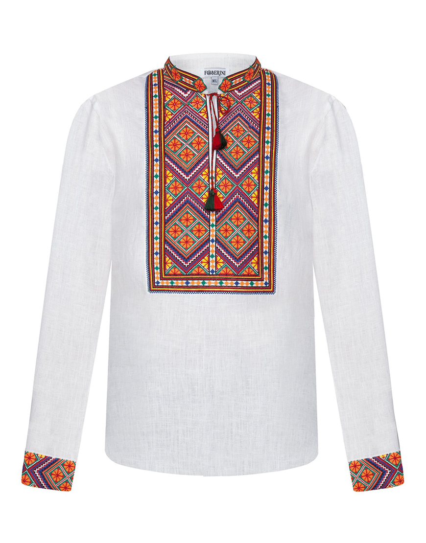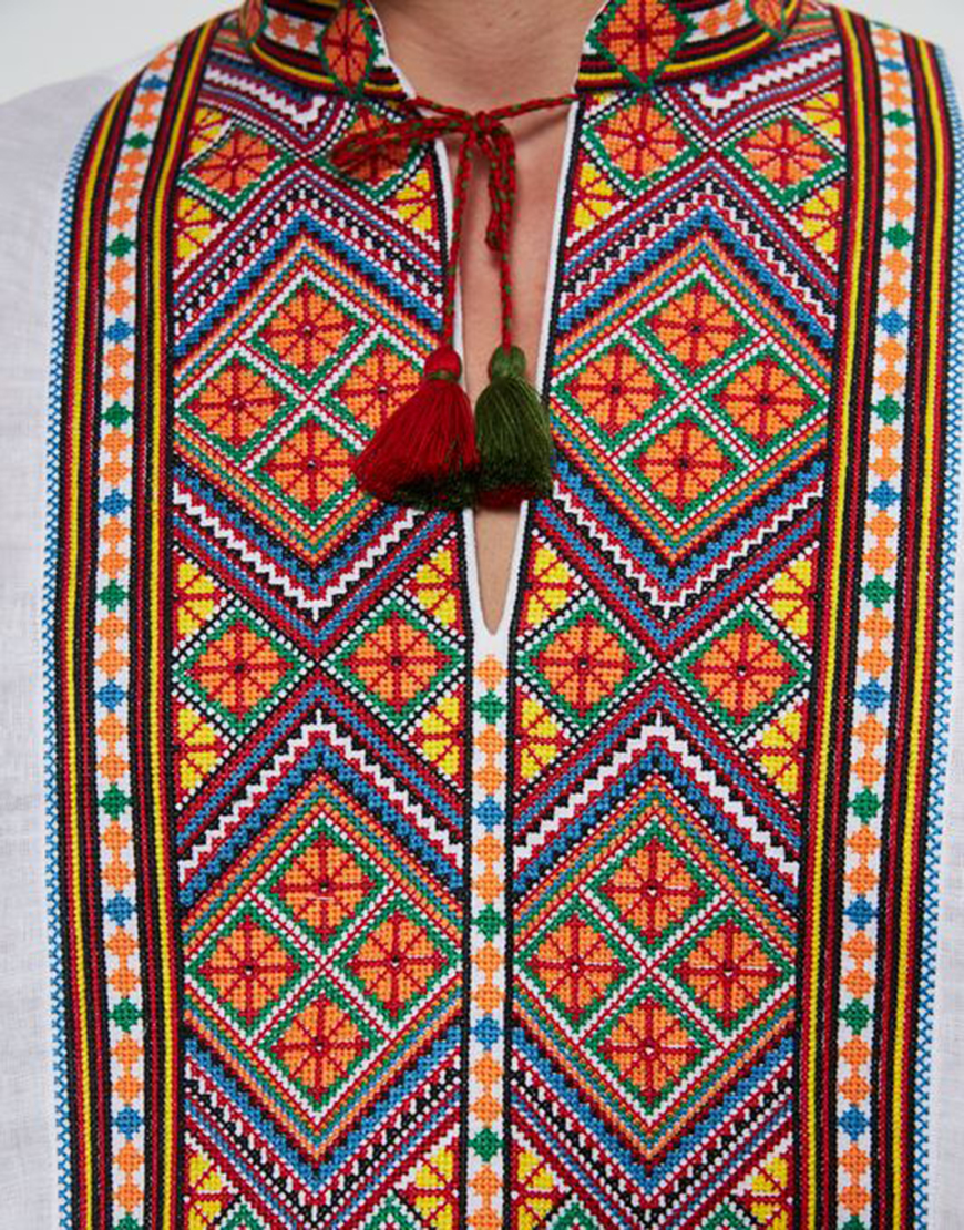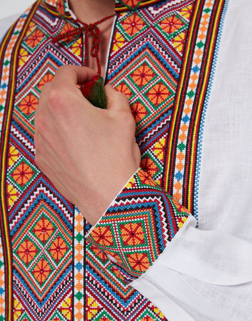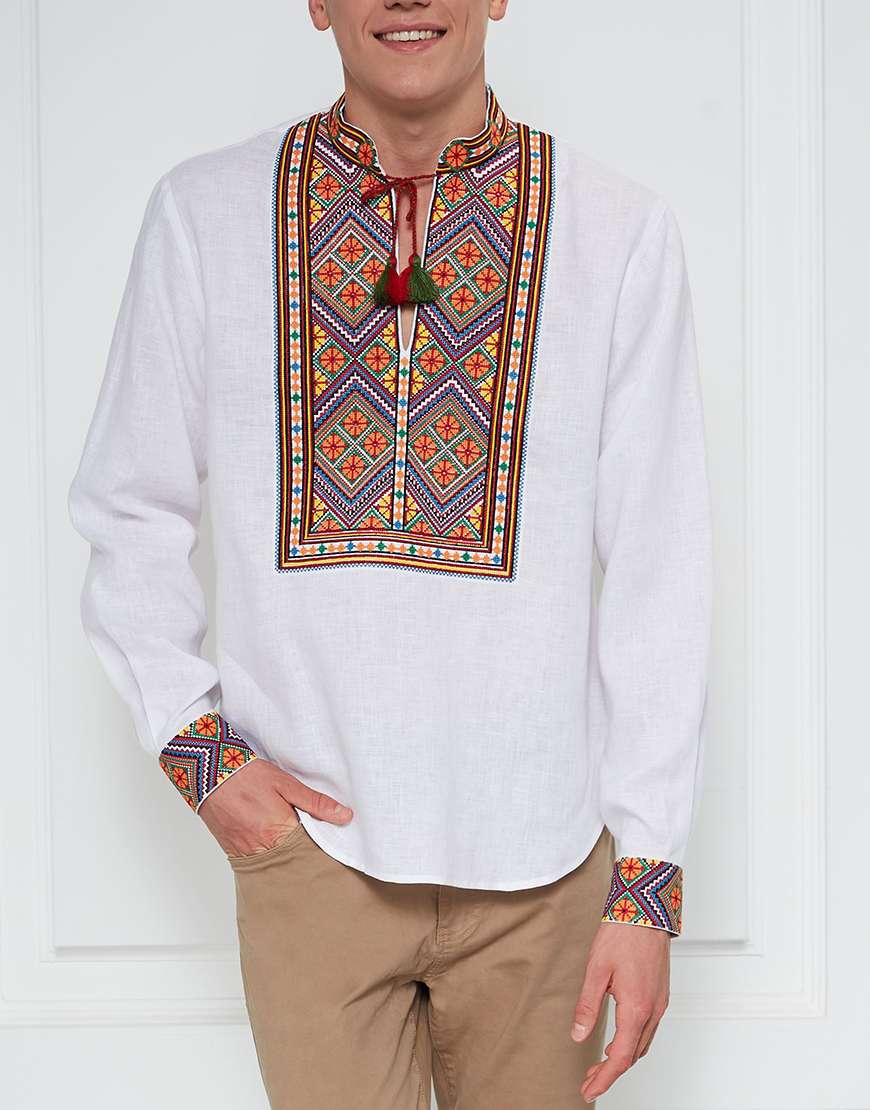 Доставка протягом 3-10 робочих днівОздоблена яскравою автентичною геометричною вишивкою Закарпатської області. Доповнена зав’язками з китицями ручної роботи. Вишитий комір-стійка. Яскраве поєднання відтінків, крій класичної чоловічої вишиванки і автентичний візерунок роблять цю сорочку ідеальним варіантом для урочистих заходів.
