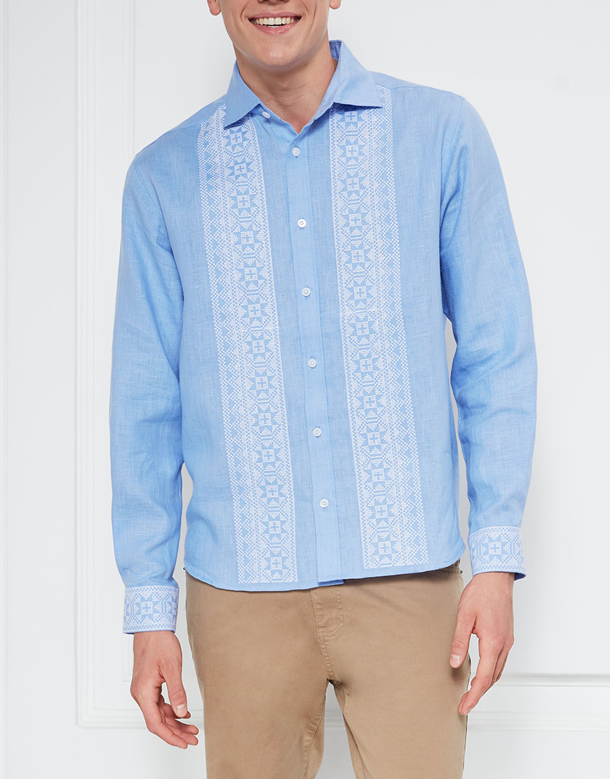 Доставка протягом 3-10 робочих днівПрикрашена вишивкою геометричним орнаментом білого кольору. Відкладний комір на стійці. Ґудзики по всій довжині і на манжетах виробу.