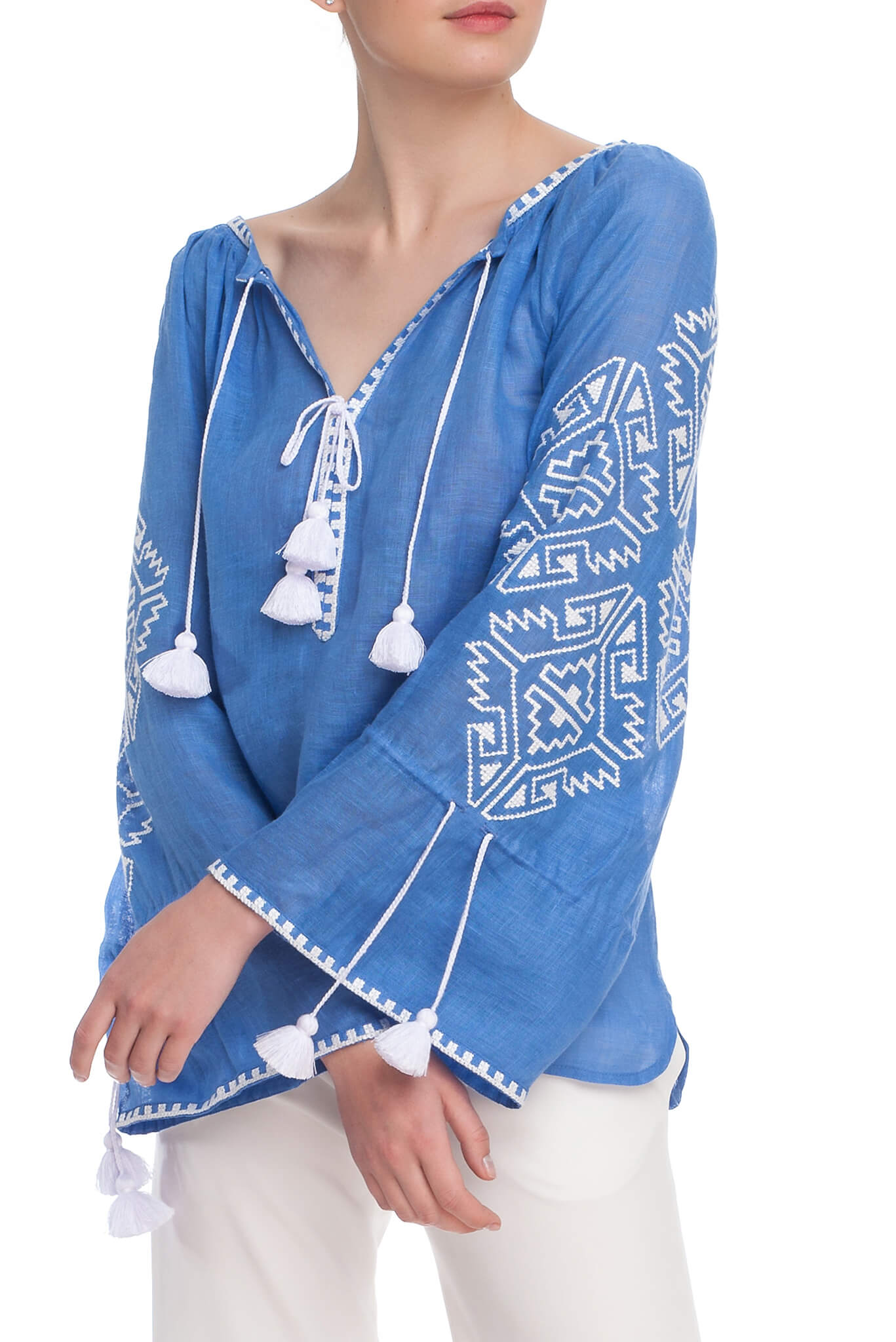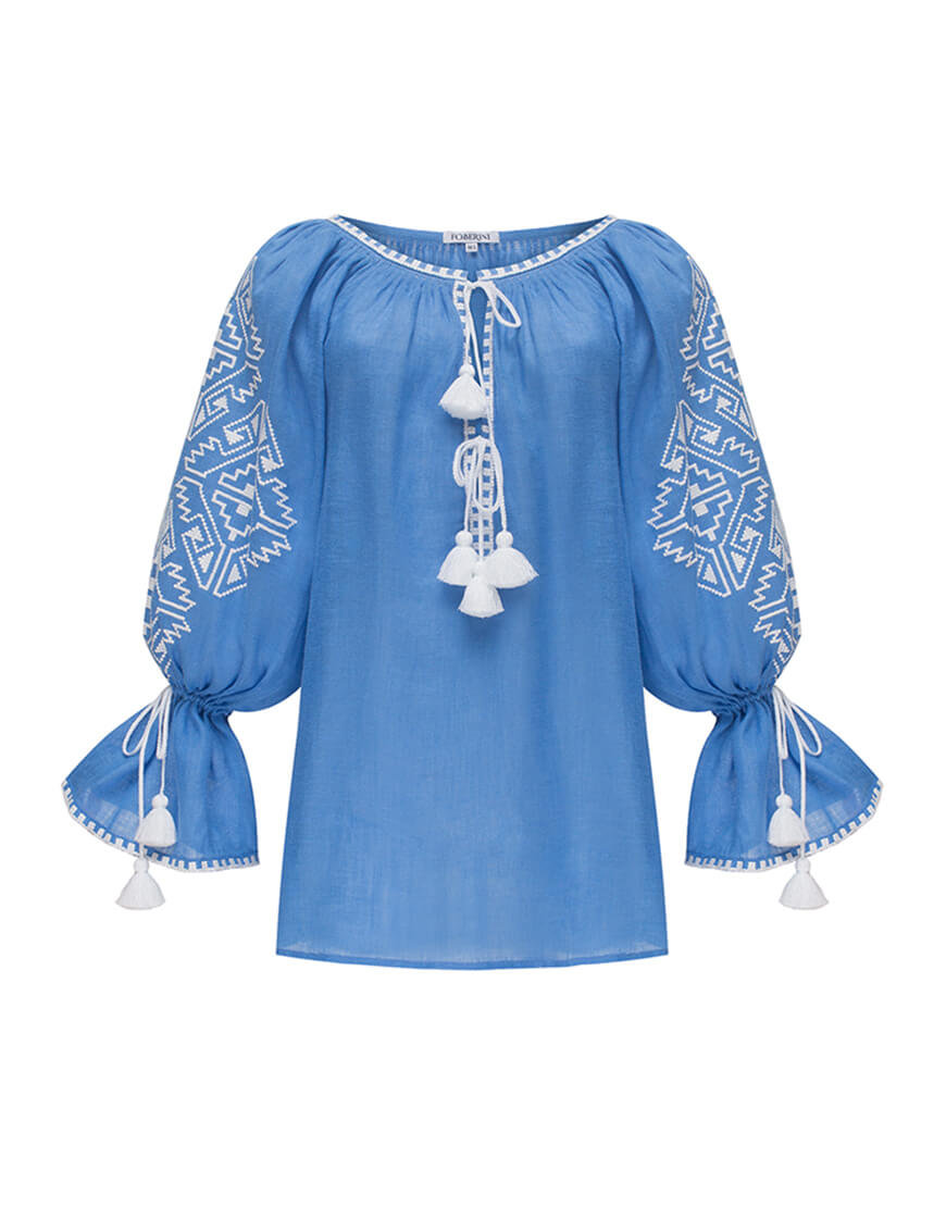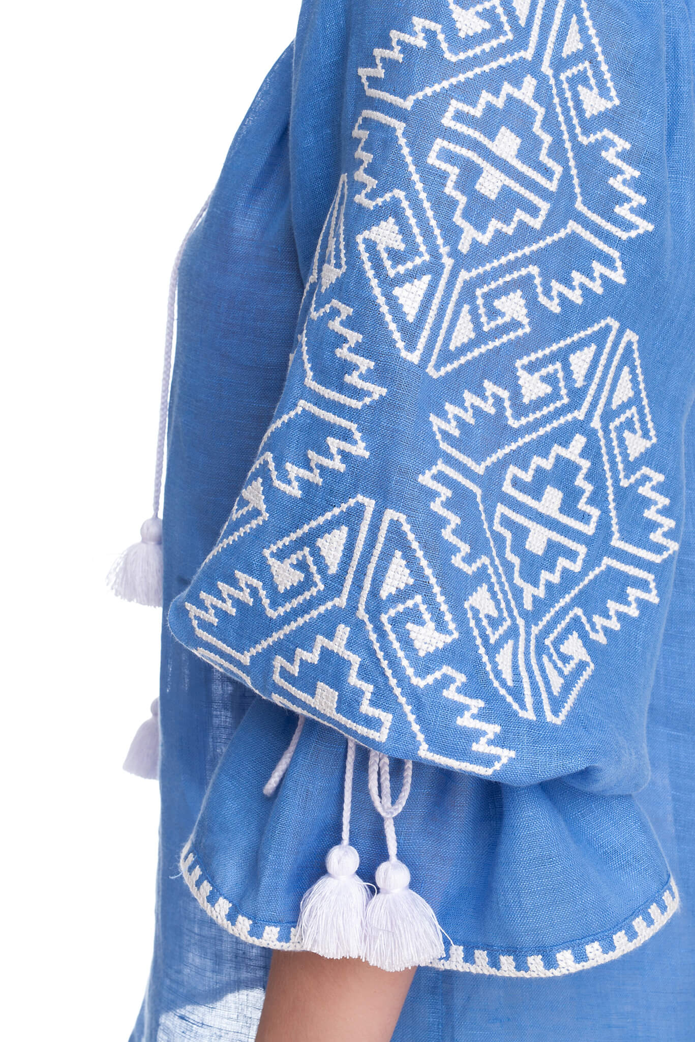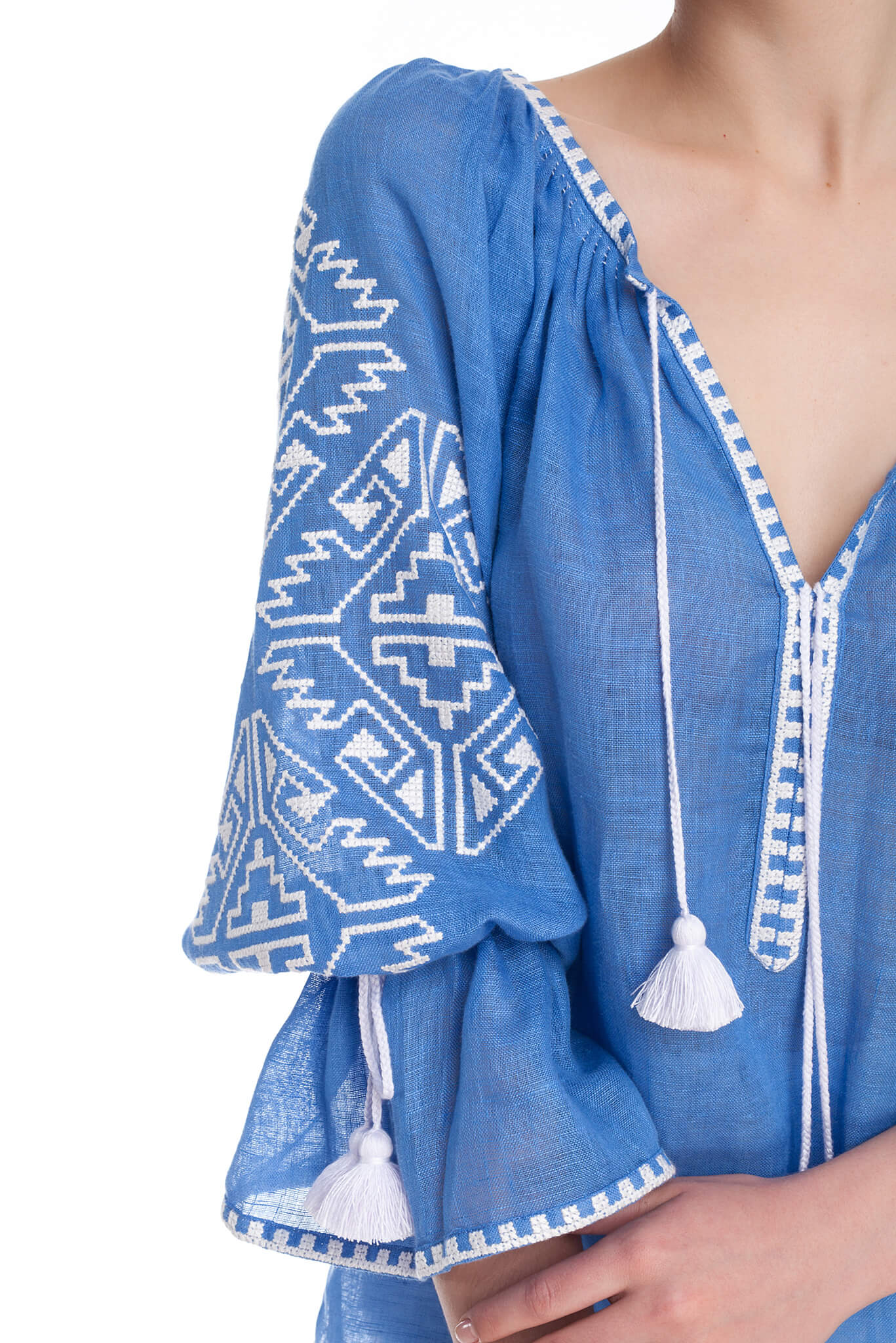 Прикрашена вишивкою геометричним орнаментом білого кольору на рукавах і декольте. Глибокий виріз і широкі рукава прямого крою доповнені кититцями в тон вишивки. Геометричний орнамент, ніжне забарвлення і елементи ручних робіт стануть родзинкою Вашого елегантного наряду.
