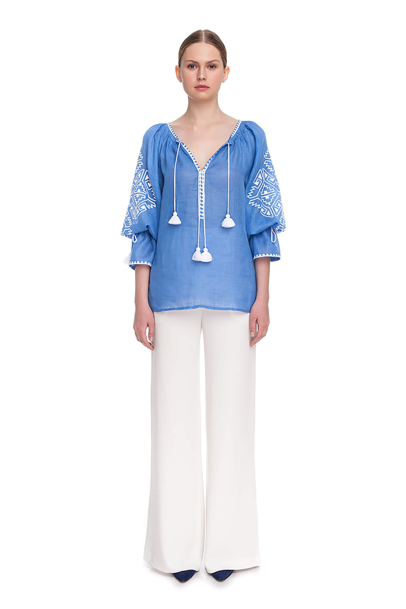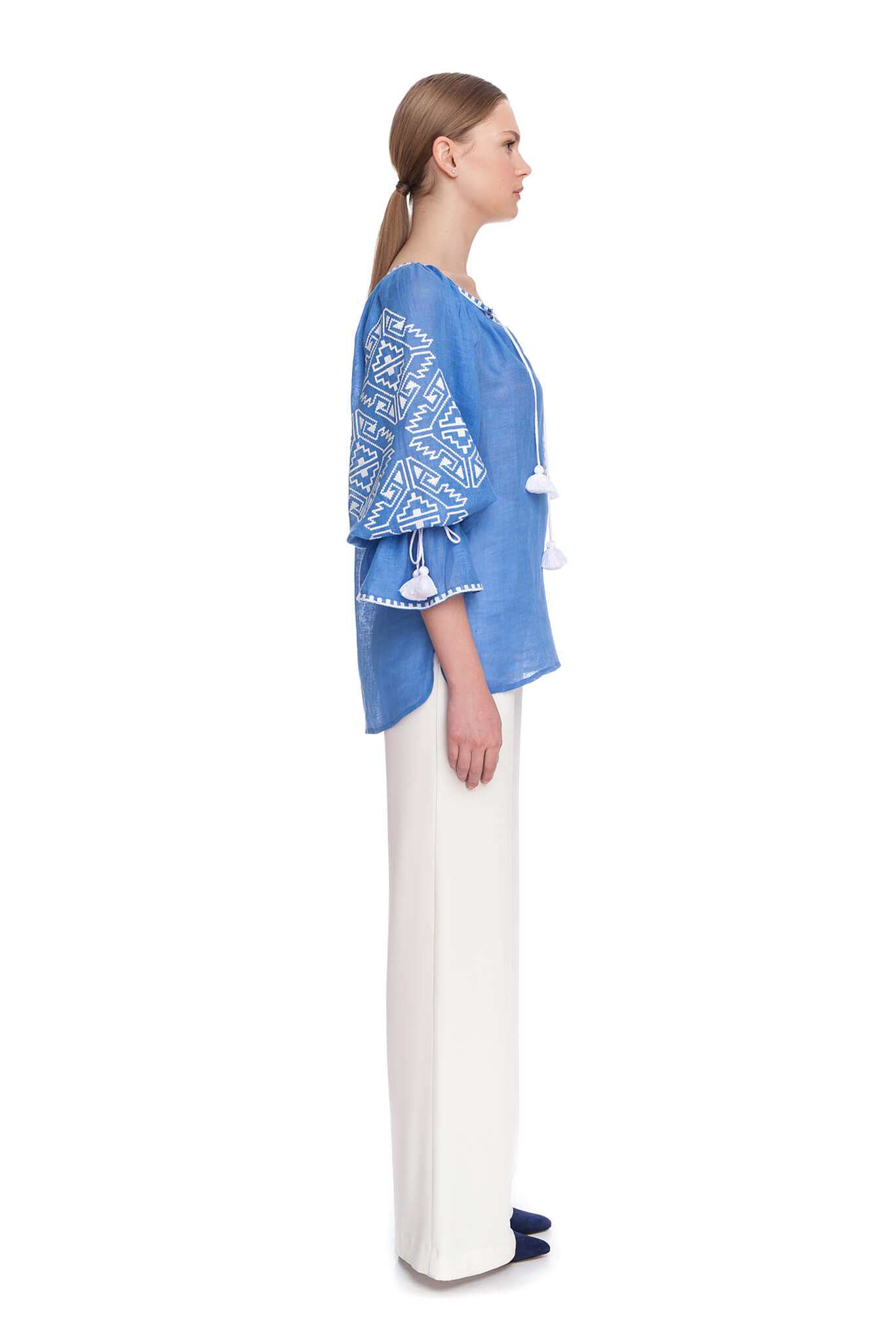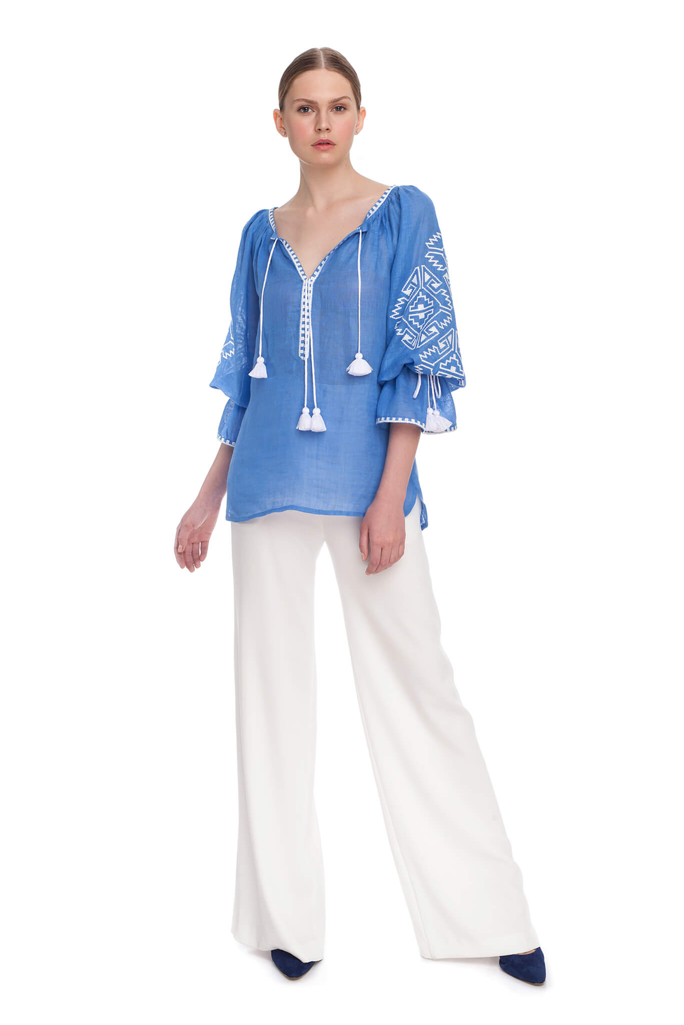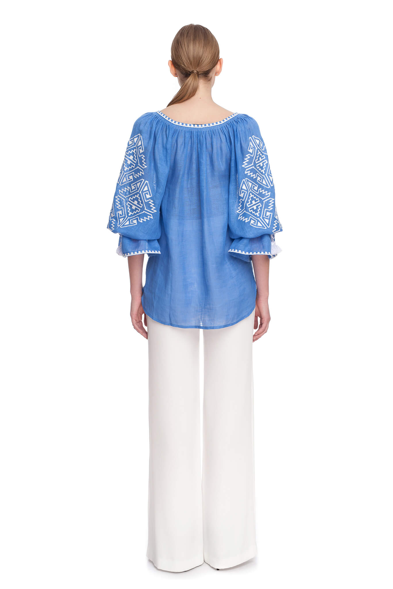 Прикрашена вишивкою геометричним орнаментом білого кольору на рукавах і декольте. Глибокий виріз і широкі рукава прямого крою доповнені кититцями в тон вишивки. Геометричний орнамент, ніжне забарвлення і елементи ручних робіт стануть родзинкою Вашого елегантного наряду.