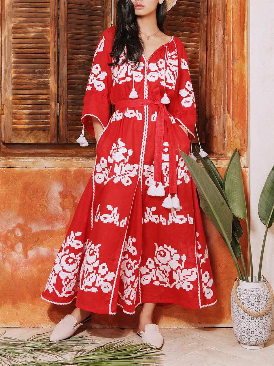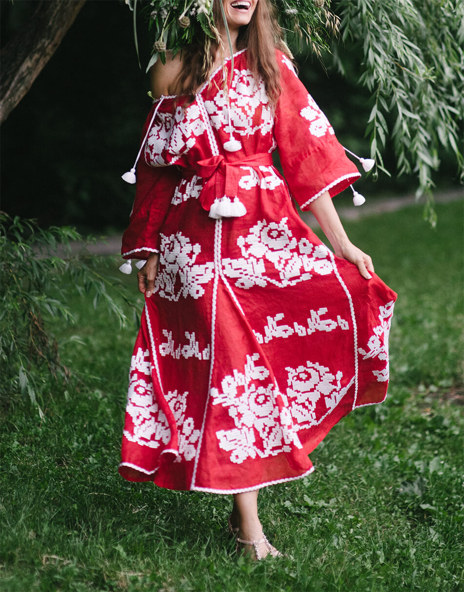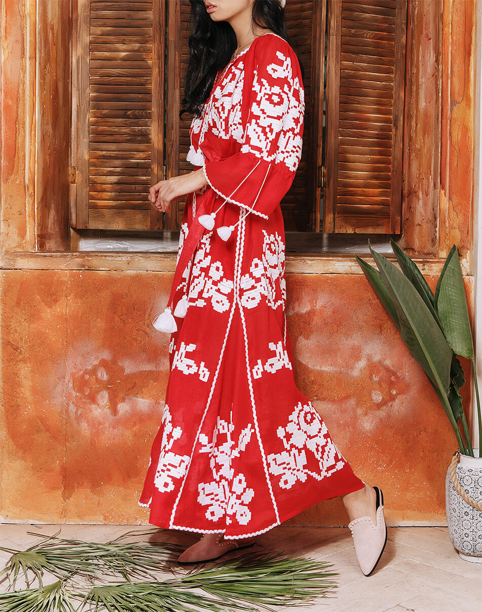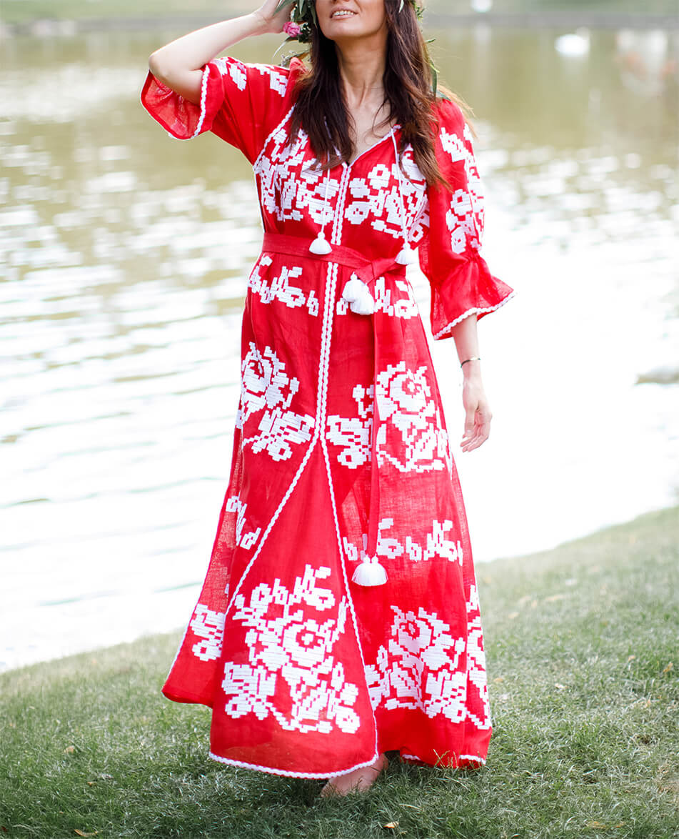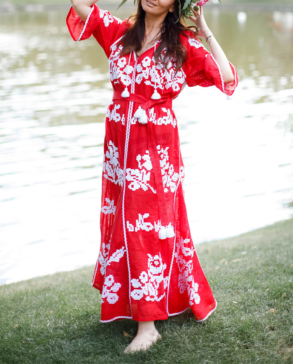 Доставка протягом 2-14 робочих днівДизайнерська сукня-вишиванка «Червоне море» довга «максі». Горловина прикрашена зав’язками з кісточками. Виконана з високоякісного 100% льону. Вишивка виконана гладдю білими нитками по тканині насиченого червоного кольору. Рукава прямого крою можна носити як у вільному вигляді, так і затягнутими на зав’язки з бахромою. Кишені у бокових швах. У комплекті до сукні – пояс з кісточками. Символіка вишивки: У візерунку використано елементи вишивки новобасанського рушника Чернігівської області. Головним символом вишивки є троянда – символ чистоти, любові, краси та милосердя. Білий колір – джерело чистоти, непорочності, святості. Червоний – колір пристрасті, кохання та вогню. Переваги: Автентична вишивка Чернігівської області. Деталі: Сукня довга «максі» з автентичною вишивкою гладдю. Пояс з кісточками.