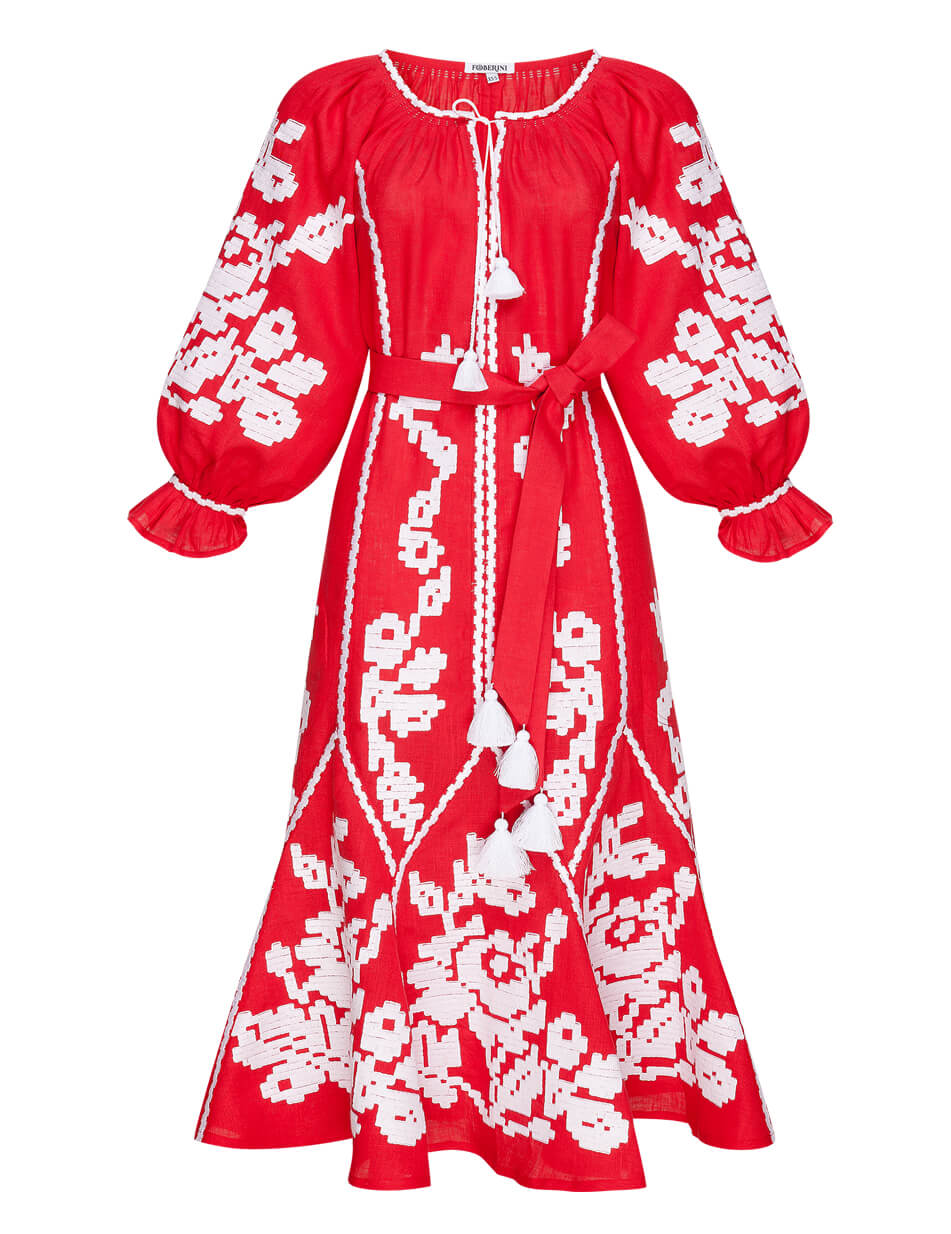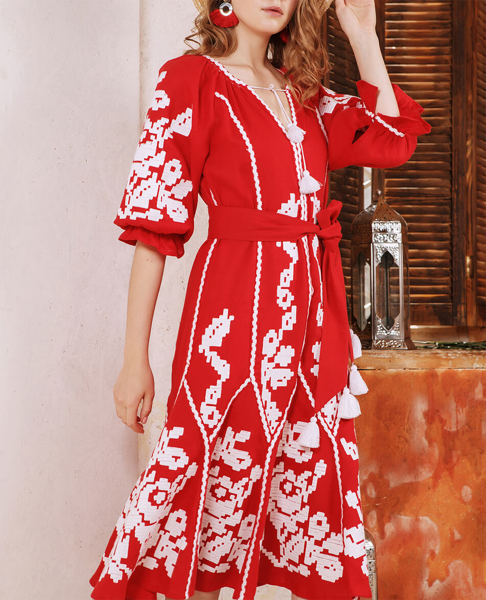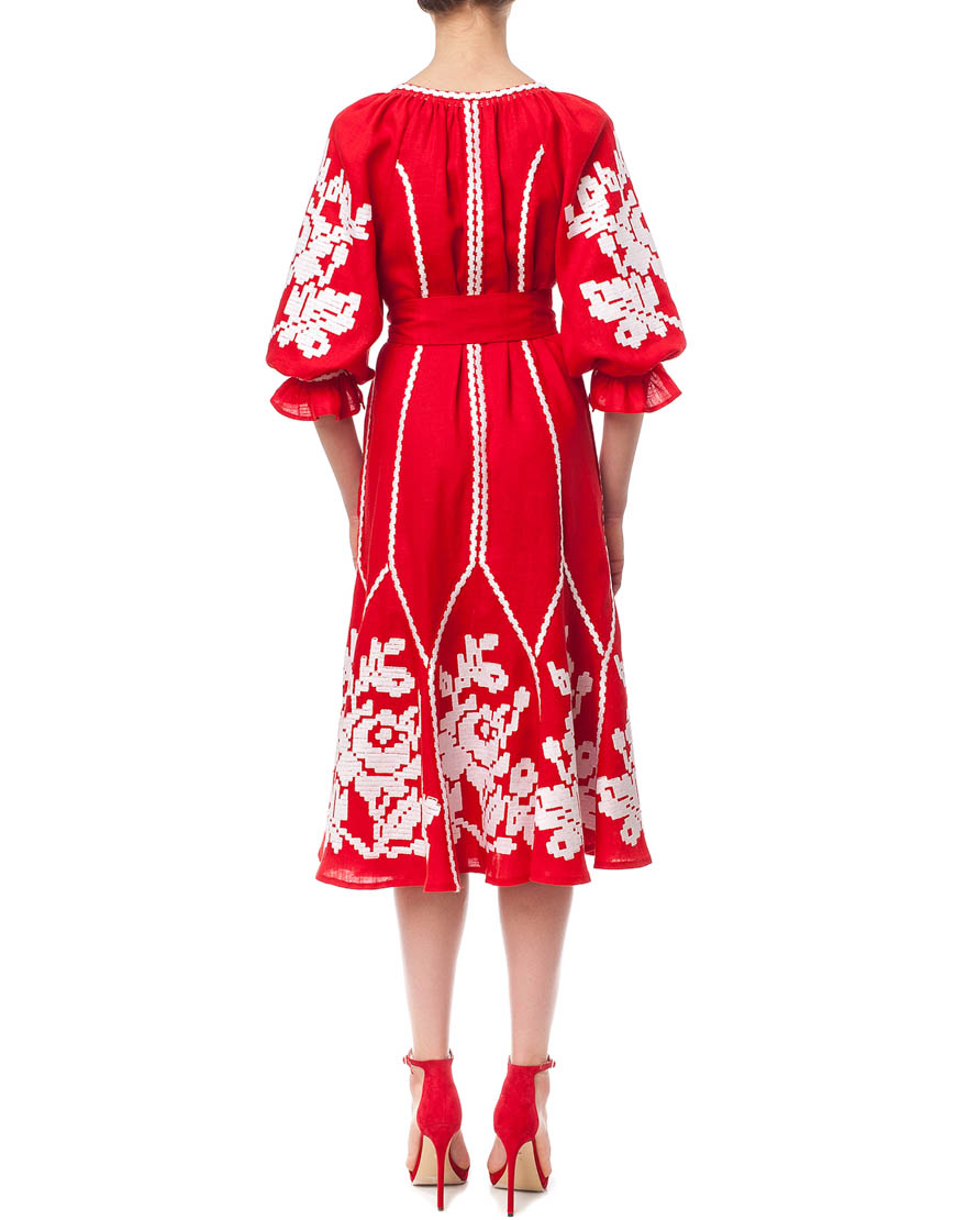 Доставка протягом 2-14 робочих днівДизайнерська сукня-вишиванка «Марічка» довжина «міді». Горловина прикрашена зав’язками з кісточками. Зроблена з високоякісного 100% льону. Вишивка виконана гладдю білими нитками по тканині червоного кольору. Манжети на рукавах оздоблені рюшами. Кишені у бокових швах. У комплекті до сукні – пояс з кісточками. Символіка вишивки: У візерунку використано елементи вишивки новобасанського рушника Чернігівської області. Головним символом вишивки є троянда – символ чистоти, любові, краси та милосердя. Білий колір – джерело чистоти, непорочності, святості. Червоний символ вогню, любові і пристрасті. Переваги: Автентична вишивка Чернігівської області. Деталі: Сукня довжиною «міді» з автентичною вишивкою гладдю. Пояс з кісточками.