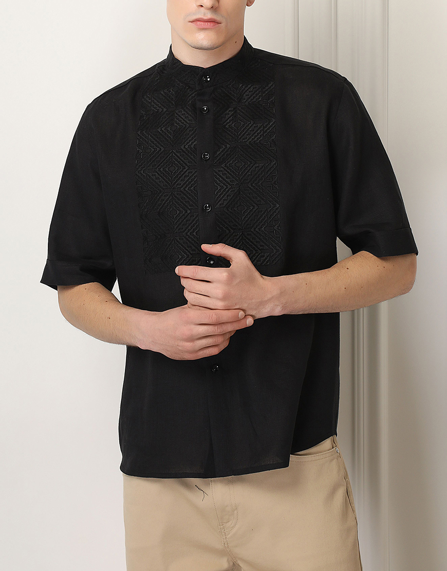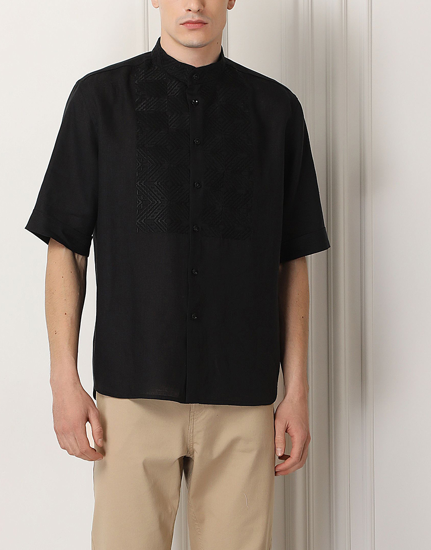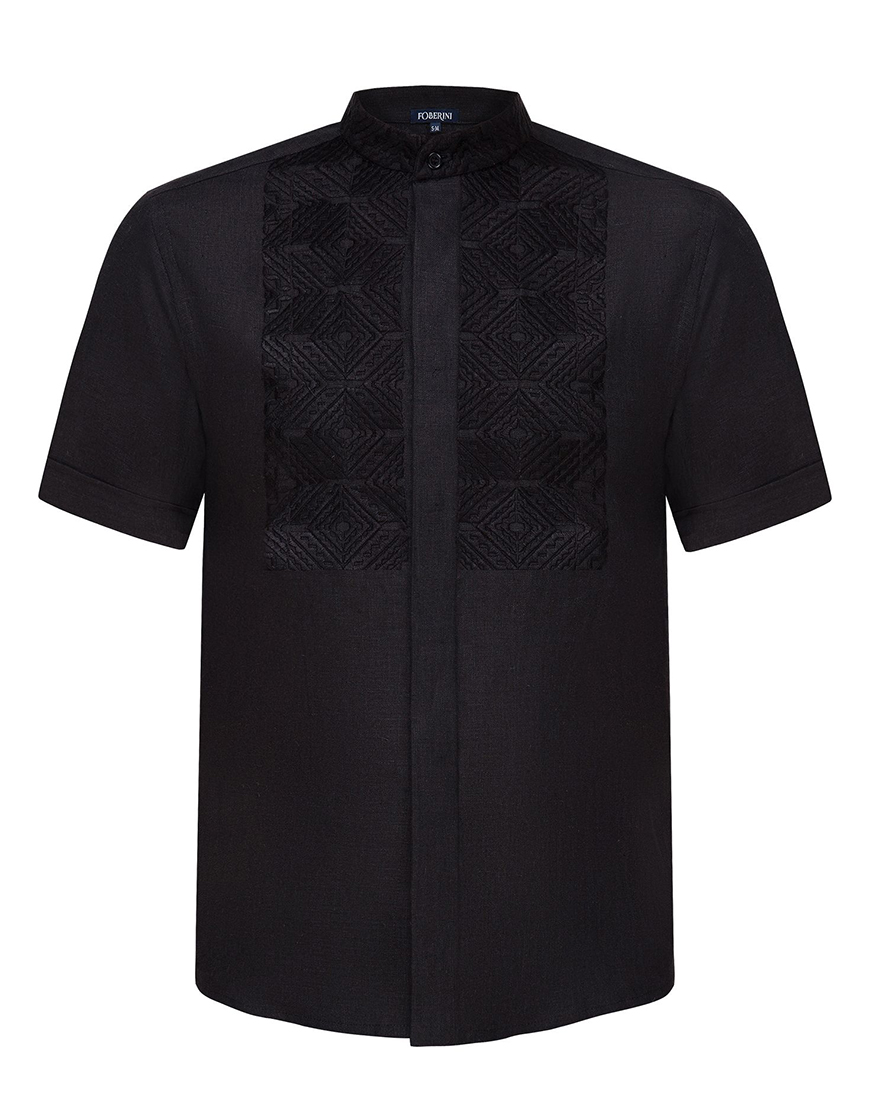 Доставка протягом 3-10 робочих днівВишита автентичним геометричним орнаментом чорного кольору. Ґудзики по всій довжині виробу. Вишитий комір-стійка. Вишивка чорним по чорному і стриманий крій роблять цю сорочку ідеальним варіантом як для офісного дрес-коду, так і для літнього обаза в стилі casual.