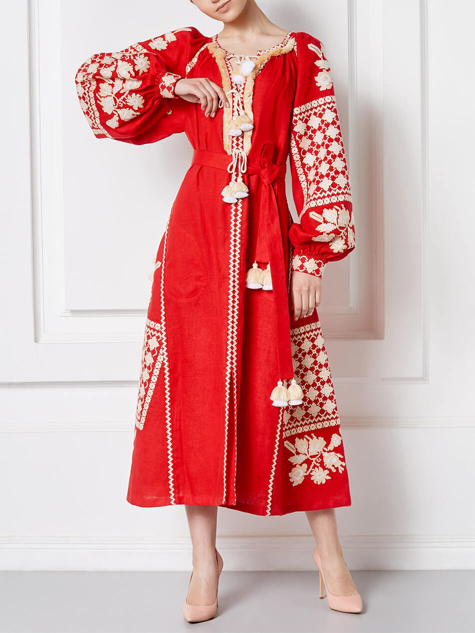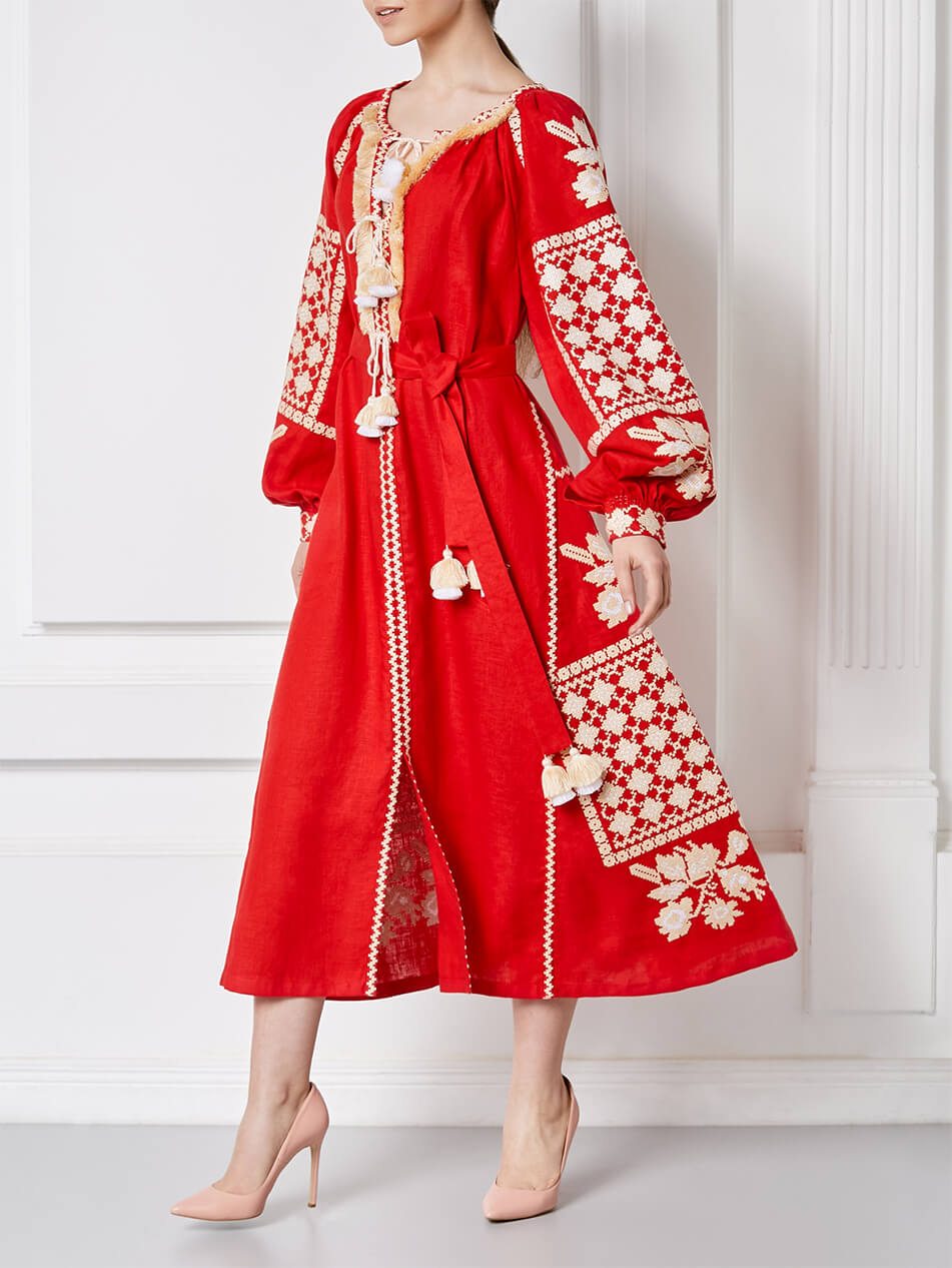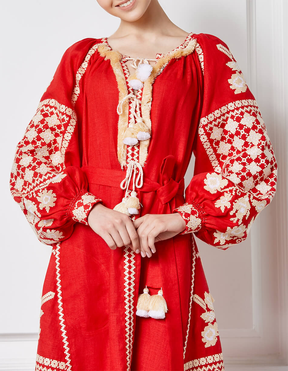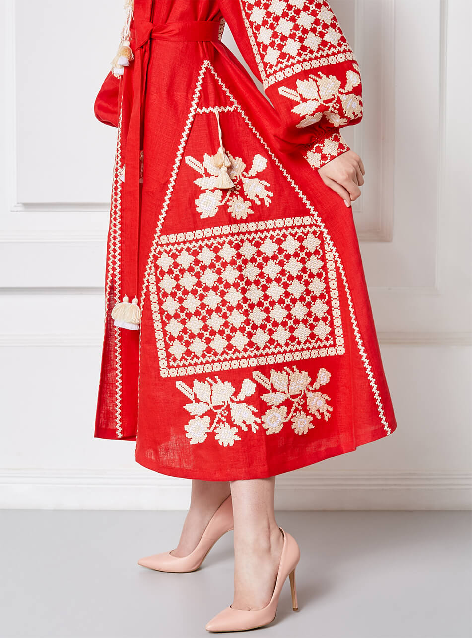 Червона міді-сукня з автентичним біло-золотим хрестиком орнаментом. Виріз декольте прикрашений об’ємною бахромою. Горловина та пояс доповнені двоярусними кісточками у тон вишивки. Манжети оформлені автентичними швами ручної роботи – “збирання”. Поділ сукні рясно оздоблений декорованими клинами. Старовинний орнамент, яскраве поєднання кольорів та елементи ручних робіт роблять цю розкішну сукню ідеальною для будь-яких заходів.