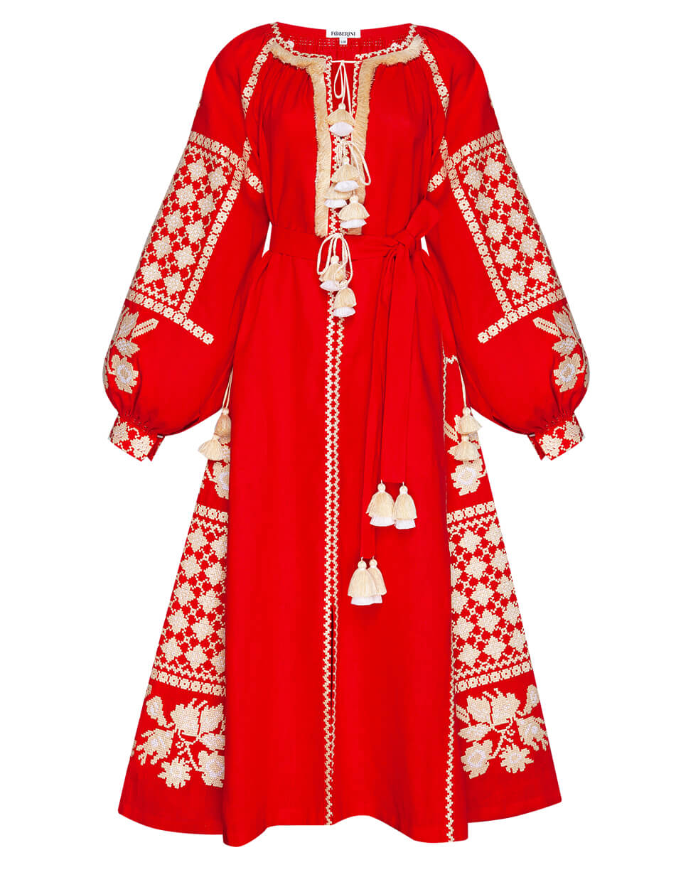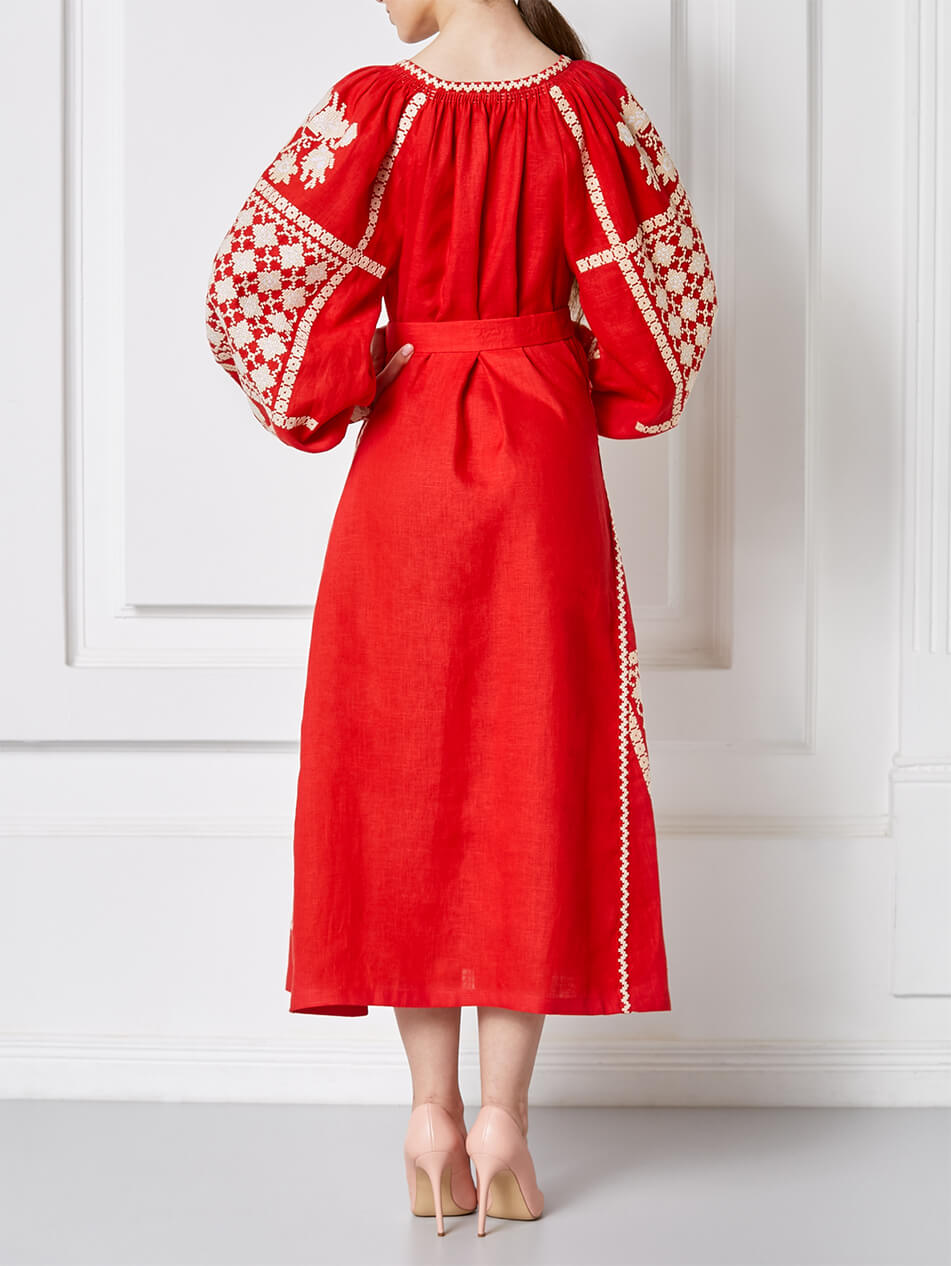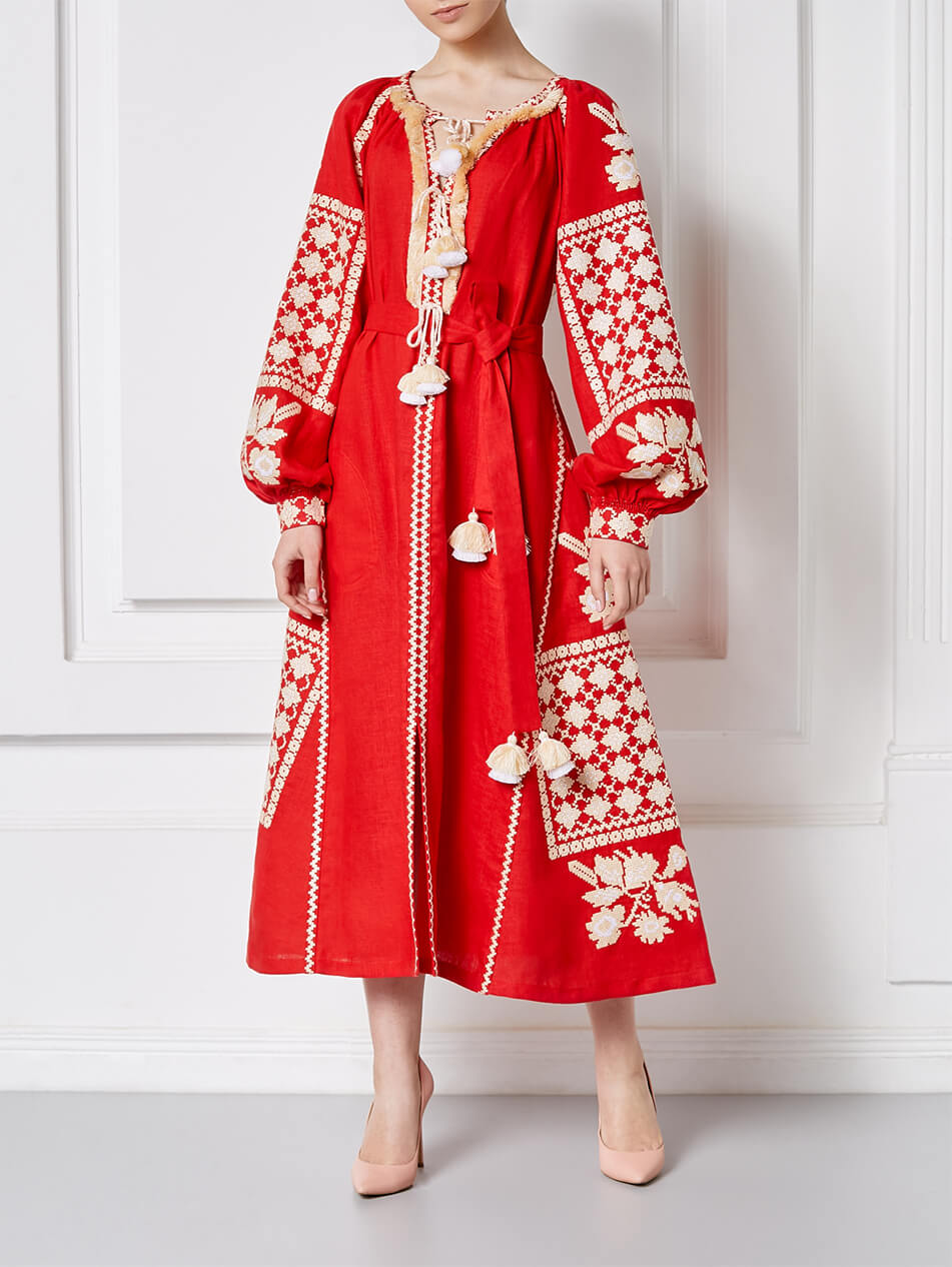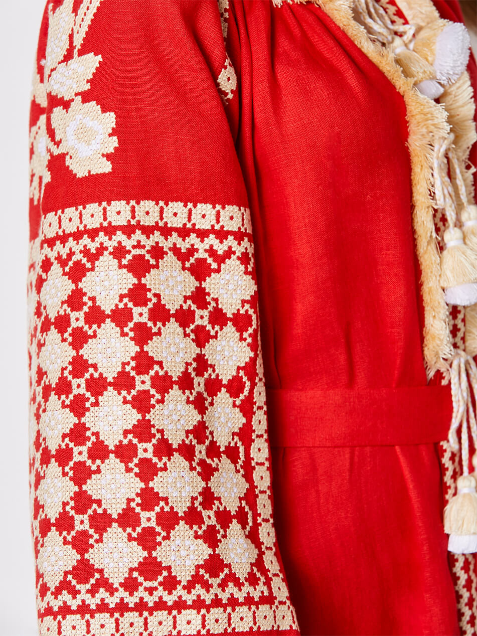 Червона міді-сукня з автентичним біло-золотим хрестиком орнаментом. Виріз декольте прикрашений об’ємною бахромою. Горловина та пояс доповнені двоярусними кісточками у тон вишивки. Манжети оформлені автентичними швами ручної роботи – “збирання”. Поділ сукні рясно оздоблений декорованими клинами. Старовинний орнамент, яскраве поєднання кольорів та елементи ручних робіт роблять цю розкішну сукню ідеальною для будь-яких заходів.
